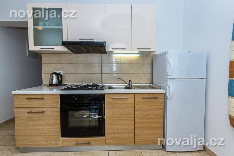 1 ložnice se dvěma lůžky, vybavená kuchyň (lednička, mrazák, trouba, myčka + tablety do myčky, mikrovlnná trouba, varná konvice) s rozkládacím gaučem pro 1-2 osoby, TV+SAT, sociální zařízení se sprchovým koutem a WC, fén, terasa s výhledem na moře. Klimatizace v kuchyni (v ceně). Rozloha 48 m².