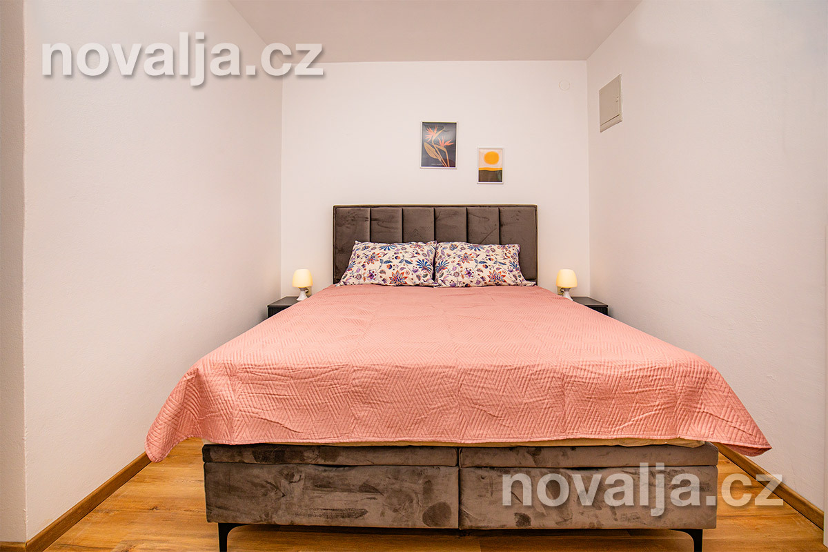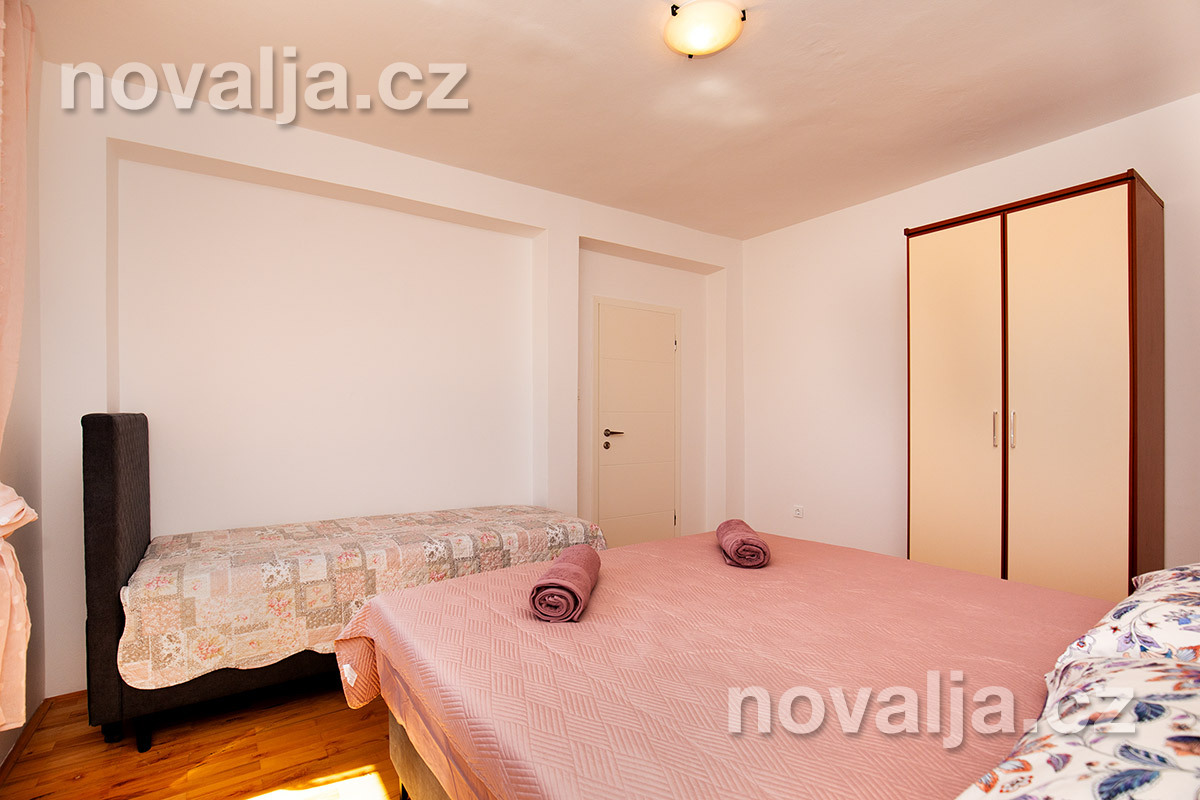 2 ložnice - jedna ložnice se třemi lůžky, druhá ložnice se dvěma lůžky, vybavená kuchyň (lednička, mrazák, trouba, myčka, varná konvice, mikrovlnná trouba), prostorná chodba, sociální zařízení se sprchou, prostorná terasa s plastovým nábytkem, s krásným výhledem na moře. Klimatizace (v ceně).