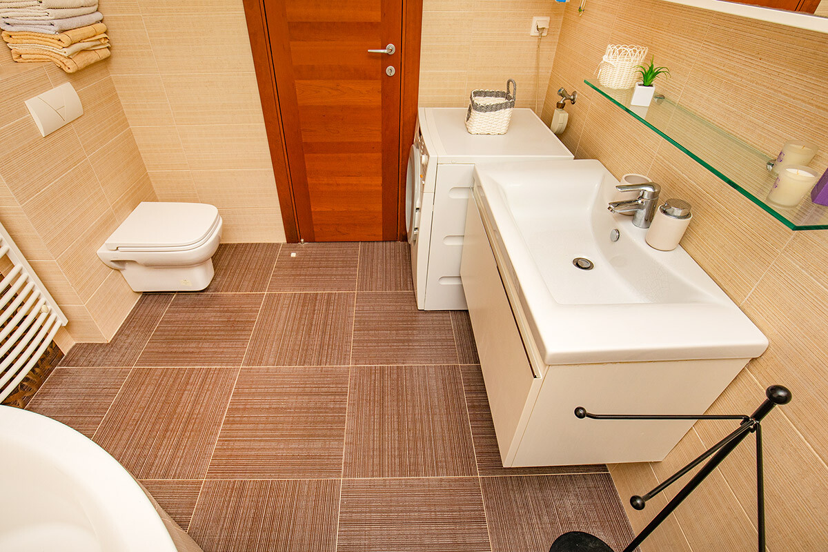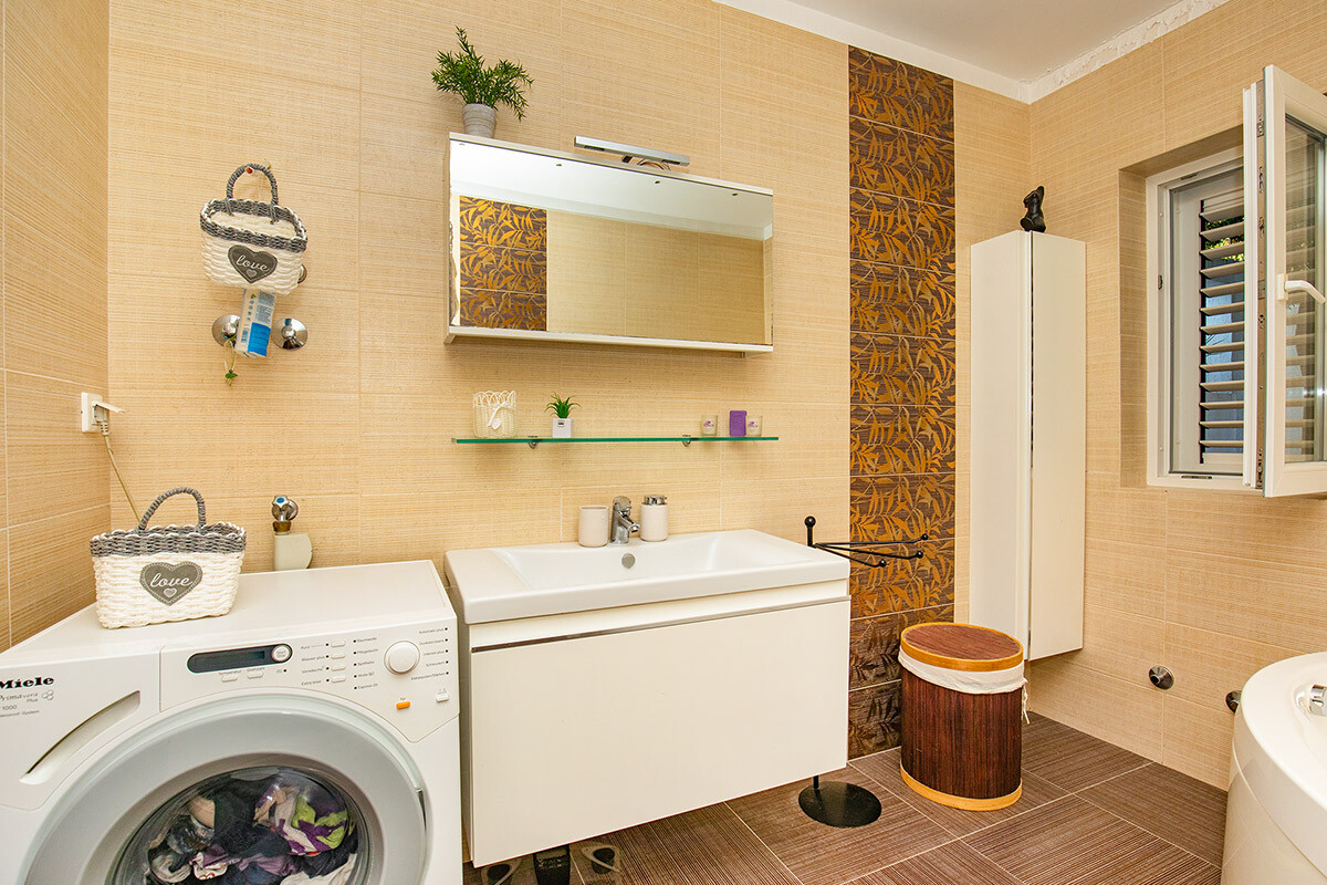 2 ložnice - jedna se dvěma lůžky (délka 200 cm, šířka 160 cm), druhá se třemi lůžky (každé 190 x 80 cm), vybavená kuchyň (lednička, mrazák, trouba, kávovar, varná konvice, myčka), široká chodba, sociální zařízení s vanou a WC, pračka, prostorná terasa s výhledem na moře. Klimatizace (v ceně). V apartmánu je TV, ale lze použít pouze v propojení s vlastním zařízením (bez záruky).