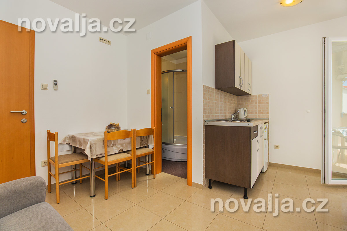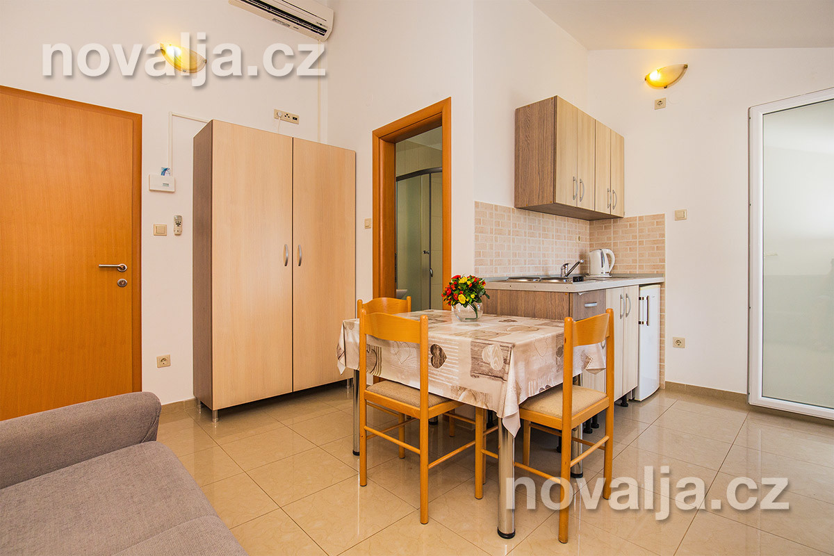 Studio (jedna místnost) s vybaveným kuchyňským koutem (lednička, mikrovlnná trouba, varná konvice) a se dvěma lůžky, sociální zařízení se sprchovým koutem a WC, balkón s částečným výhledem na moře, slunečník. Klimatizace 8 hodin/den v ceně, dále za příplatek 0,50 €/1 hod. (hradí se na místě).