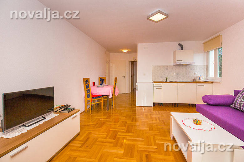 1 ložnice se dvěma lůžky, vybavená kuchyň (lednička, myčka + tablety do myčky, kávovar, mikrovlnná trouba, varná konvice) s rozkládacím gaučem (180 x 200 cm) pro 1-2 osoby (buď 2 děti do 12 let, nebo jen 1 osoba starší 12 let), TV+SAT, sociální zařízení se sprchovým koutem a WC, terasa s částečným výhledem na moře (přes zeleň). Klimatizace (v ceně).