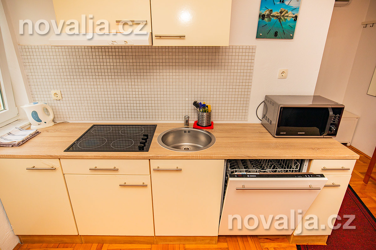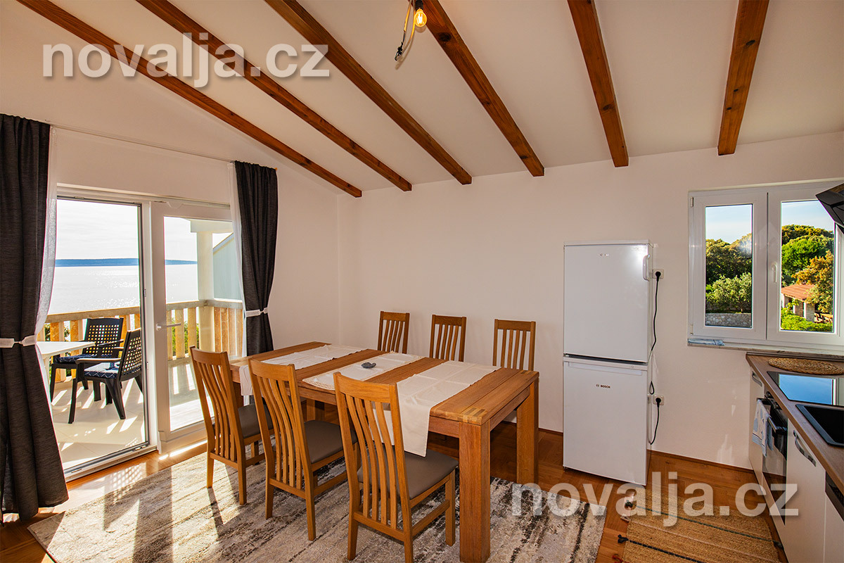 2 ložnice se dvěma lůžky, vybavená kuchyň (lednička, mrazák, trouba, indukční varná deska, myčka + tablety do myčky, mikrovlnná trouba, varná konvice, kávovar, toaster), obývací pokoj, TV+SAT, 2x sociální zařízení se sprchovým koutem a WC, terasa s výhledem na moře. Apartmán má podlahové topení a ohřev vody na solární energii. Klimatizace v chodbě (v ceně).
