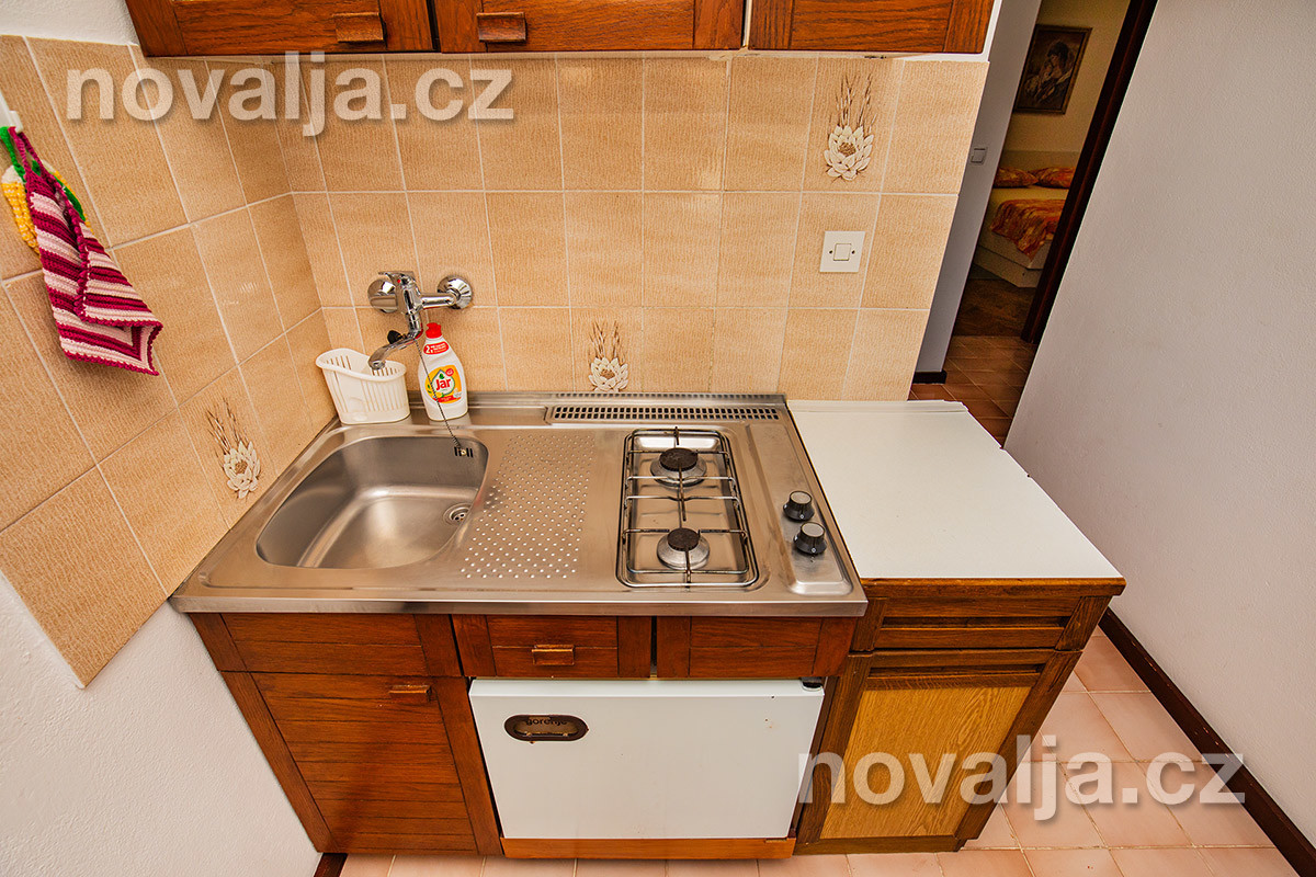 2 ložnice se dvěma lůžky, 1 malý pokoj s jedním lůžkem, vybavená kuchyň (lednička, mrazák, mikrovlnná trouba, varná konvice, toustovač, kávovar), TV+SAT, sociální zařízení se sprchovým koutem a WC, fén, terasa s výhledem na moře. Klimatizace v kuchyni (v ceně).
