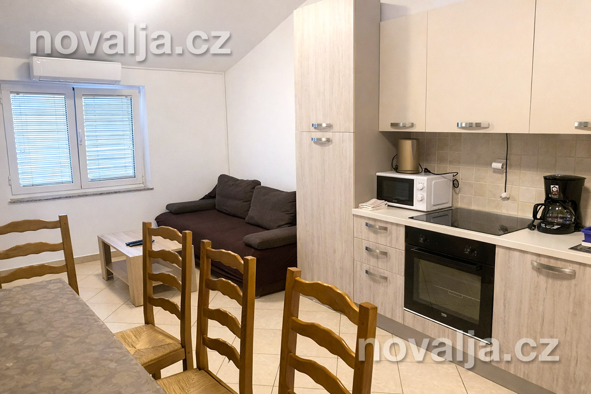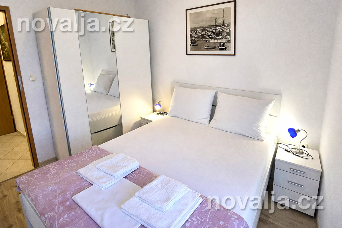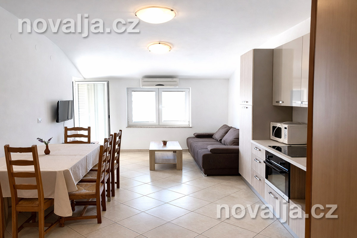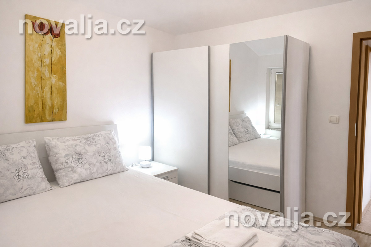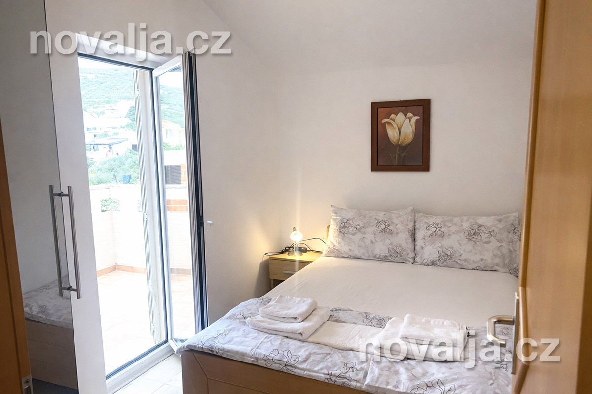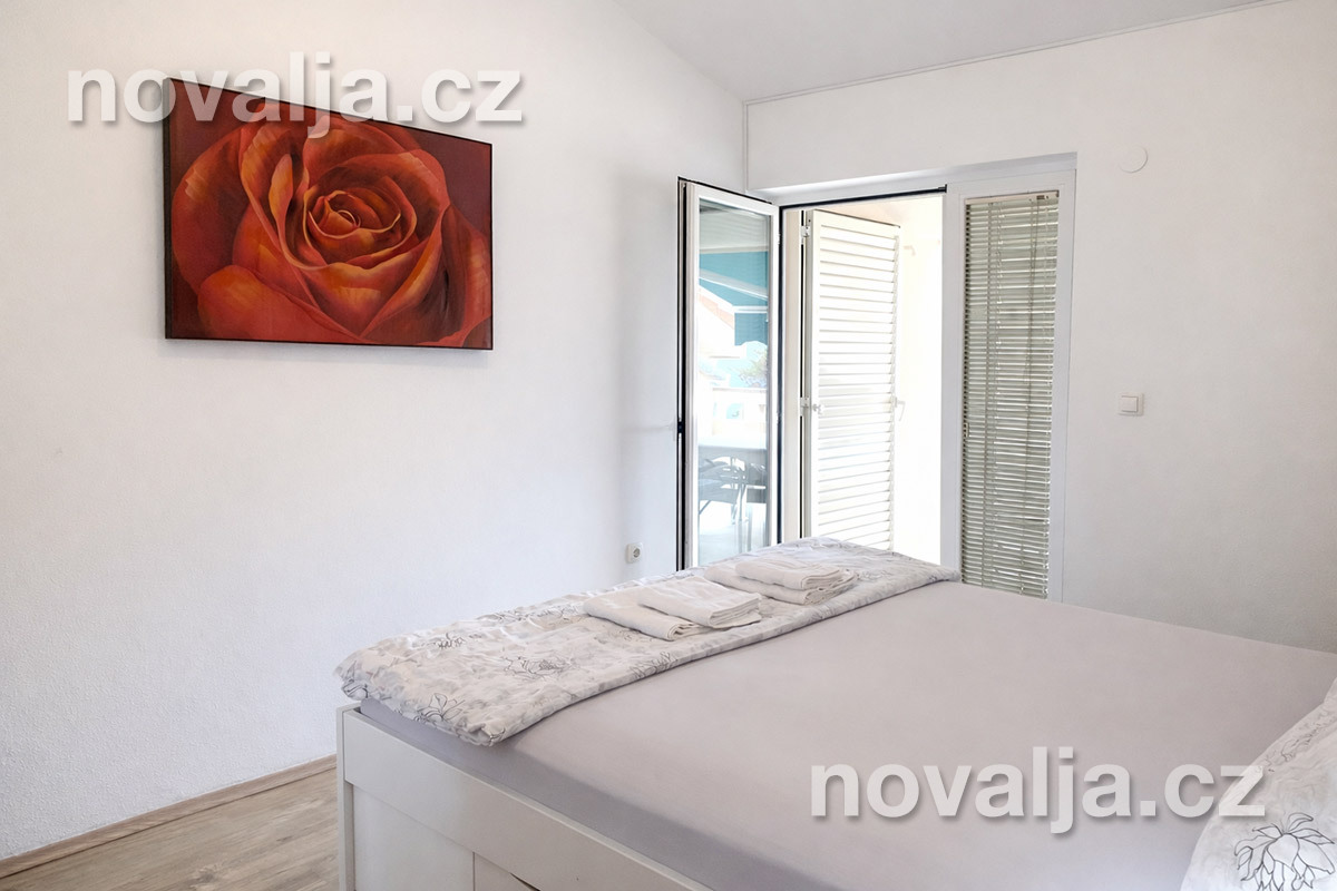 2 ložnice se dvěma lůžky (v jedné ložnici postel 200 x 160 cm, v druhé ložnici francouzská postel 200 x 140 cm), vybavená kuchyň (indukční varná deska, lednička, mrazák, myčka, trouba, mikrovlnná trouba, varná konvice, kávovar, toaster), sociální zařízení se sprchovým koutem a WC, fén, TV+SAT, 2x terasa (1x s výhledem na moře). Klimatizace v kuchyni (v ceně).