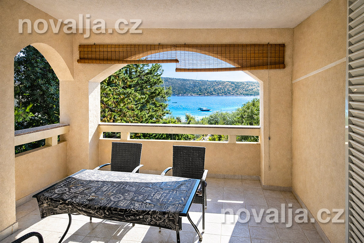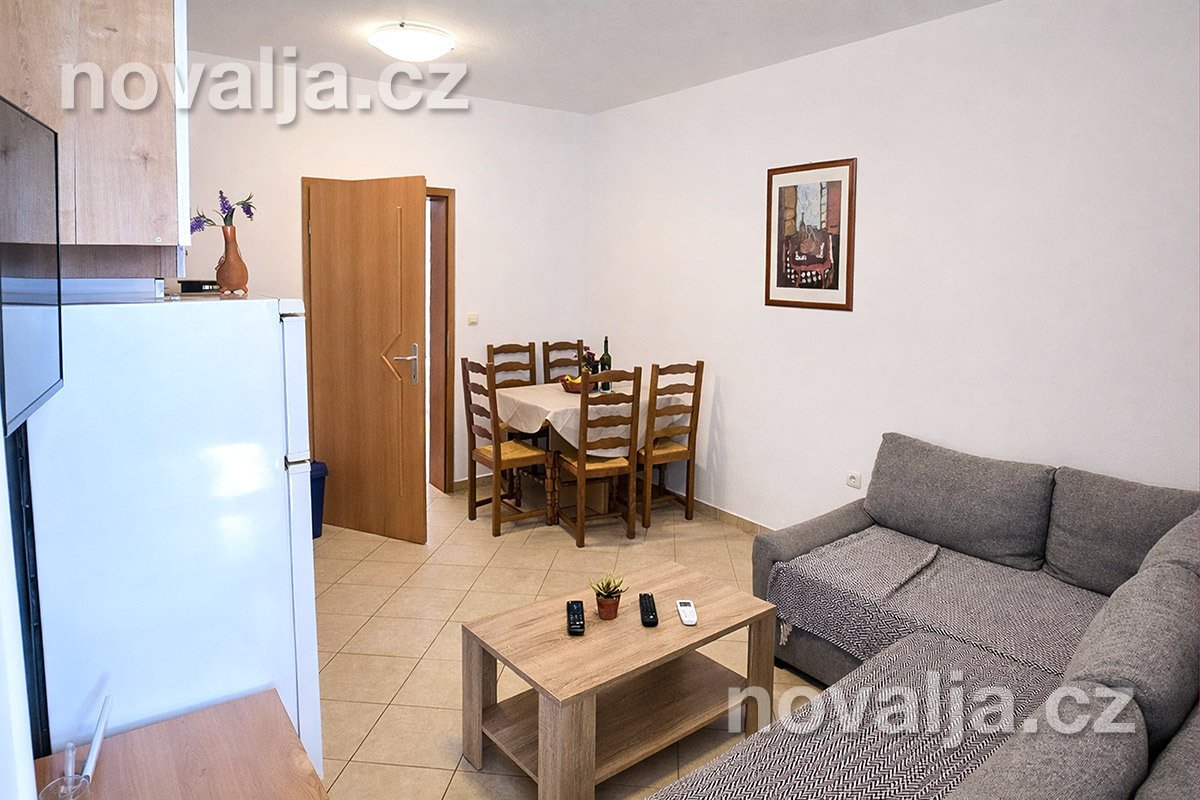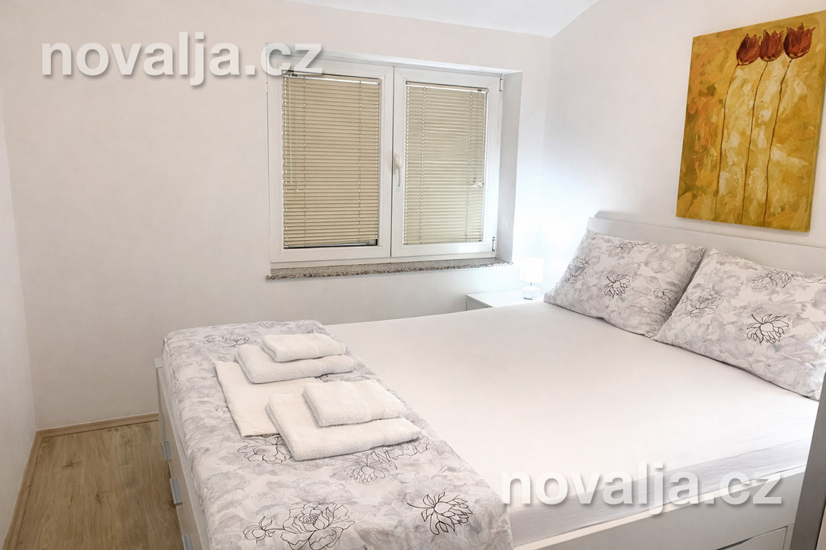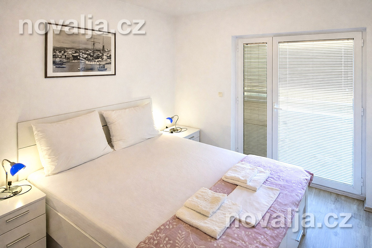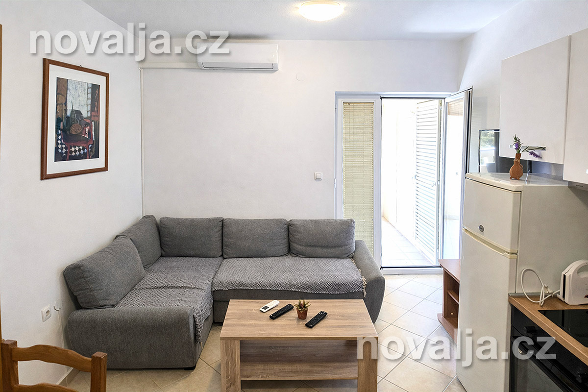 2 ložnice se dvěma lůžky (v jedné ložnici postel 200 x 160 cm, v druhé ložnici francouzská postel 200 x 140 cm), vybavená kuchyň (indukční varná deska, lednička, mrazák, myčka, trouba, mikrovlnná trouba, varná konvice, kávovar, toaster), sociální zařízení se sprchovým koutem a WC, fén, TV+SAT, 2x terasa (1x s výhledem na moře). Klimatizace v kuchyni (v ceně).