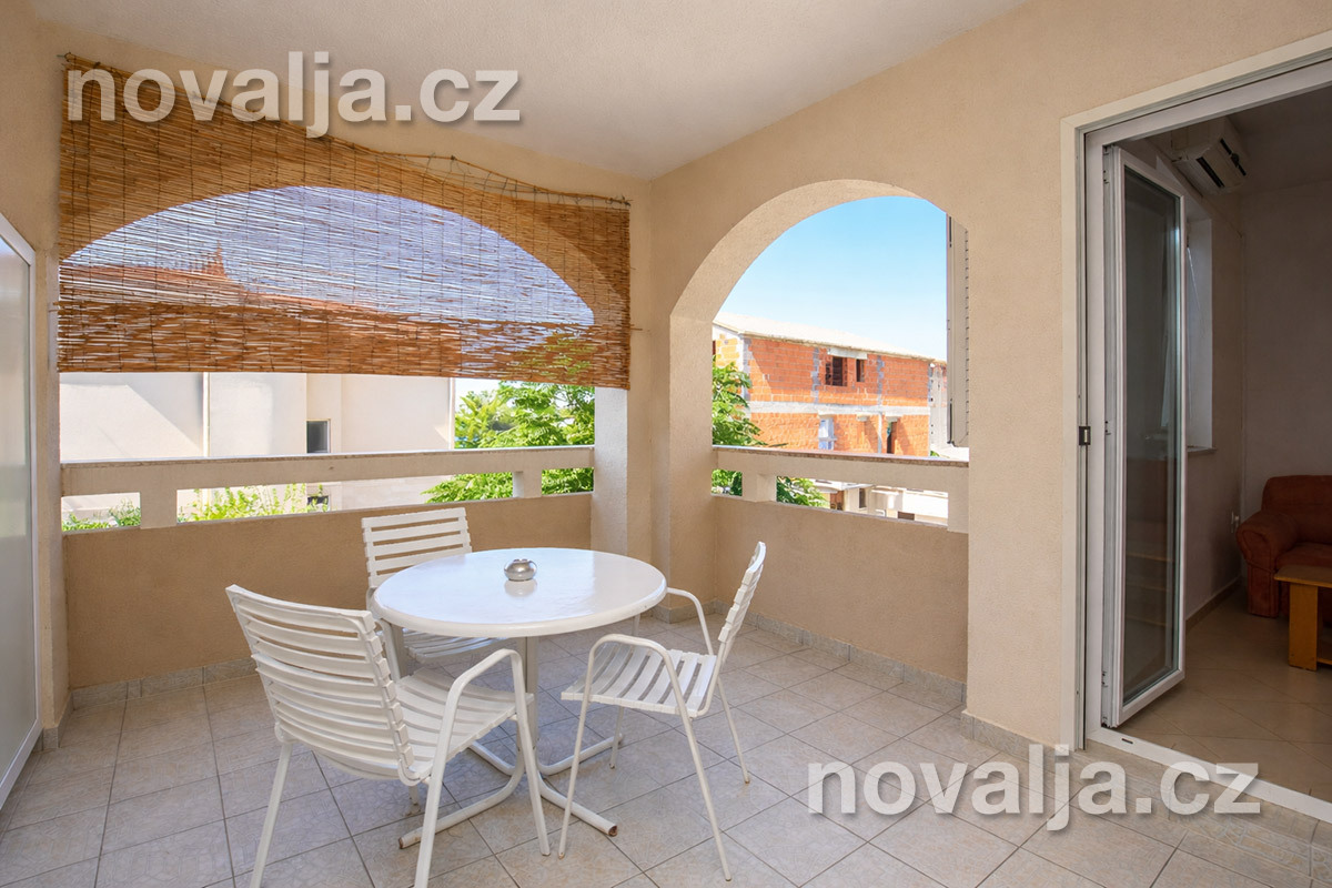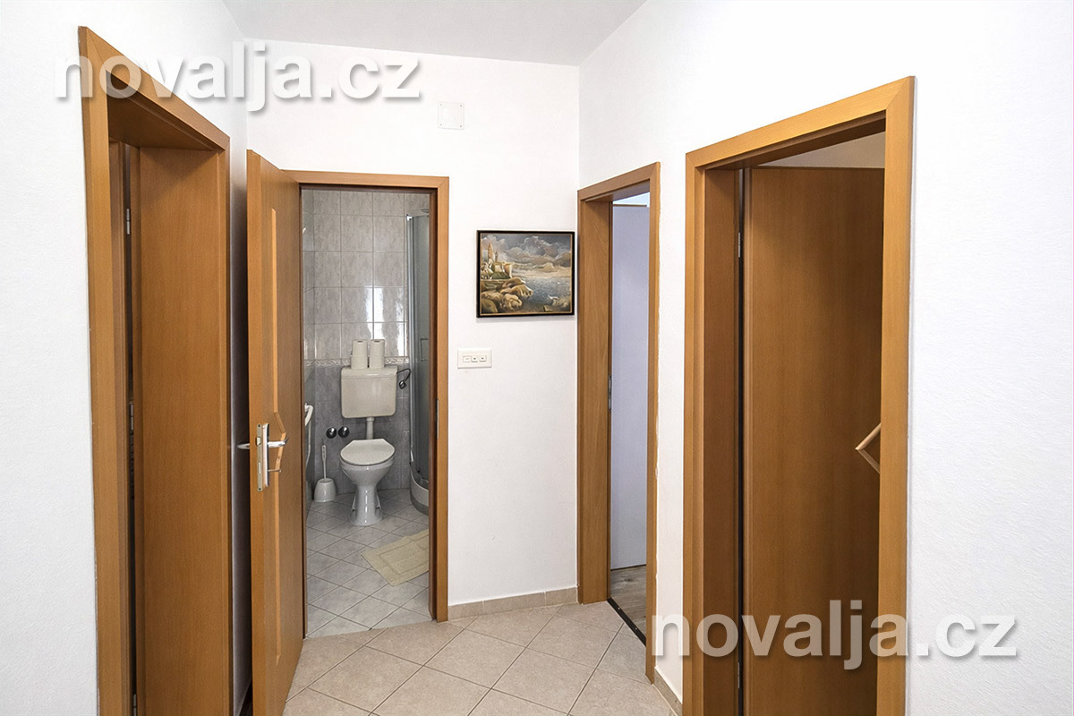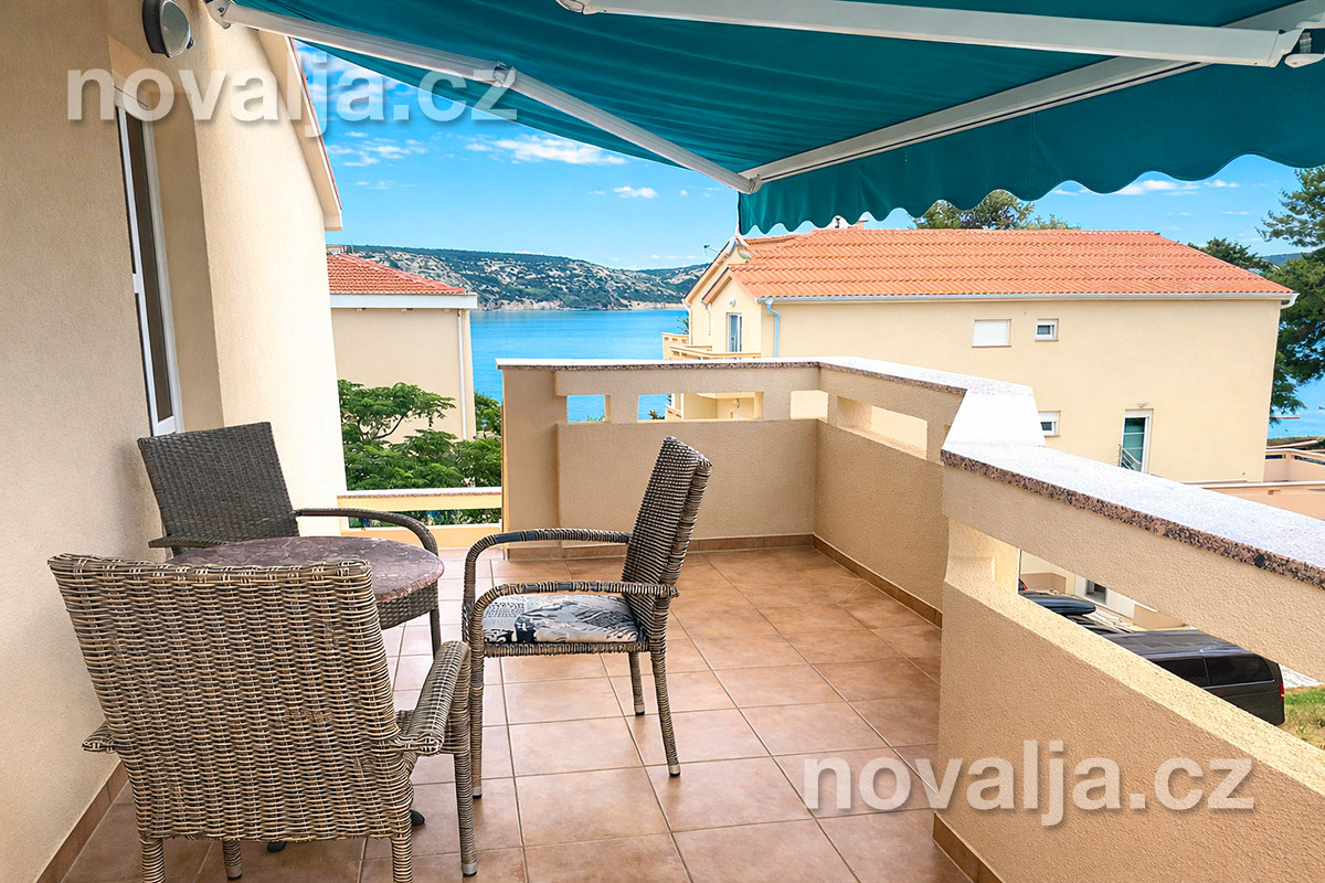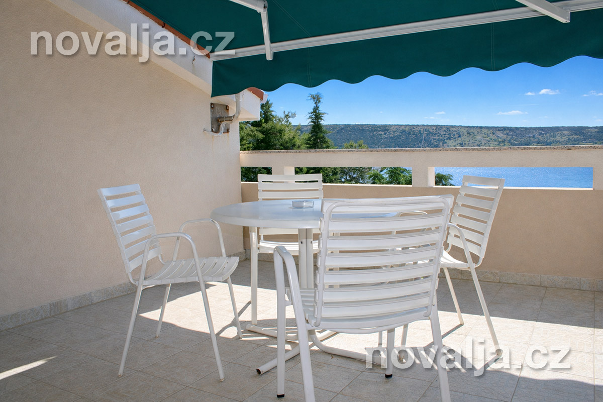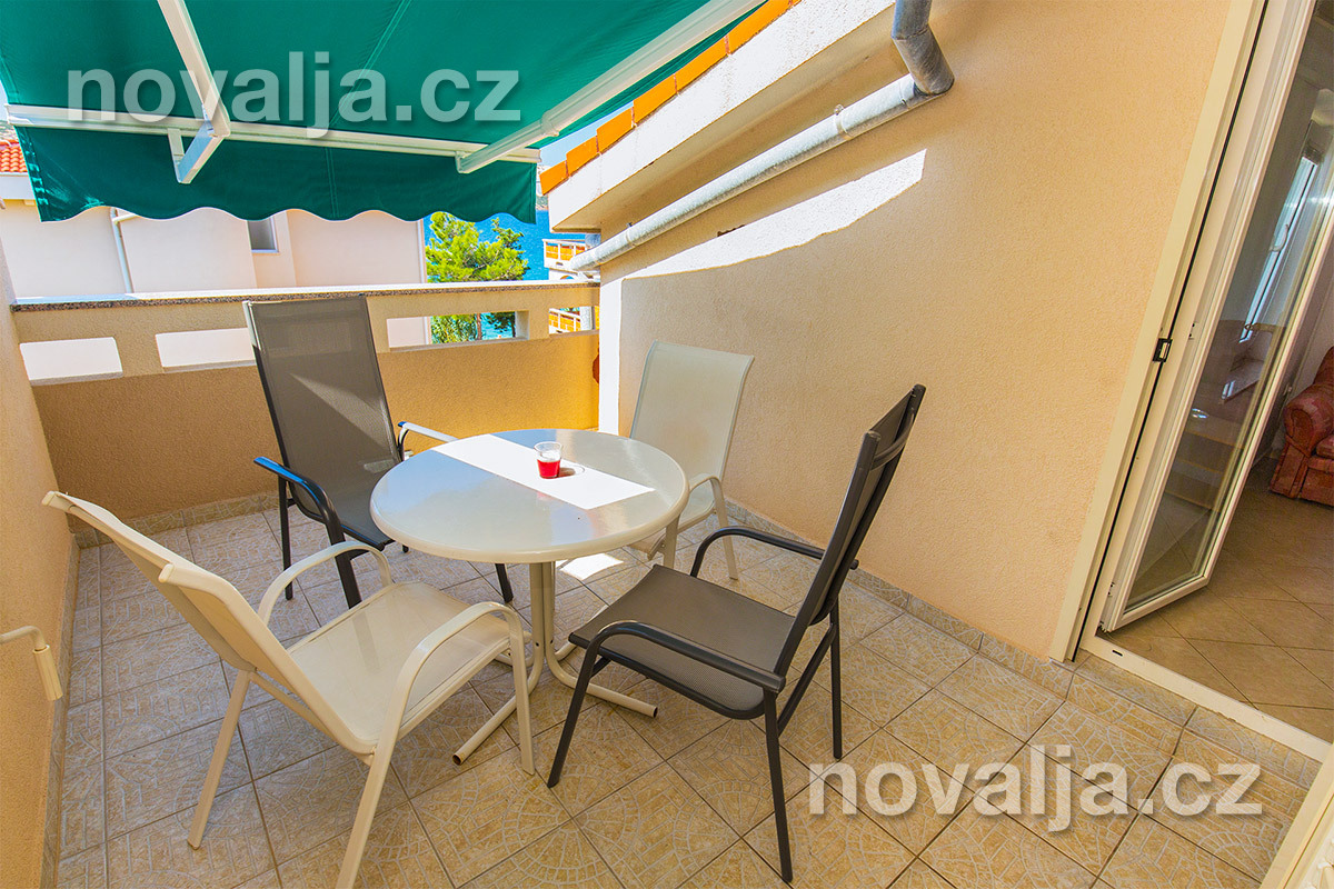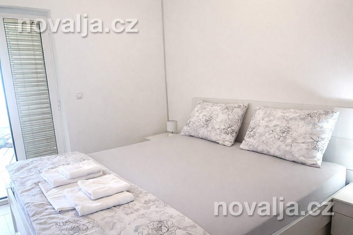 2 ložnice se dvěma lůžky (v jedné ložnici postel 200 x 160 cm, v druhé ložnici francouzská postel 200 x 140 cm), vybavená kuchyň (indukční varná deska, lednička, mrazák, myčka, trouba, mikrovlnná trouba, varná konvice, kávovar, toaster), sociální zařízení se sprchovým koutem a WC, fén, TV+SAT, 2x terasa (1x s výhledem na moře). Klimatizace v kuchyni (v ceně).