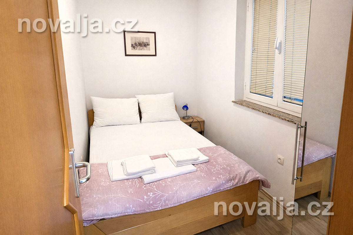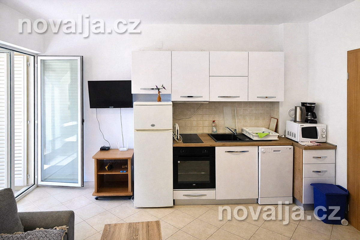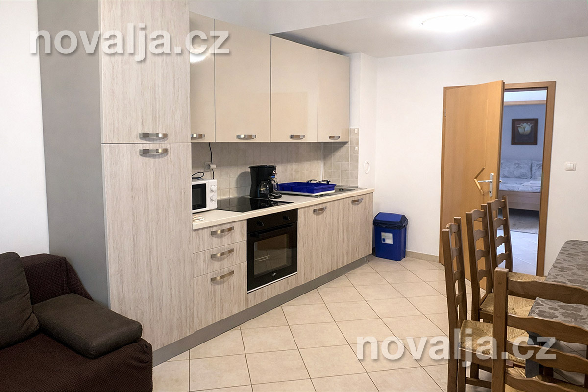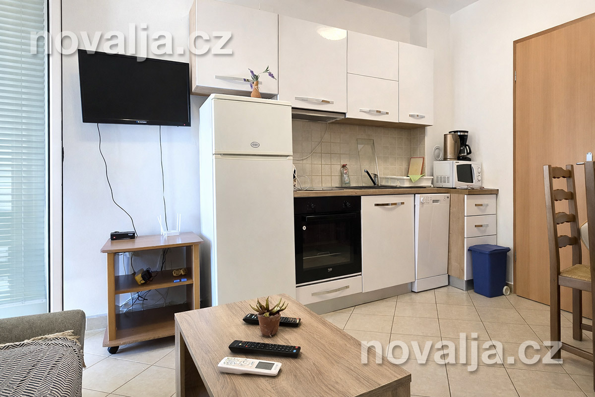 2 ložnice se dvěma lůžky (v jedné ložnici postel 200 x 160 cm, v druhé ložnici francouzská postel 200 x 140 cm), vybavená kuchyň (indukční varná deska, lednička, mrazák, myčka, trouba, mikrovlnná trouba, varná konvice, kávovar, toaster), sociální zařízení se sprchovým koutem a WC, fén, TV+SAT, terasa s částečným výhledem na moře. Klimatizace v kuchyni (v ceně).
