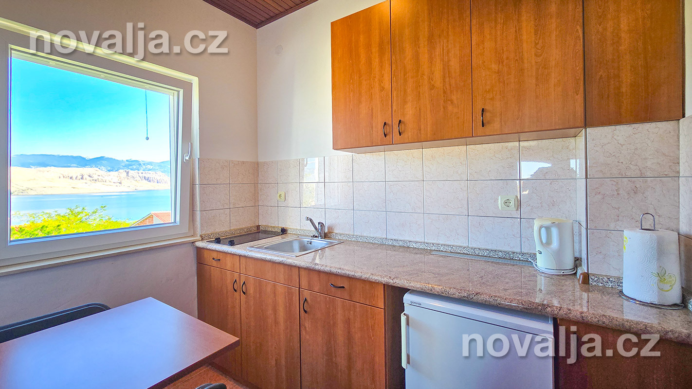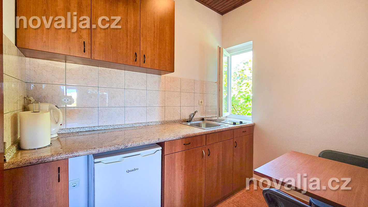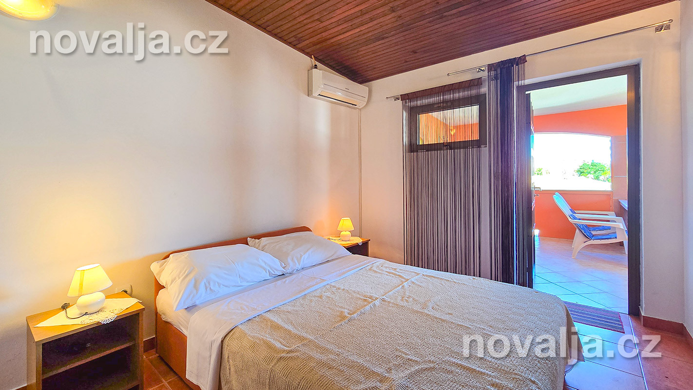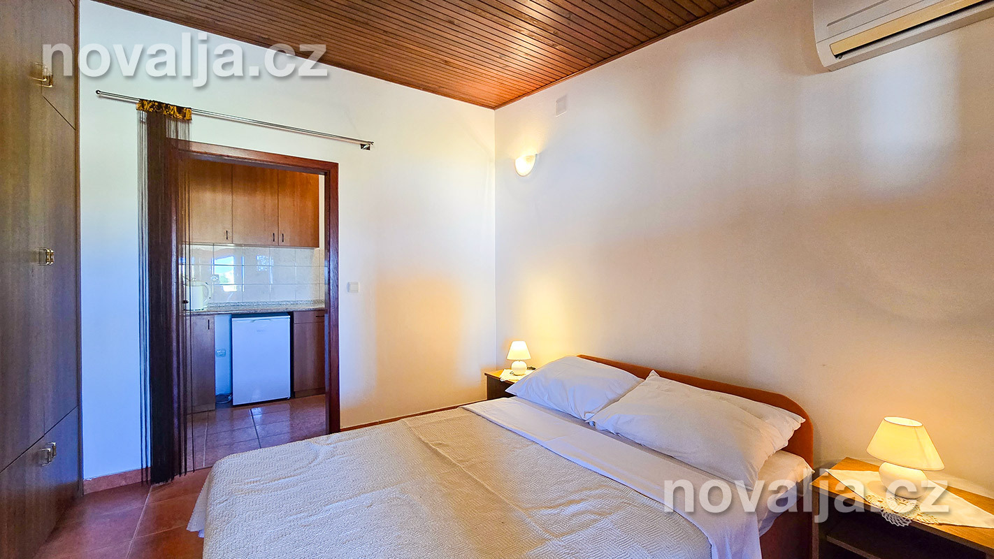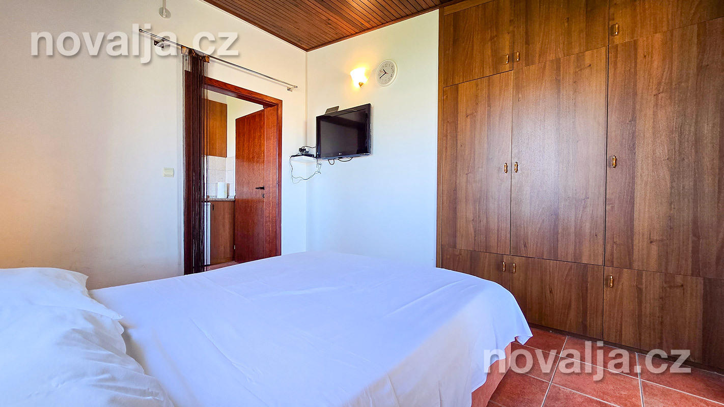 Dva apartmány se společnou chodbou a terasou pro 4 osoby (celkem): 2 ložnice se dvěma lůžky, 2 vybavené kuchyně, 2 koupelny se sprchovým koutem a WC, prostorná krytá terasa s výhledem na moře. Klimatizace v obou ložnicích za příplatek 14 €/den (hradí se na místě).