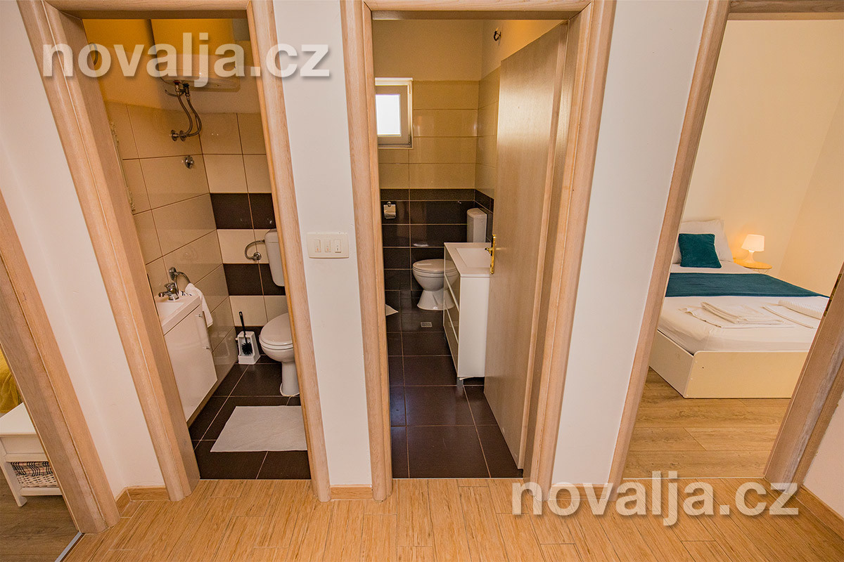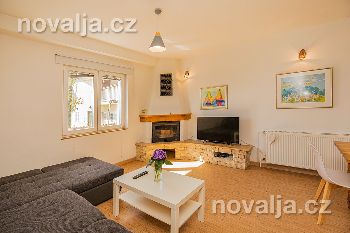 3 ložnice - dvě ložnice se dvěma lůžky, jedna se třemi lůžky, vybavená kuchyň (lednička, mrazák, trouba, myčka, varná konvice, mikrovlnná trouba, kávovar), obývací prostor s rozkládacím gaučem pro 1 osobu, TV+SAT, sociální zařízení se sprchovým koutem a WC, další samostatné WC, fén, žehlička, balkón a terasa s výhledem na moře. Klimatizace v kuchyni (v ceně).