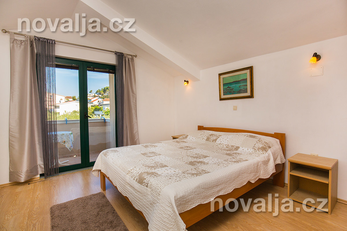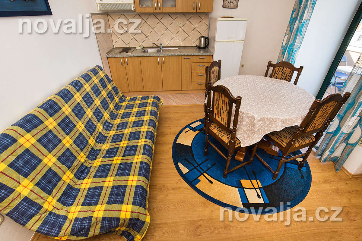 1 ložnice se dvěma lůžky, vybavená kuchyň (lednička, mrazák, trouba, varná konvice, kávovar, toaster) s rozkládacím gaučem (200 x 140 cm) pro 1 osobu, další lůžko (200 x 160 cm) pro 2 osoby v patře na galerii (viz foto 4-5/16), TV+SAT, 2x sociální zařízení se sprchovým koutem a WC, fén, sejf, 2x terasa s výhledem na moře. Klimatizace v kuchyni a v ložnici (v ceně).