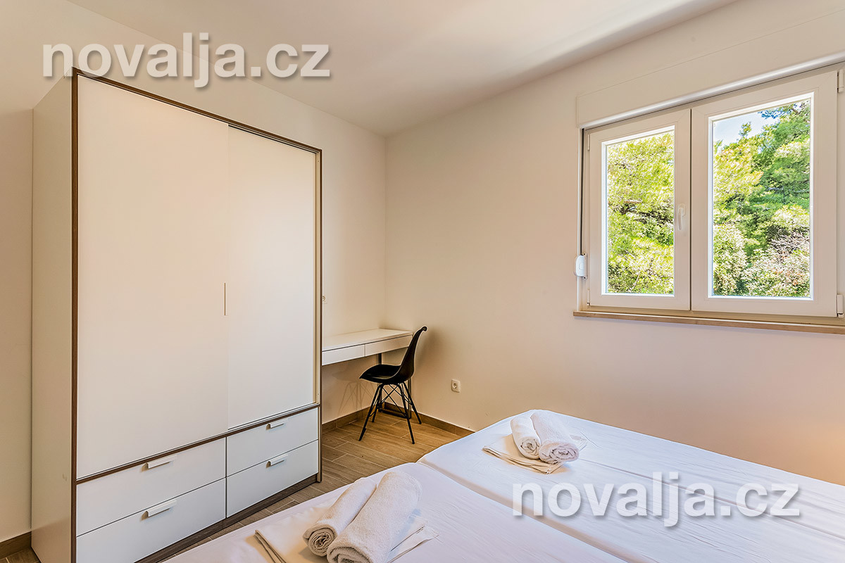 2 ložnice s manželskou postelí, vybavená kuchyň (lednička, mrazák, trouba, myčka, mikrovlnná trouba, varná konvice, kávovar) s rozkládacím gaučem pro 1–2 osoby, TV+SAT, sejf, 2x sociální zařízení se sprchovým koutem a WC, pračka, fén, žehlička, prostorná terasa s výhledem na moře. Klimatizace v ceně.