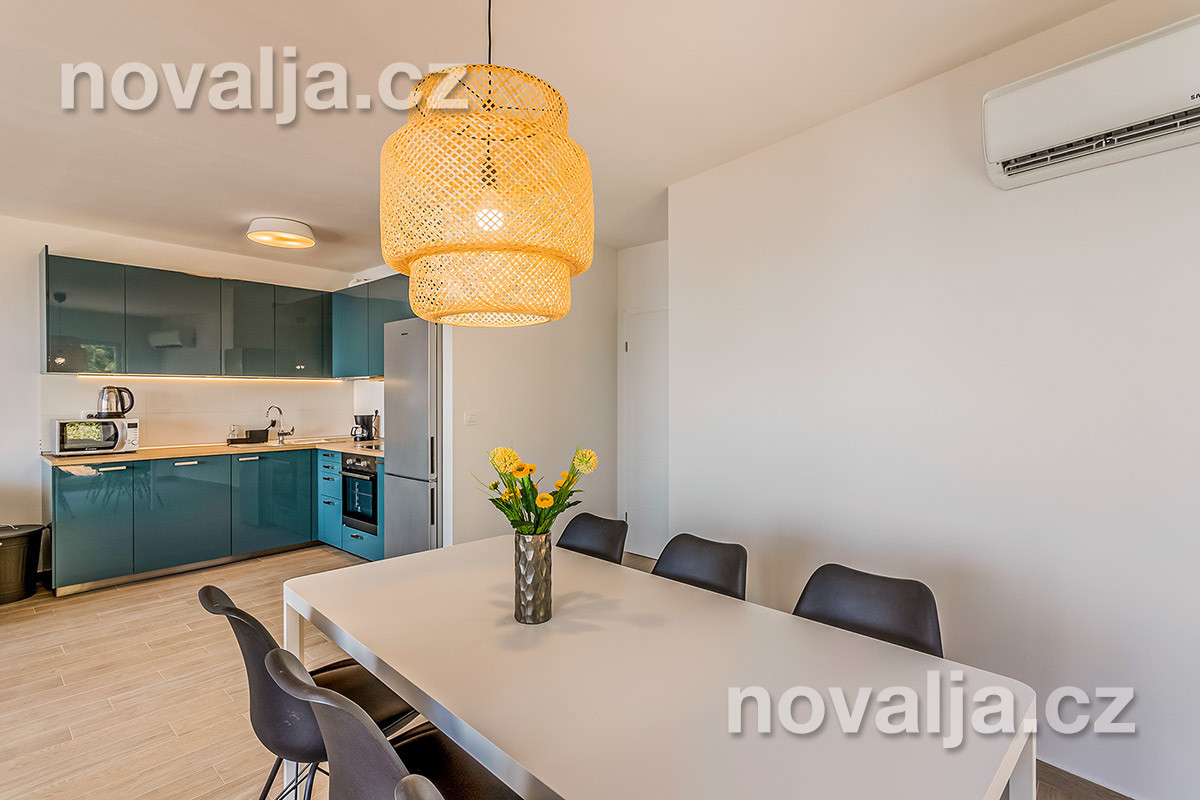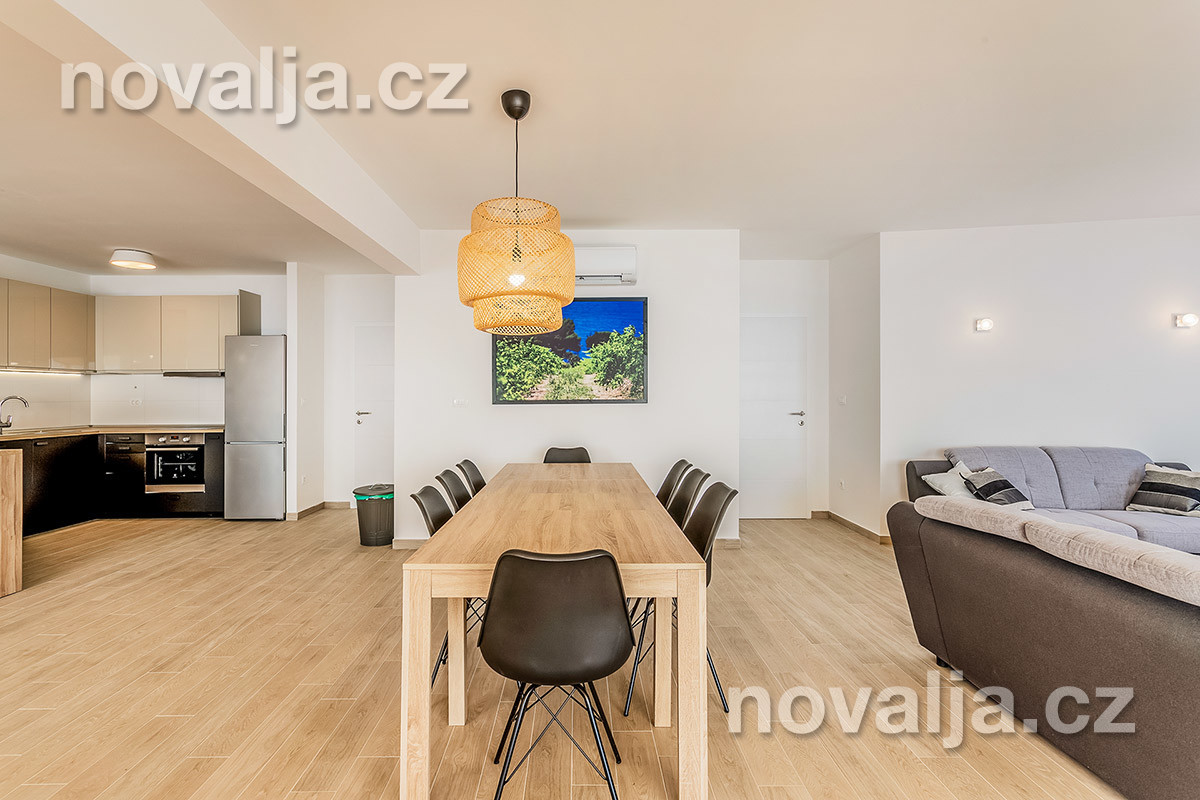 3 ložnice s manželskou postelí, vybavená kuchyň (lednička, mrazák, trouba, myčka, mikrovlnná trouba, varná konvice, kávovar) s rozkládacím gaučem pro 1–2 osoby, TV+SAT, sejf, 3x sociální zařízení se sprchovým koutem a WC, pračka, fén, žehlička, prostorná terasa s krásným širým výhledem na moře. Klimatizace v ceně.