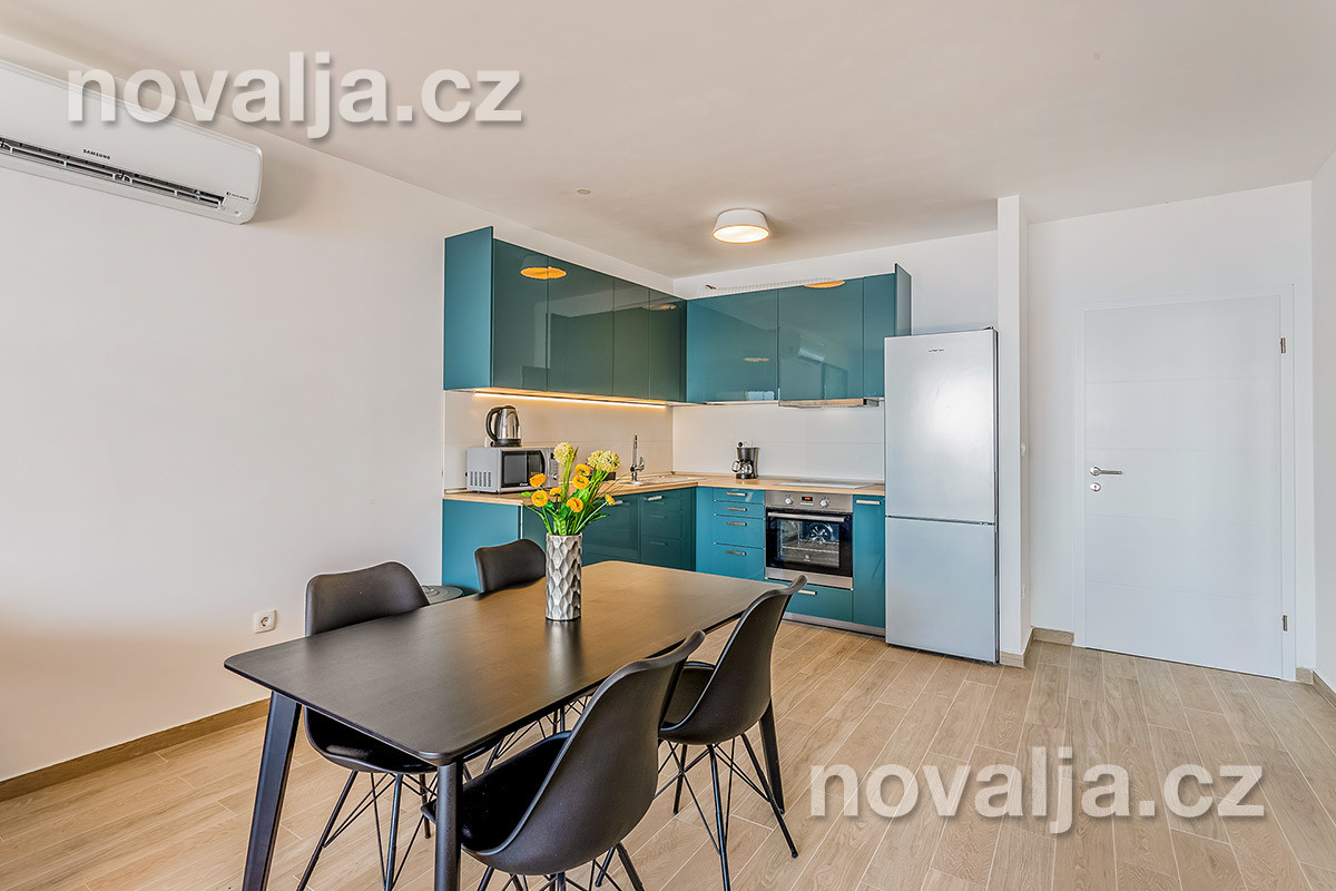 1 ložnice s manželskou postelí, vybavená kuchyň (lednička, mrazák, trouba, myčka, mikrovlnná trouba, varná konvice) s rozkládacím gaučem pro 1 osobu, TV+SAT, sejf, sociální zařízení se sprchovým koutem a WC, pračka, fén, žehlička, terasa s výhledem na moře. Klimatizace v kuchyni i v ložnici v ceně. Rozloha 56 m².