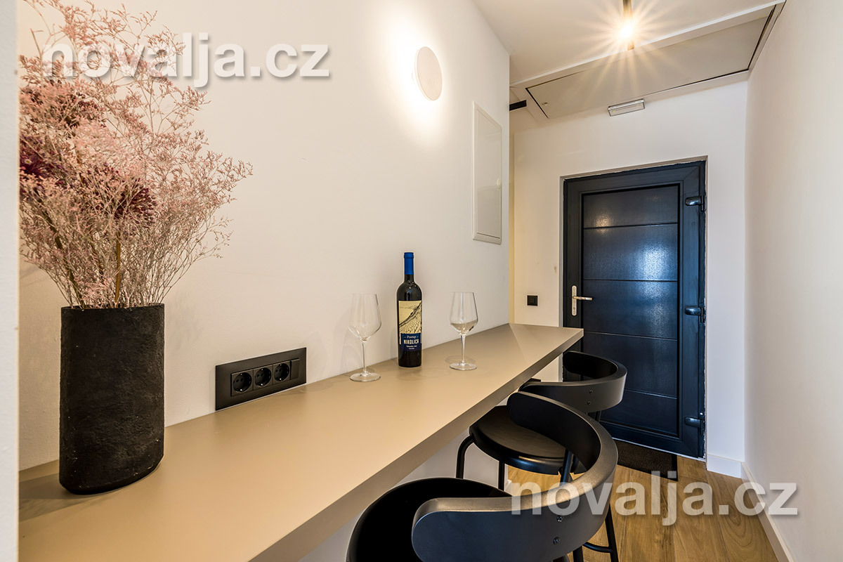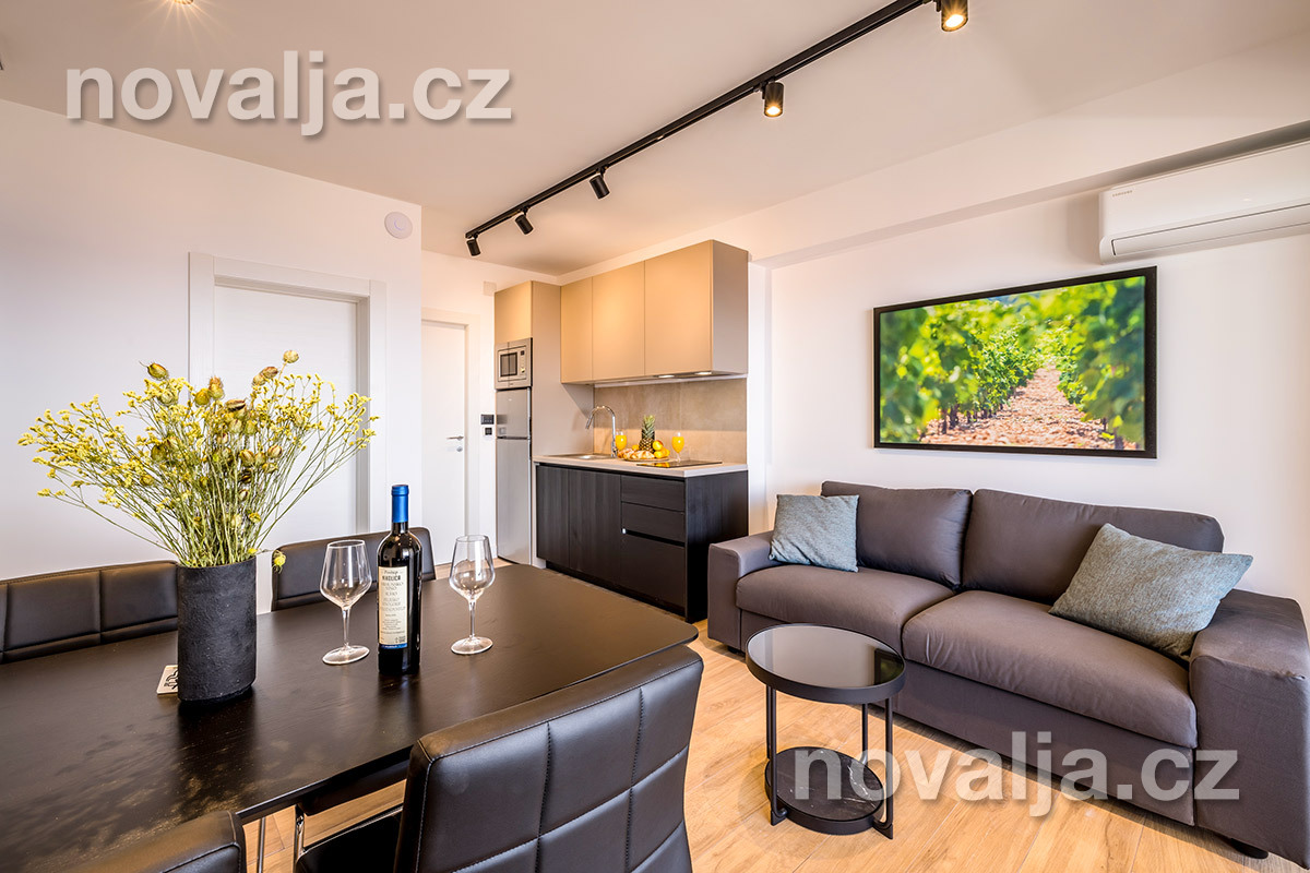 1 ložnice s manželskou postelí, vybavená kuchyň (lednička, mrazák, trouba, myčka, mikrovlnná trouba, varná konvice, kávovar) s rozkládacím gaučem pro 1–2 osoby, TV+SAT, sejf, sociální zařízení se sprchovým koutem a WC, pračka, fén, žehlička, prostorná terasa s nádherným výhledem na moře. Klimatizace v kuchyni i v ložnici v ceně. Rozloha 58 m².