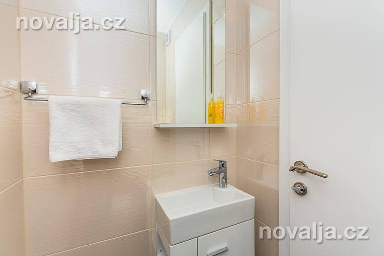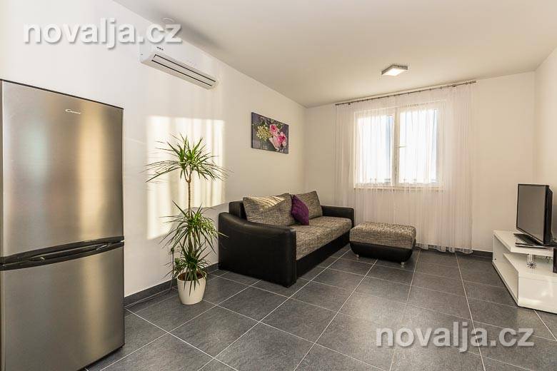 1 ložnice se dvěma lůžky, vybavená kuchyň (lednička, mrazák, trouba, myčka + tablety do myčky, varná konvice, kávovar) s rozkládacím gaučem (200 x 160 cm) pro 1–2 osoby, LCD TV+SAT, sejf, sociální zařízení s vanou a WC, další samostatné WC, pračka, fén, terasa s částečným výhledem na moře. Klimatizace v kuchyni (v ceně).