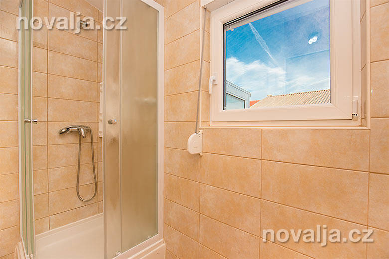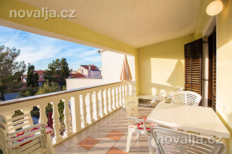 2 ložnice se dvěma lůžky, možnost 1 přistýlky v ložnici (jen dítě do 12 let), vybavená kuchyň (lednička, mrazák, trouba, mikrovlnná trouba, varná konvice), obývák s rozkládacím gaučem pro 1 osobu, TV+SAT, sociální zařízení se sprchovým koutem a WC, terasa bez výhledu na moře. Klimatizace v obýváku (v ceně).
