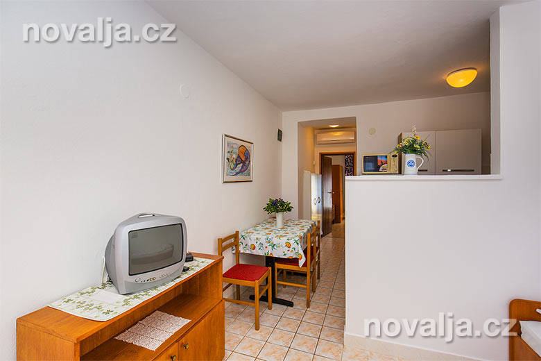 1 ložnice se dvěma lůžky, vybavená kuchyň (lednička, mrazák, mikrovlnná trouba, varná konvice) se dvěma lůžky, TV, sociální zařízení se sprchovým koutem a WC, terasa bez výhledu na moře. Klimatizace v kuchyni (v ceně). V ložnici a v kuchyni je na stropě ventilátor.