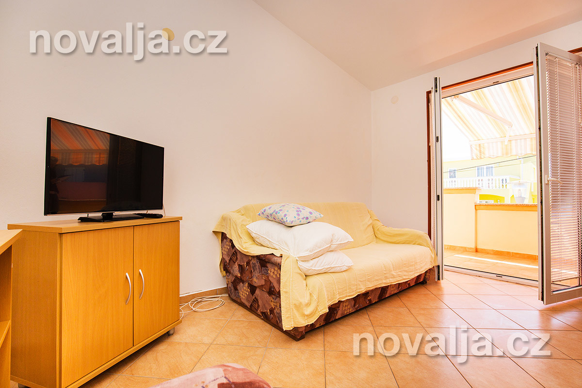 Studio (jedna místnost) s vybaveným kuchyňským koutem (lednička, mrazák, varná konvice) a se dvěma rozkládacími gauči - jeden gauč (195 x 170 cm) pro 2 osoby, druhý gauč (192 x 110 cm) pro 1 osobu, TV+SAT, sociální zařízení se sprchovým koutem a WC, pračka, stíněná terasa. Klimatizace (v ceně).