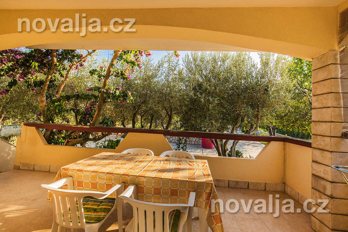 2 ložnice - první ložnice s manželskou postelí, druhá ložnice s dvěma lůžky, vybavená kuchyň (lednička, mrazák, mikrovlnná trouba, varná konvice, kávovar) s rozkládacím gaučem pro 1-2 osoby (buď 2 děti do 12 let, nebo jen 1 osoba starší 12 let), TV+SAT, sociální zařízení se sprchovým koutem a WC, terasa s bočním výhledem na moře (přes zeleň). Klimatizace (v ceně).