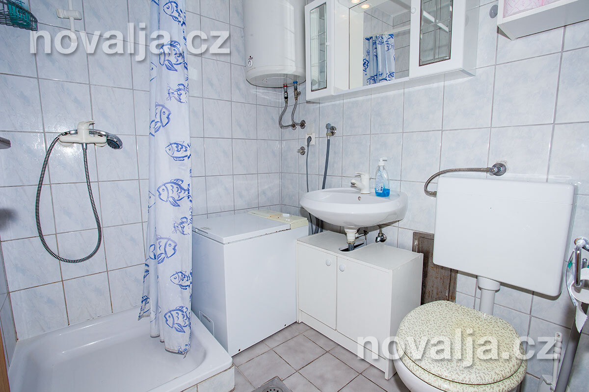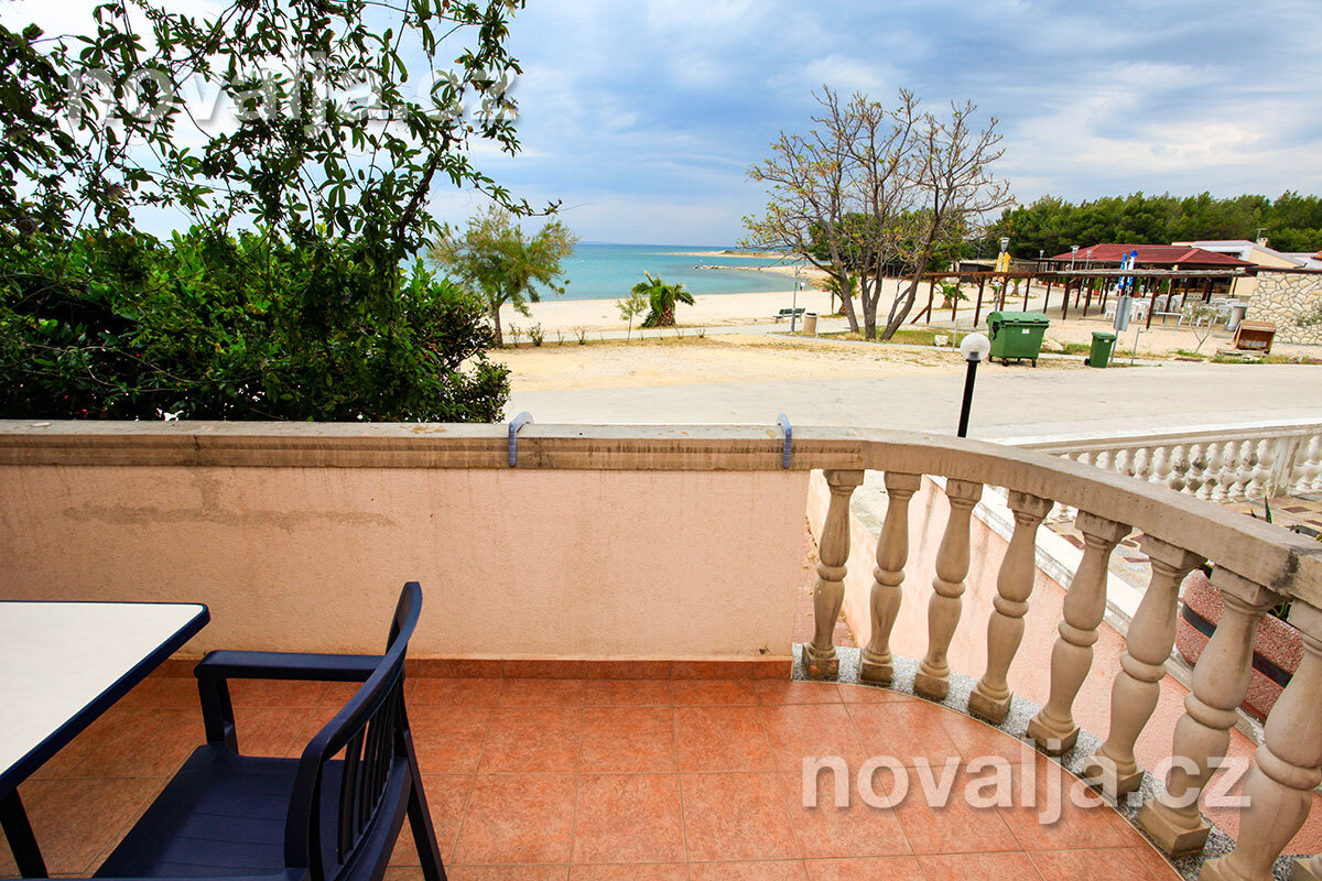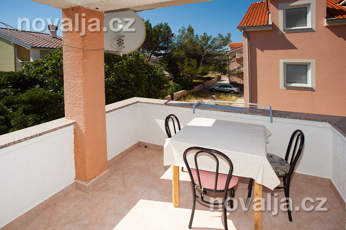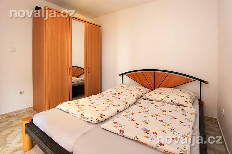 2 ložnice se dvěma lůžky, vybavená kuchyň (lednička, trouba, varná konvice) s rozkládacím gaučem pro 1 osobu, sociální zařízení se sprchovým koutem a WC, pračka, TV, terasa s výhledem na moře okolo celého apartmánu - plastový a dřevěný nábytek, lehátka, slunečník. Klimatizace v kuchyni (v ceně).