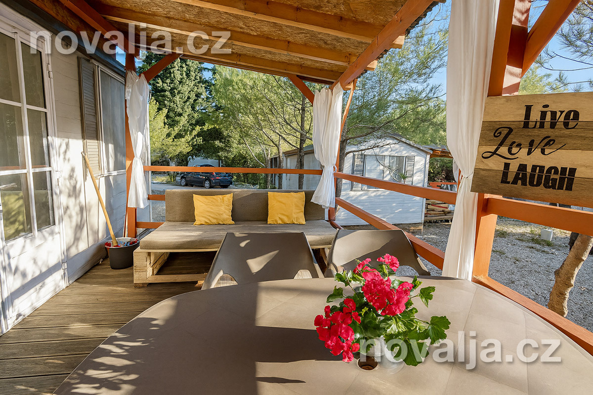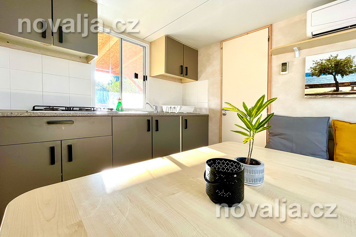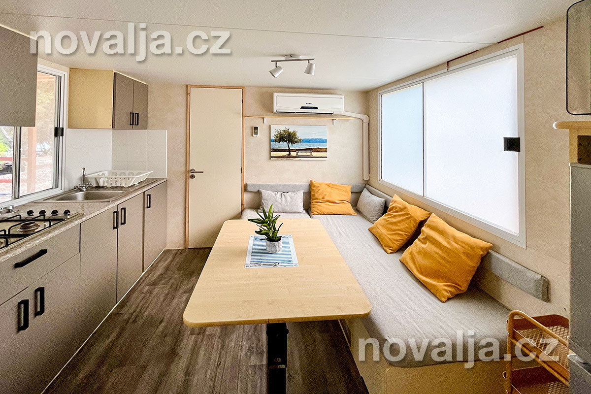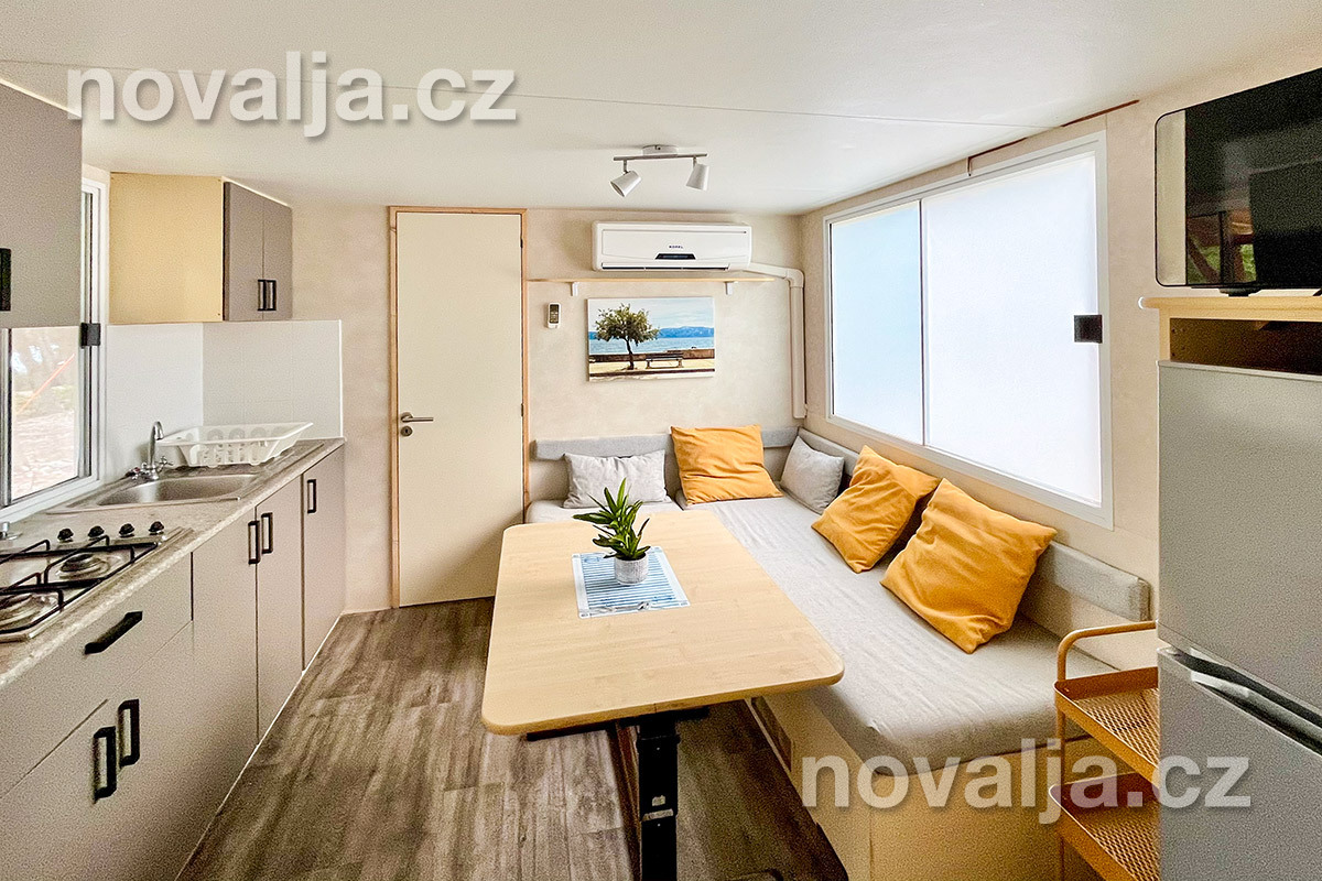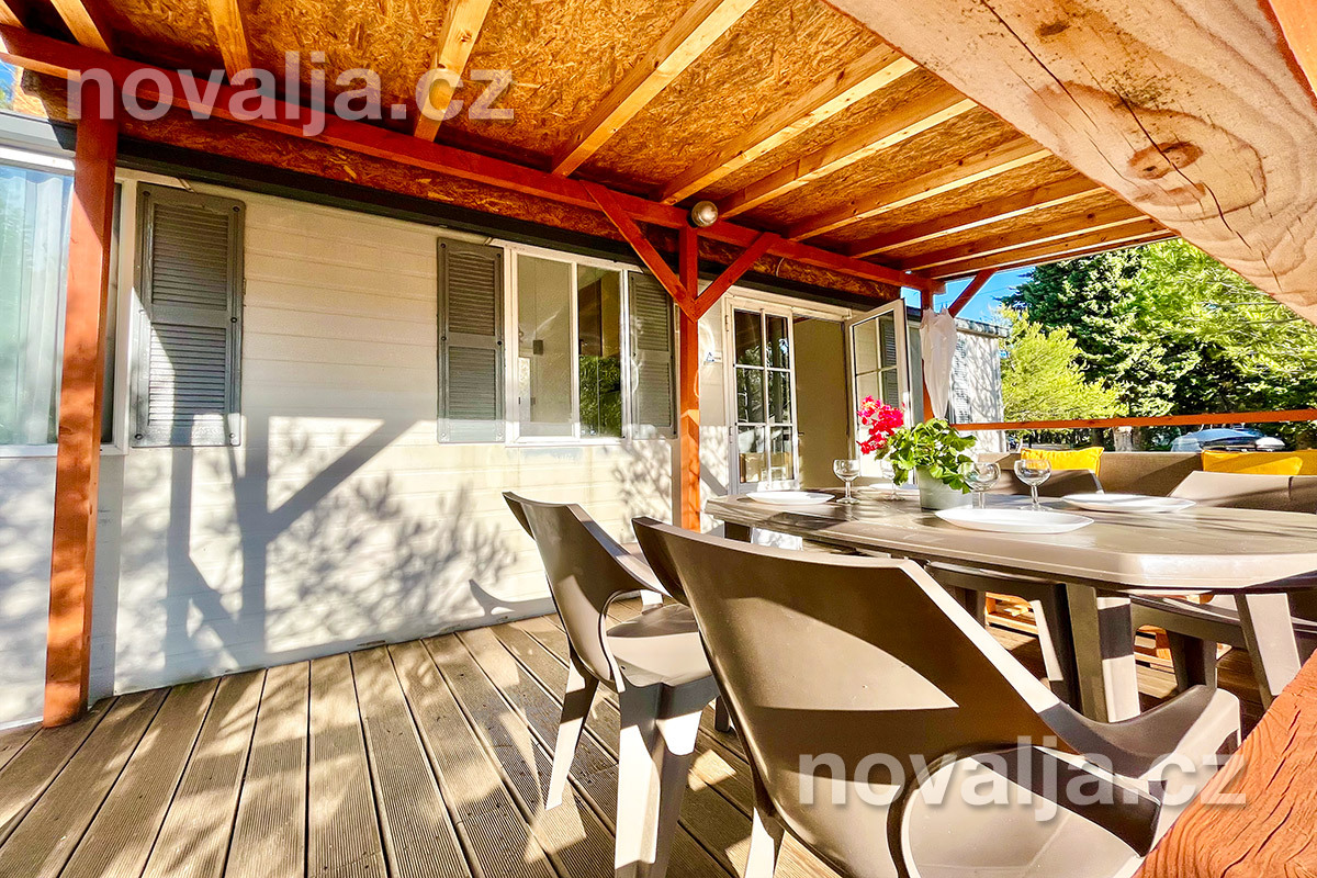 2 ložnice - jedna se dvěma lůžky, druhá se třemi lůžky (třetí lůžko je palandové a může na něm spát pouze osoba do 50 kg), vybavená kuchyň (plynová varná deska, lednička, mrazák, mikrovlnná trouba, varná konvice, kávovar Nesspresso), sociální zařízení se sprchovým koutem a WC, krytá terasa se zahradním nábytkem. Klimatizace v kuchyni (v ceně).