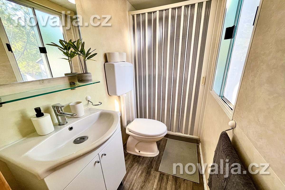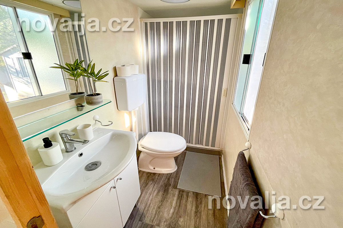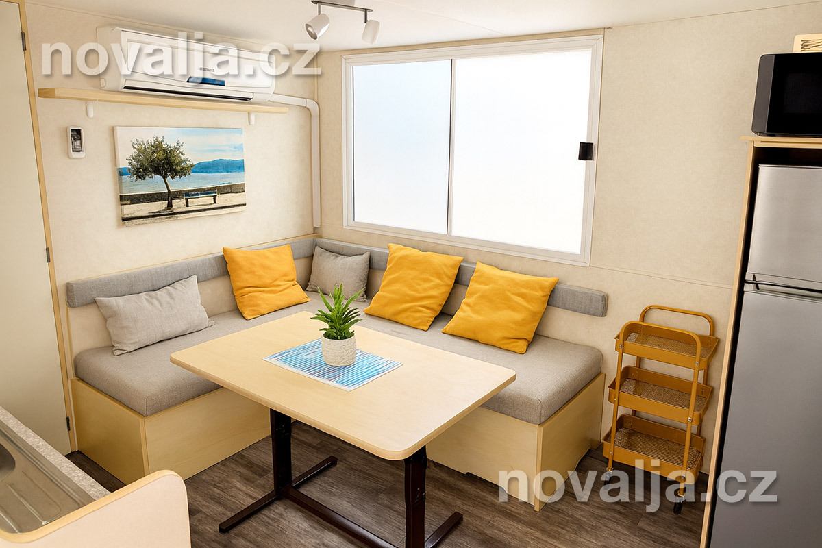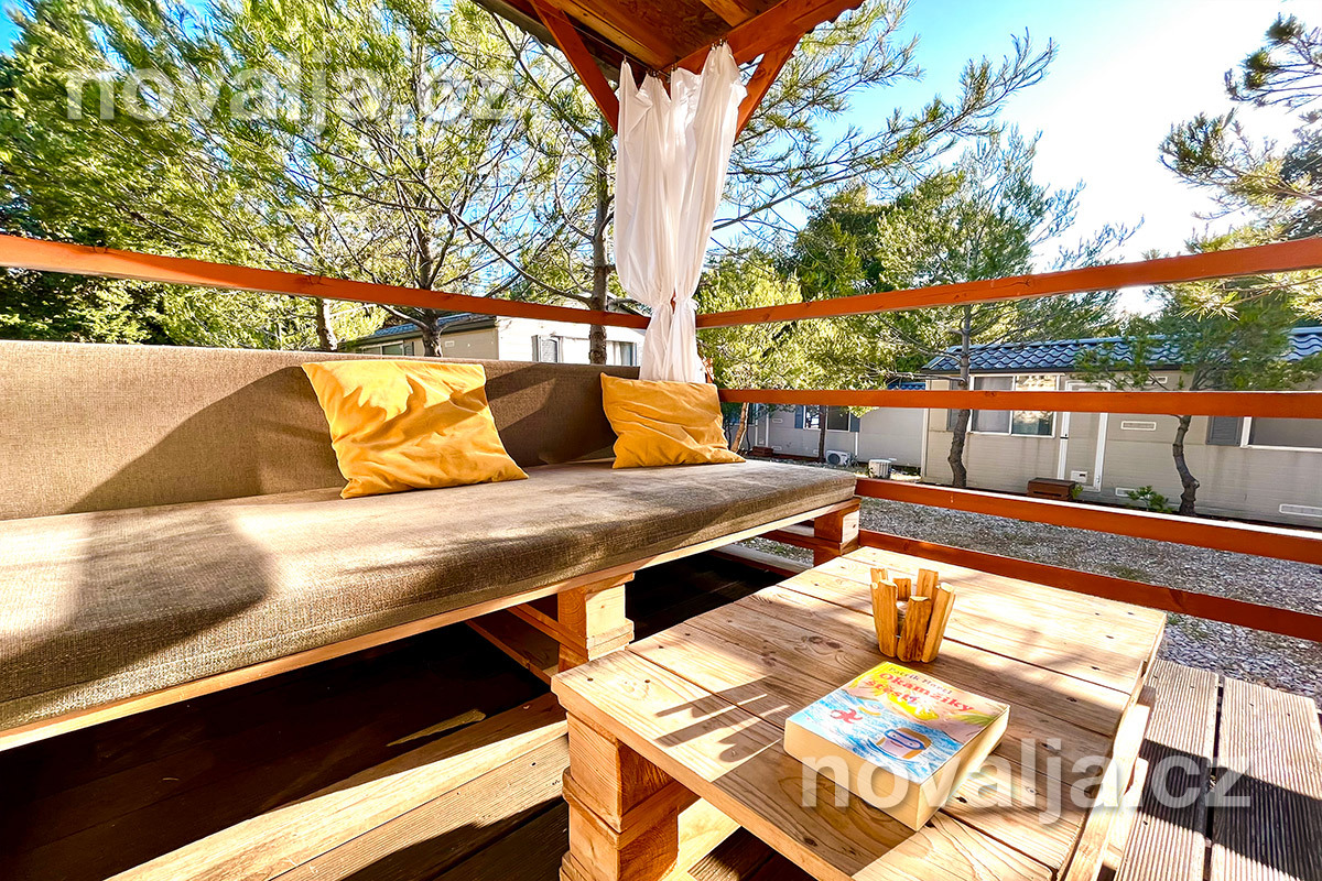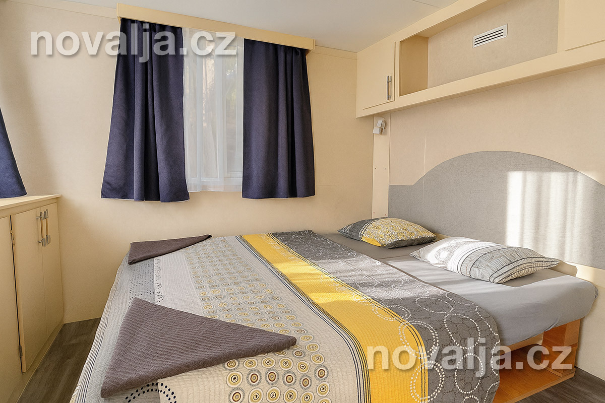 2 ložnice - jedna se dvěma lůžky, druhá se třemi lůžky (třetí lůžko je palandové a může na něm spát pouze osoba do 50 kg), vybavená kuchyň (plynová varná deska, lednička, mrazák, mikrovlnná trouba, varná konvice, kávovar Nesspresso), sociální zařízení se sprchovým koutem a WC, krytá terasa se zahradním nábytkem. Klimatizace v kuchyni (v ceně).