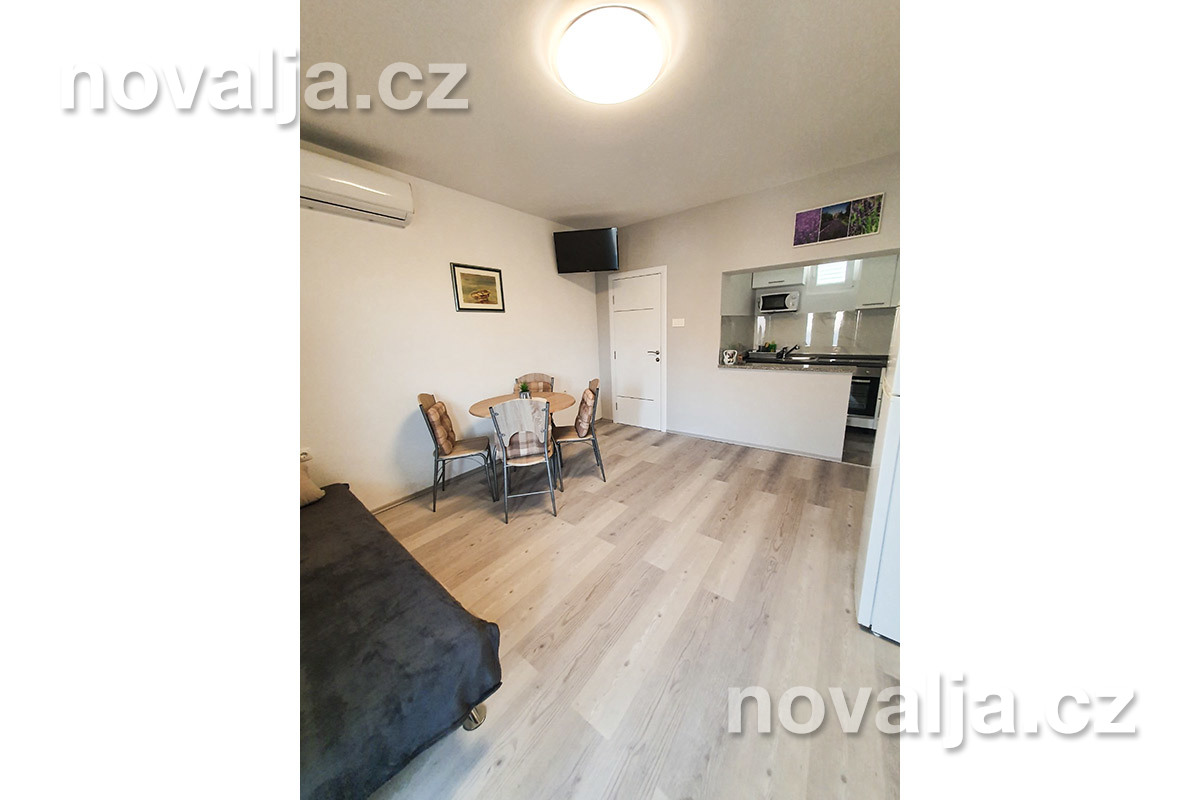 1 ložnice se dvěma lůžky - manželská postel jen 200 x 140 cm!, vybavená kuchyň (lednička, mrazák, trouba, mikrovlnná trouba, varná konvice) s rozkládacím gaučem (190 x 120 cm) pro 1-2 osoby (buď 2 děti do 12 let, nebo jen 1 osoba starší 12 let), TV, sociální zařízení se sprchovým koutem a WC, fén, terasa s částečným výhledem na moře. Klimatizace v kuchyni (v ceně).