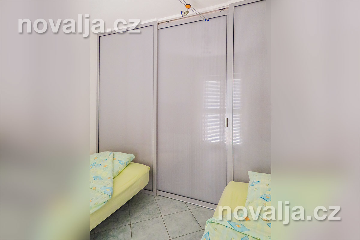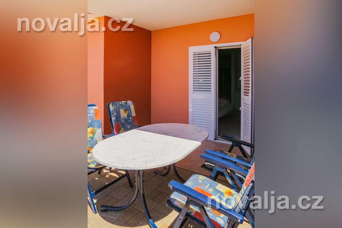 1 ložnice se dvěma lůžky, vybavená kuchyň (lednička, mrazák, myčka, mikrovlnná trouba, varná konvice, kávovar, toaster) s rozkládacím gaučem (200 x 140 cm) pro 1-2 osoby, TV+SAT, sociální zařízení se sprchovým koutem a WC, fén na vlasy, žehlička a žehlicí prkno, terasa s výhledem na moře. Klimatizace v kuchyni (v ceně).