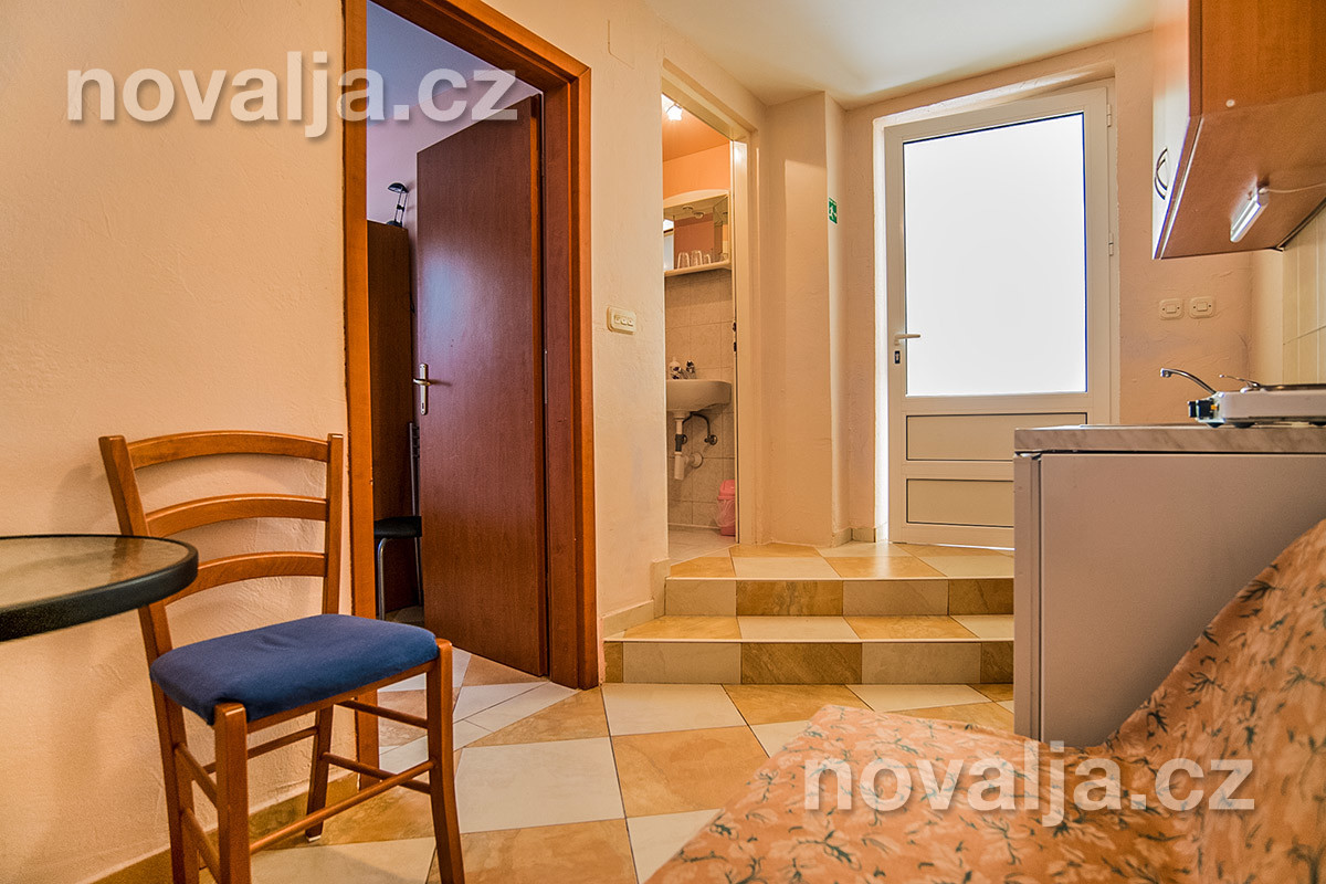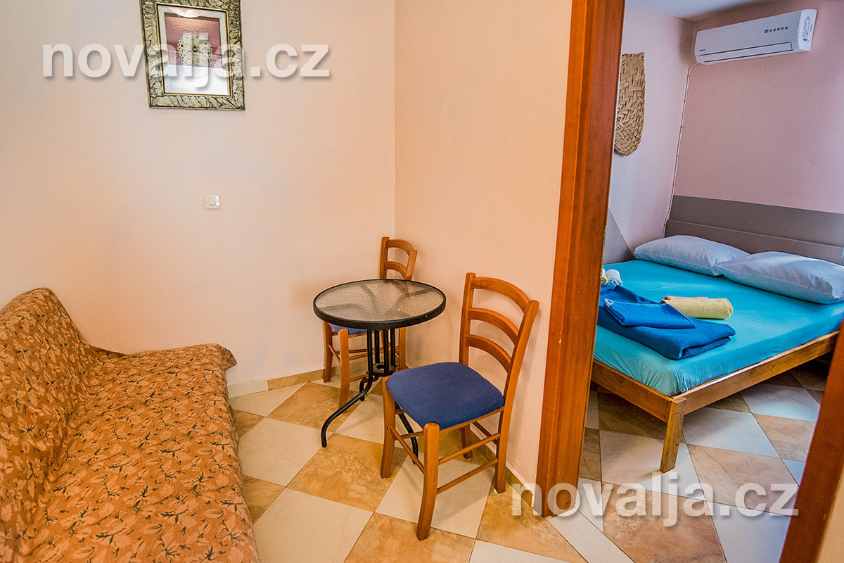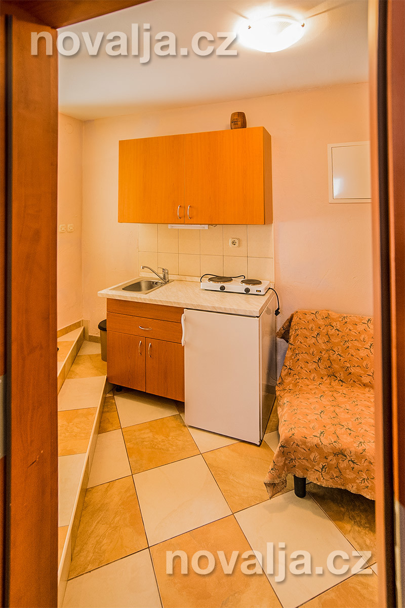 Studio (1 místnost) se dvěma lůžky a s vybaveným kuchyňským koutem (lednička, mrazák, mikrovlnná trouba, varná konvice), TV, sociální zařízení se sprchovým koutem a WC, fén, terasa. Klimatizace v ceně.