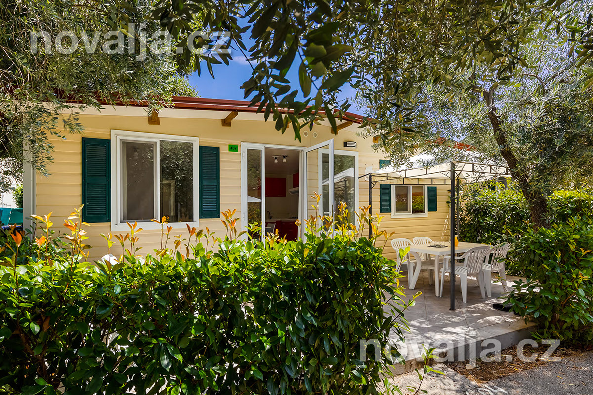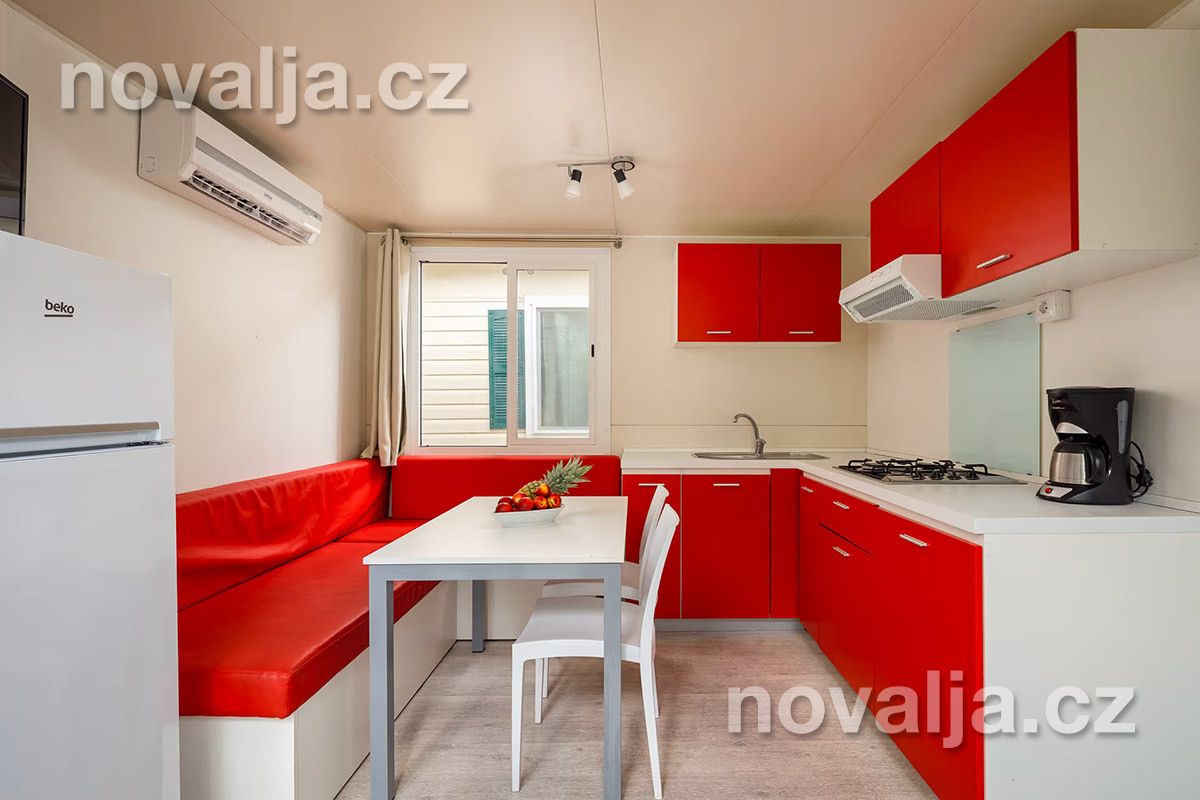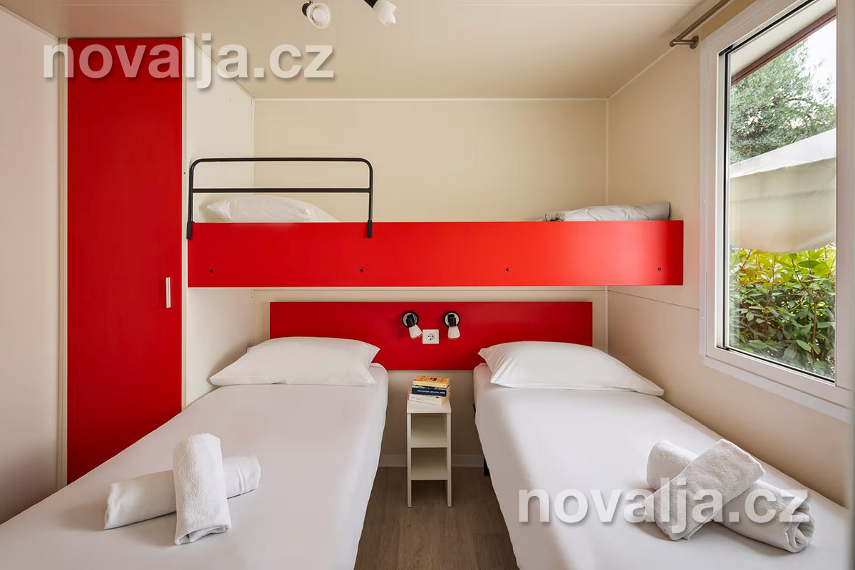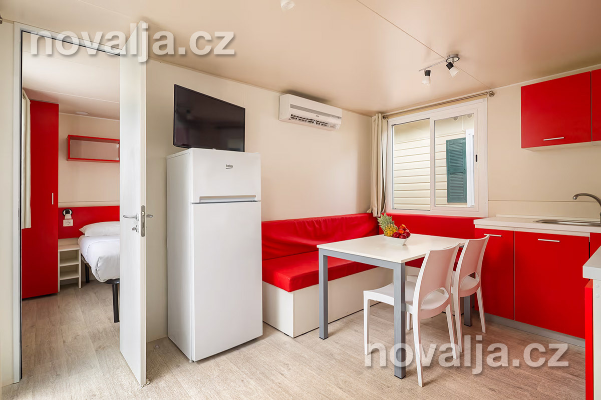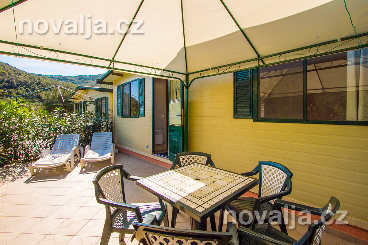 2 ložnice - jedna se dvěma lůžky (manželská postel 140 x 190 cm) a jedna se třemi samostatnými lůžky 80 x 180 cm (třetí lůžko je palandové s rozměrem 70 x 200 cm a je určeno jen pro 1 dítě do 9,99 let), vybavená kuchyň (lednička s malým mrazákem, kávovar), TV+SAT, 2x koupelna se sprchovým koutem a WC, stíněná terasa se zahradním nábytkem a dvěma lehátky. Klimatizace v kuchyni (v ceně).