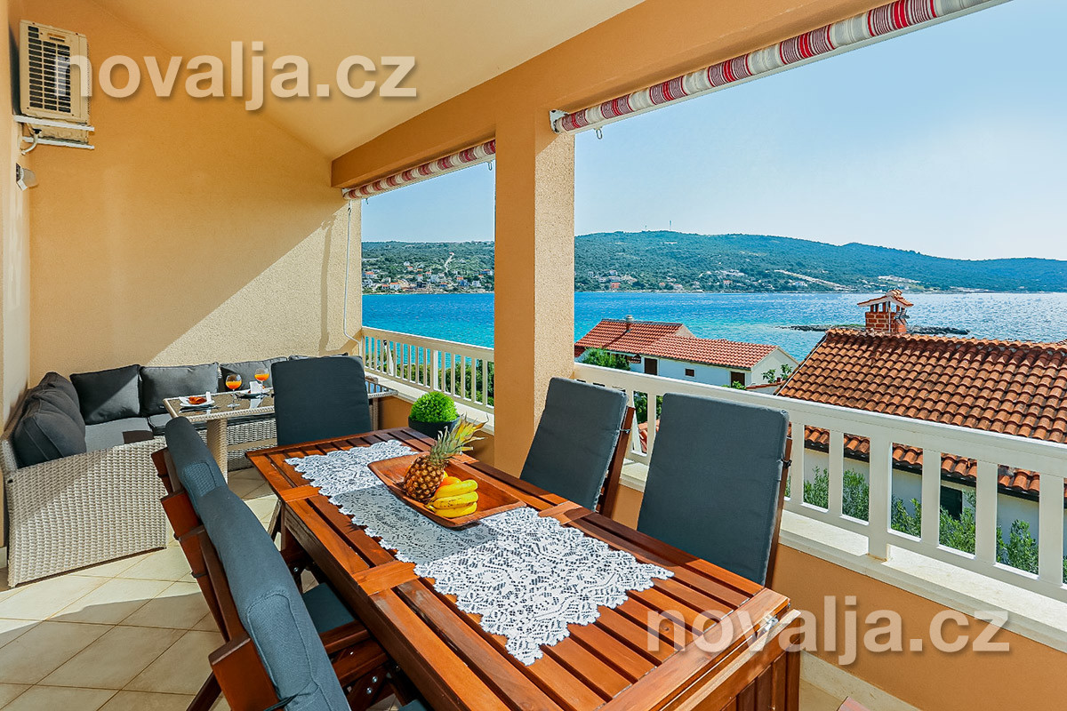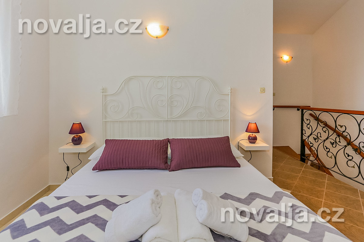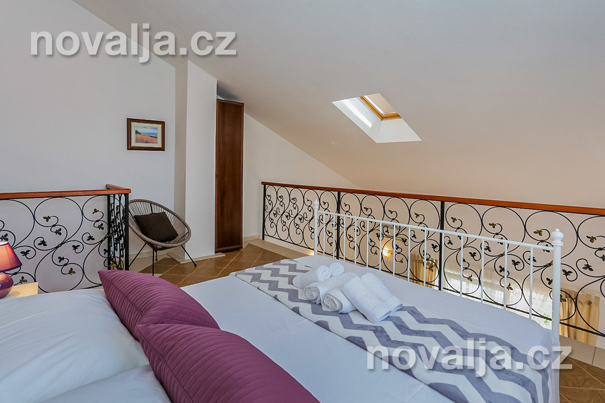 Mezonetový apartmán: 2 ložnice se dvěma lůžky, vybavená kuchyň (lednička, mrazák, trouba, myčka, mikrovlnná trouba, topinkovač, varná konvice, kávovar) s rozkládacím gaučem (200 x 160 cm) pro 1-2 osoby, v patře na galerii další obývací prostor s manželskou postelí (200 x 160 cm) pro 2 osoby, TV+SAT, 2x sociální zařízení - jedno s vanou a WC, druhé se sprchovým koutem a WC, pračka, fén, terasa s výhledem na moře. Klimatizace v kuchyni a v patře (v ceně).