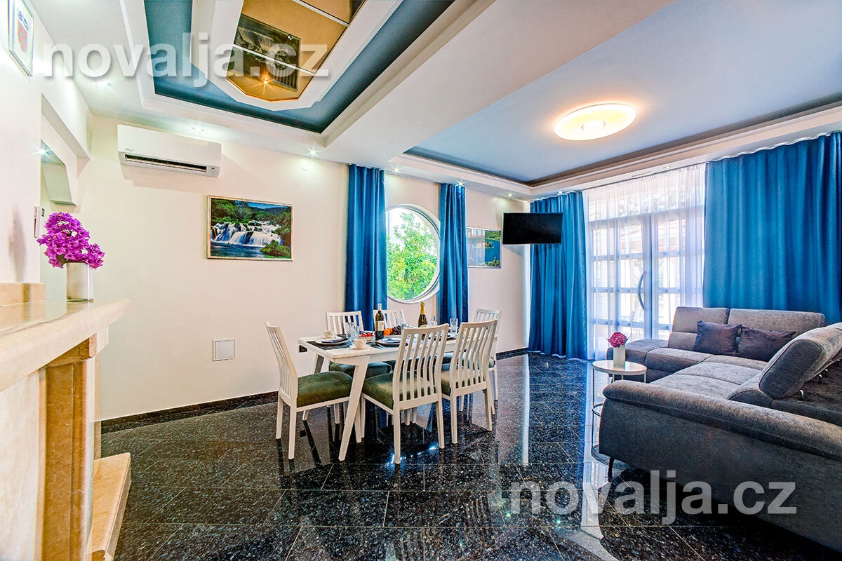 3 ložnice se dvěma lůžky (v jedné ložnici je navíc koupelna se sprchou), vybavená kuchyň (2x lednička, mrazák, 2x myčka, pračka, mikrovlnná trouba, varná konvice) s obývacím prostorem s rozkládacím gaučem pro 2 osoby, 2x sociální zařízení se sprchovým koutem a WC, sauna, veliká terasa s hydromasážní vířivou vanou, venkovní sprchou, grilem a krytým posezením. 2x klimatizace (v obývacím prostoru a v jedné ložnici) v ceně.