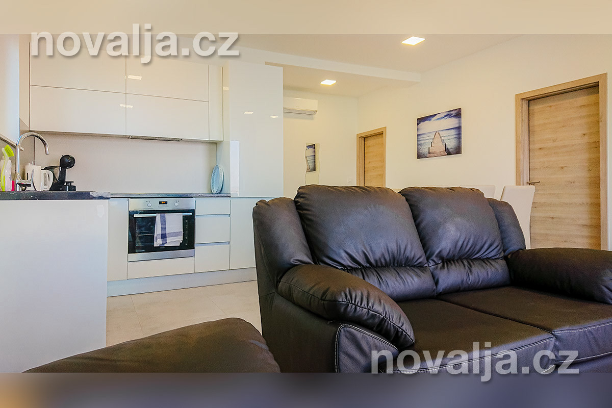 2 ložnice se dvěma lůžky, vybavená kuchyň (lednička, mrazák, trouba, myčka, mikrovlnná trouba, varná konvice, kávovar, toaster) TV+SAT, sejf, sociální zařízení se sprchovým koutem a WC, pračka, fén, terasa s výhledem na moře. Klimatizace v kuchyni (v ceně).