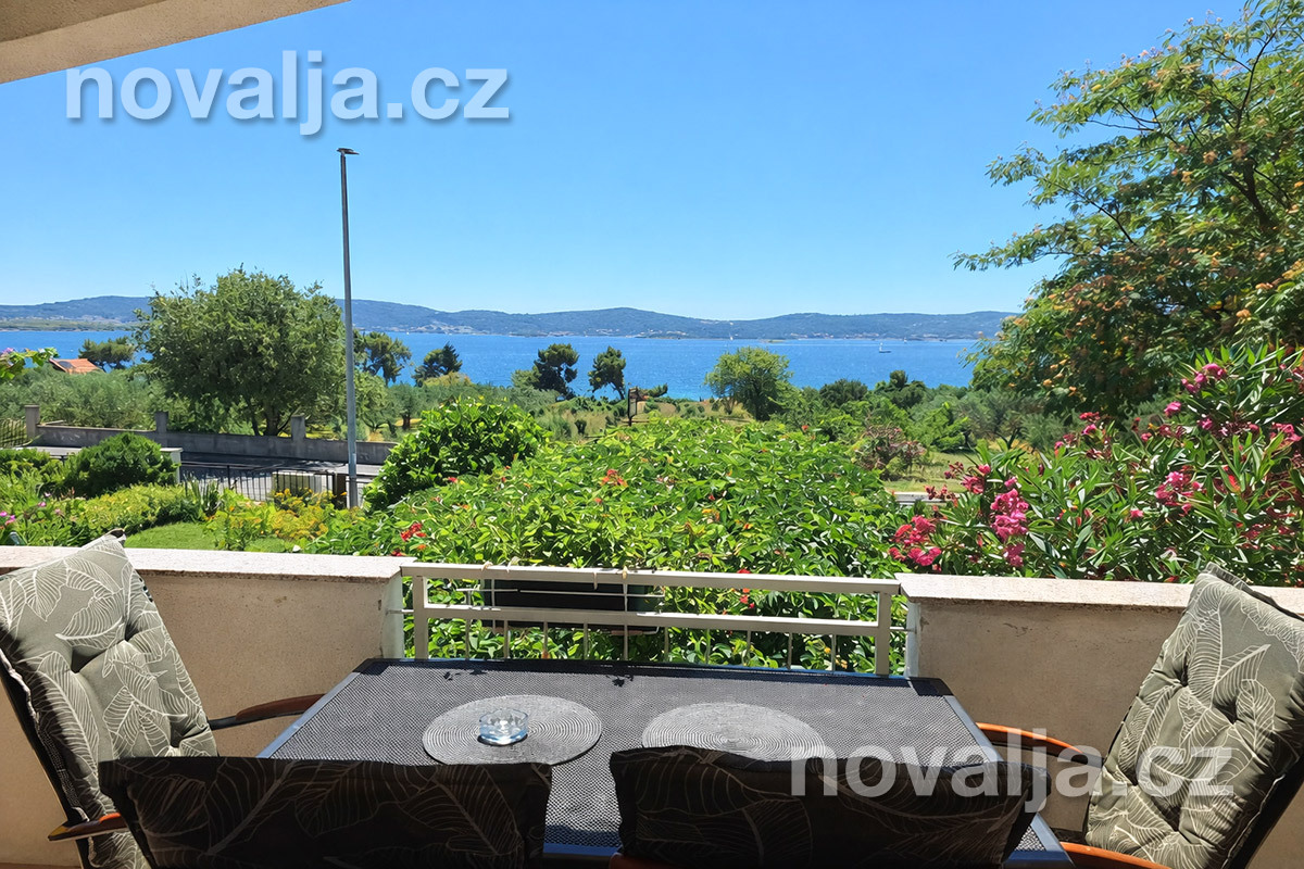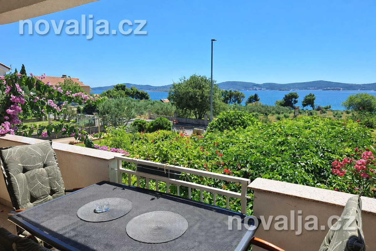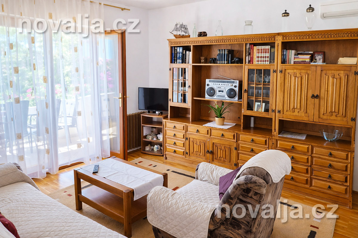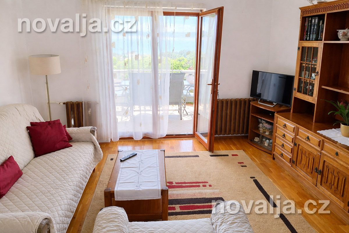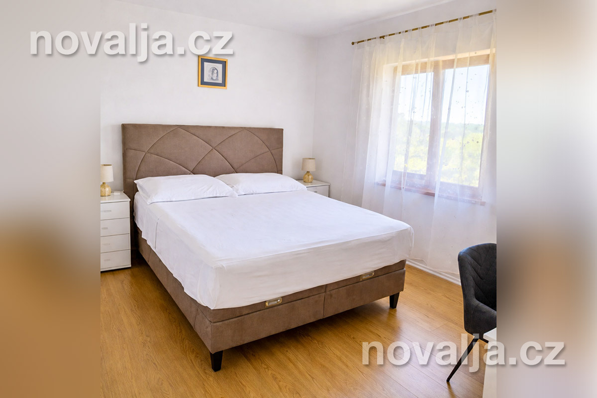 2 ložnice se dvěma lůžky, v jedné ložnici navíc rozkládací gauč pro 1 osobu, obývák s TV, vybavená kuchyň (lednička, mrazák, trouba, myčka nádobí, varná konvice, kávovar), sociální zařízení se sprchou a WC, pračka, terasa s výhledem na moře. Klimatizace v obýváku (v ceně).