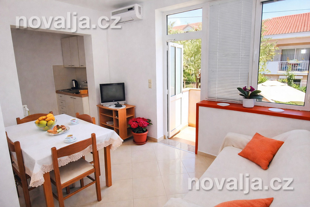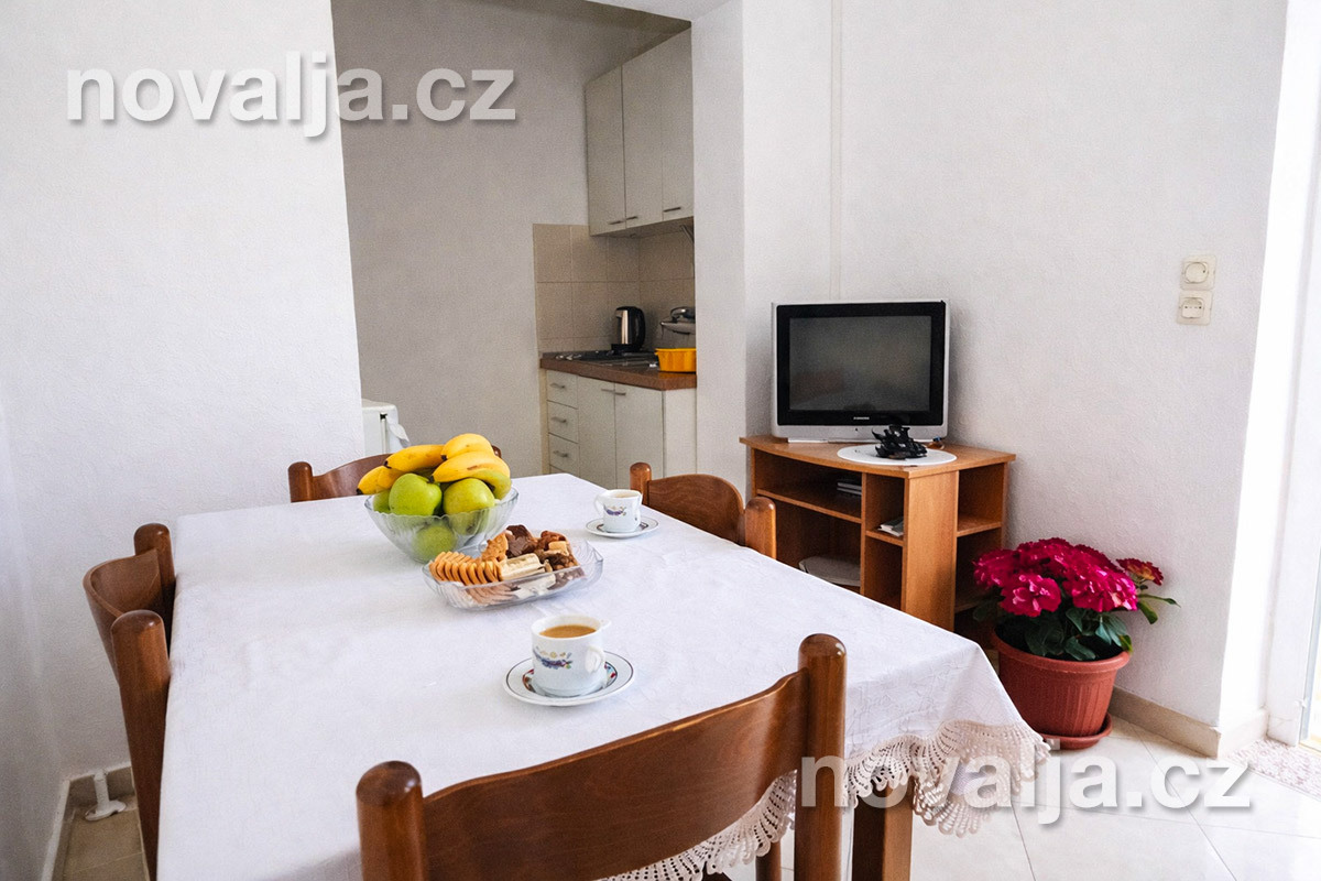1 ložnice se dvěma lůžky, vybavená kuchyň s rozkládacím gaučem pro 1-2 osoby (max. 2 děti do 10 let nebo jen 1 osoba starší 10 let), TV, sociální zařízení se sprchou a WC, terasa s výhledem na moře. Klimatizace v kuchyni (v ceně).