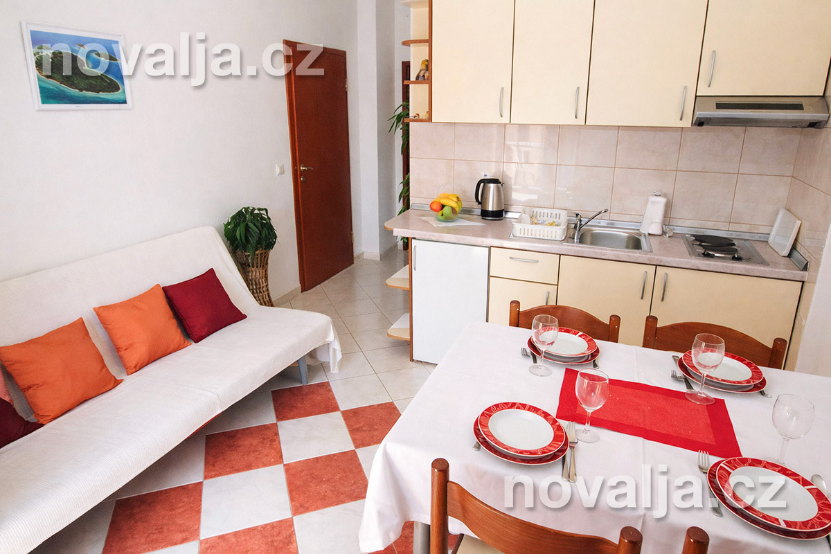 2 ložnice se dvěma lůžky, obytná místnost s vybavenou kuchyní (lednička, mrazák, trouba, myčka nádobí, varná konvice, kávovar) a rozkládacím gaučem pro 1 osobu, TV, sociální zařízení s vanou a WC, pračka, terasa s výhledem na moře. Klimatizace v kuchyni (v ceně).