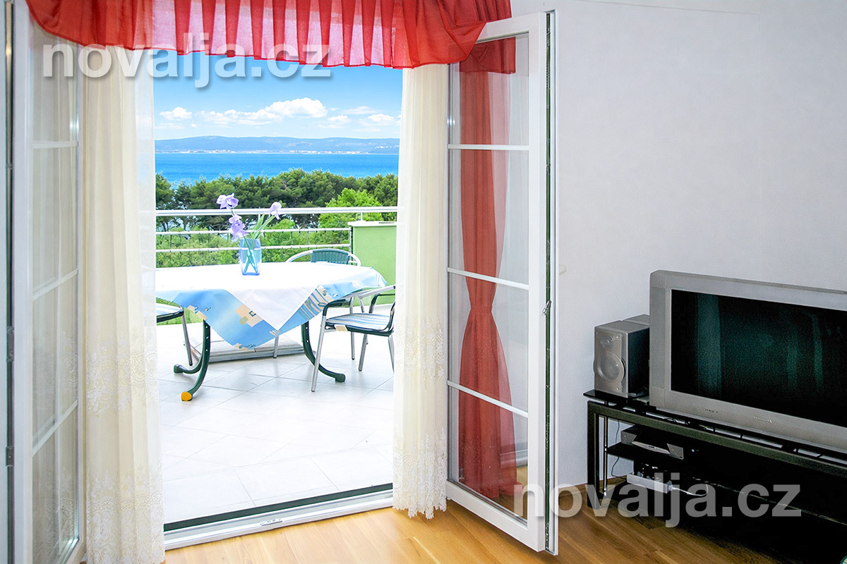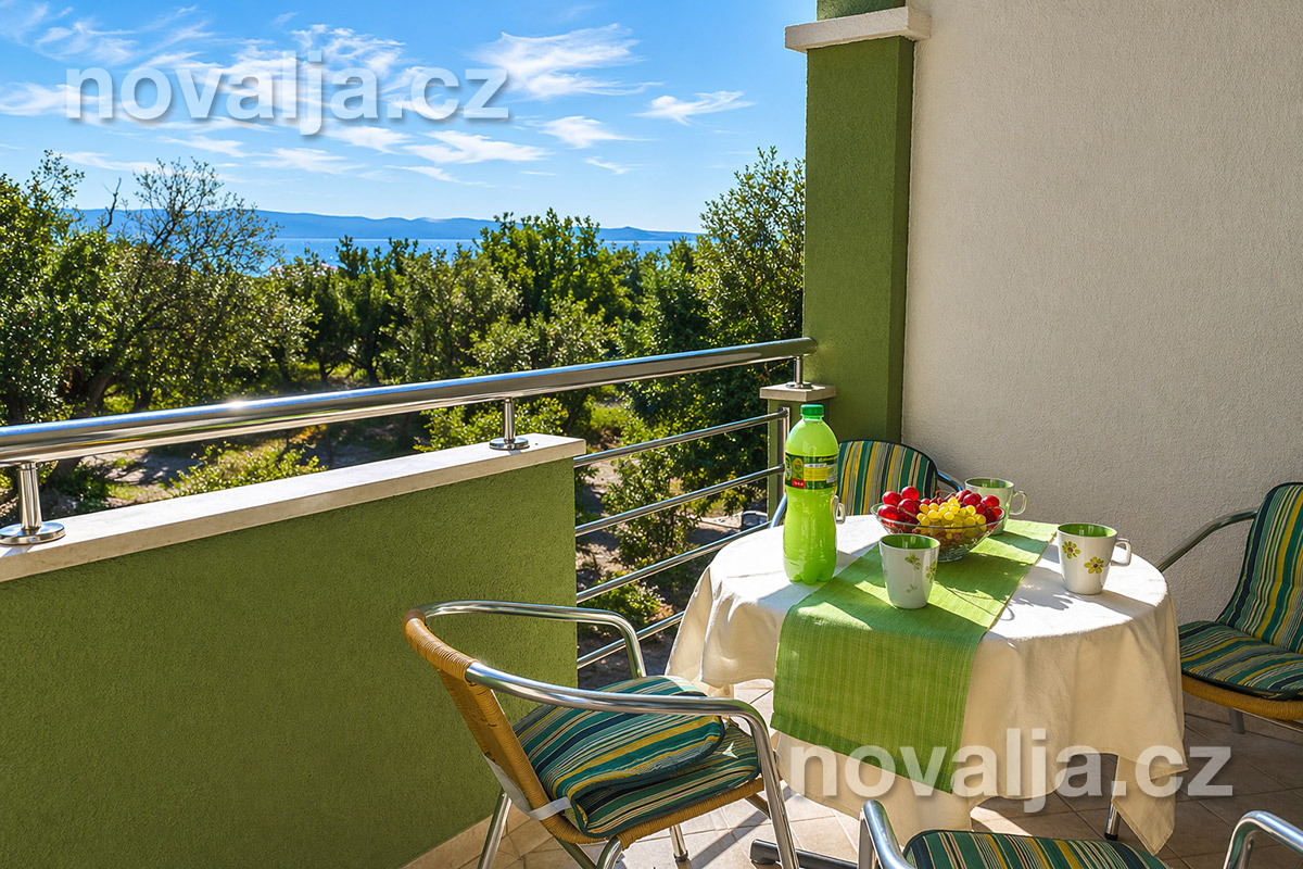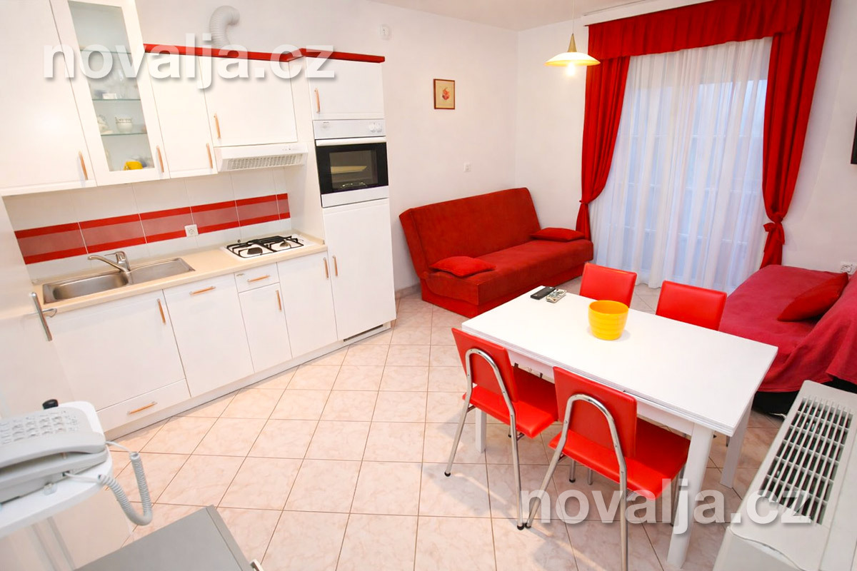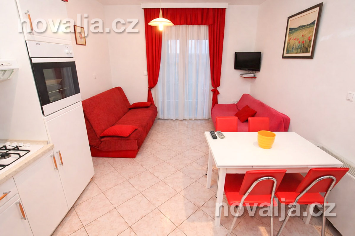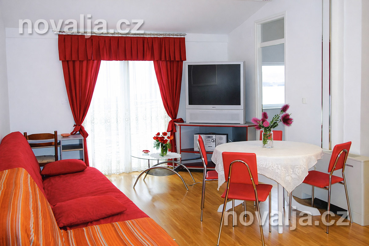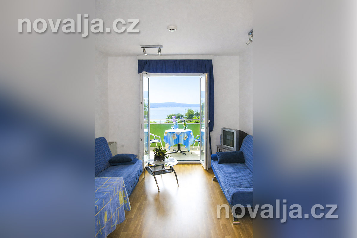 1 ložnice se dvěma lůžky a rozkládacím gaučem pro 1 osobu, vybavená kuchyň (lednička, trouba, myčka, varná konvice) s rozkládacím gaučem a rozkládacím křeslem pro 1–2 osoby, TV+SAT, fén, sociální zařízení s vanou a WC, terasa s krásným výhledem na moře. Klimatizace (v ceně).