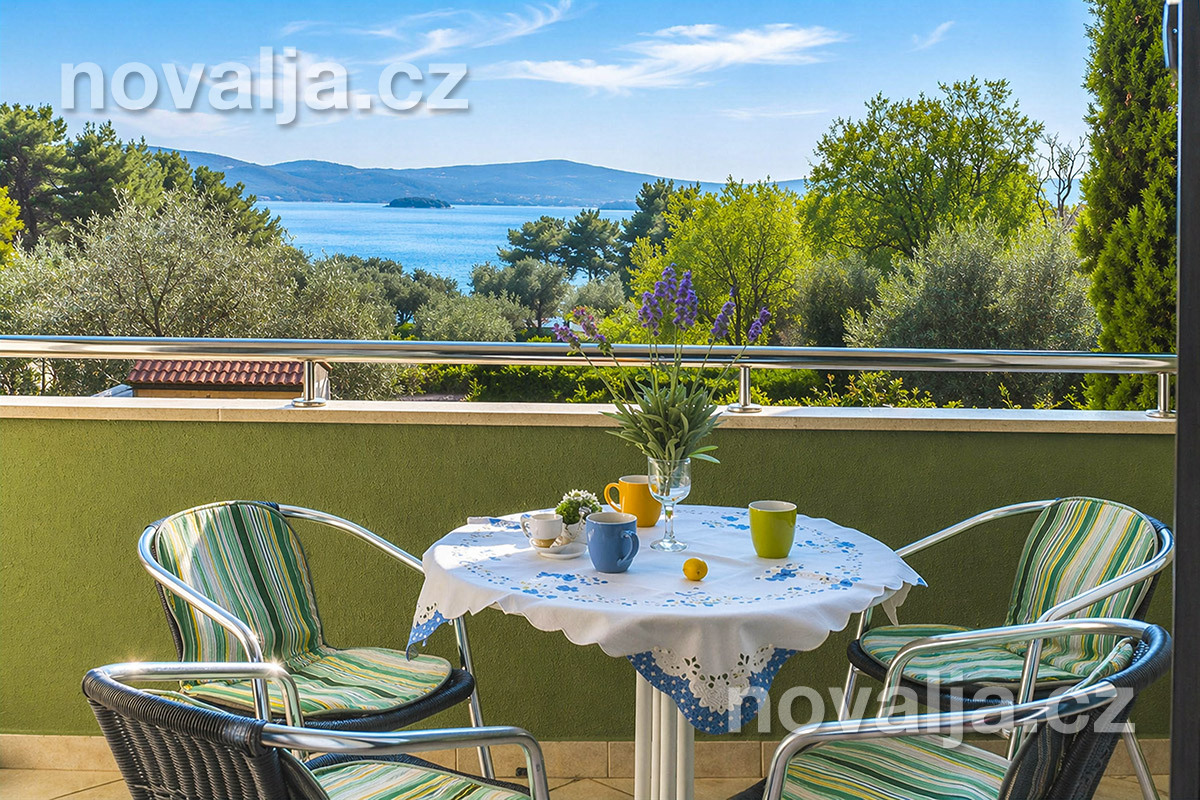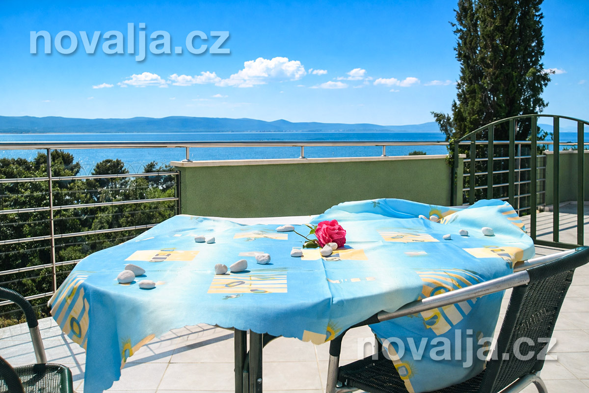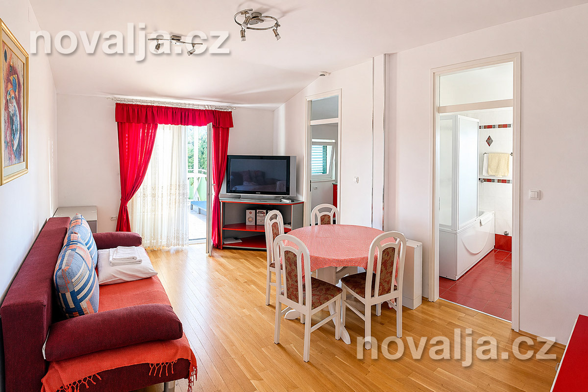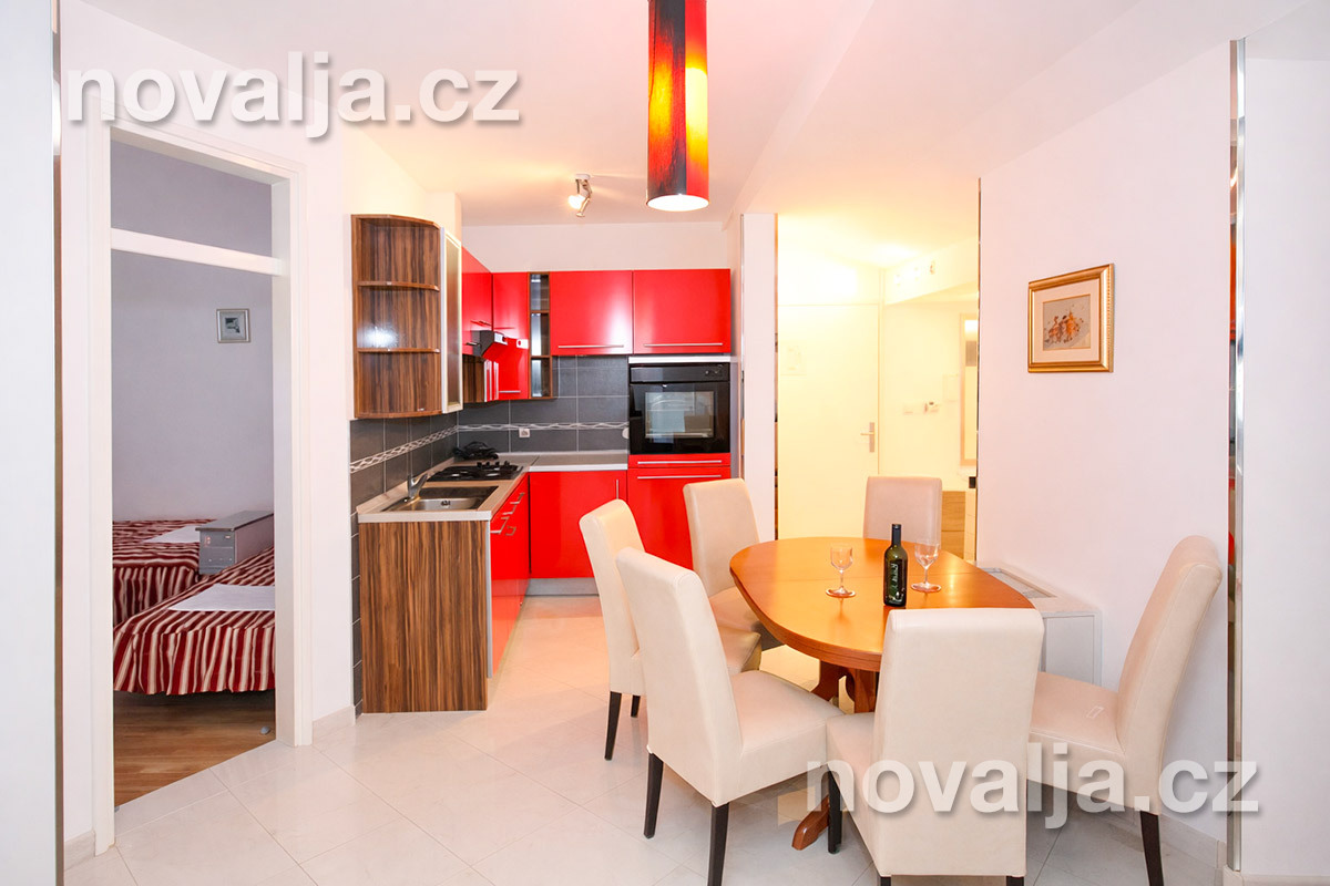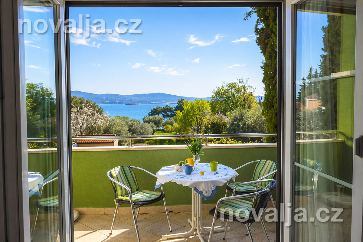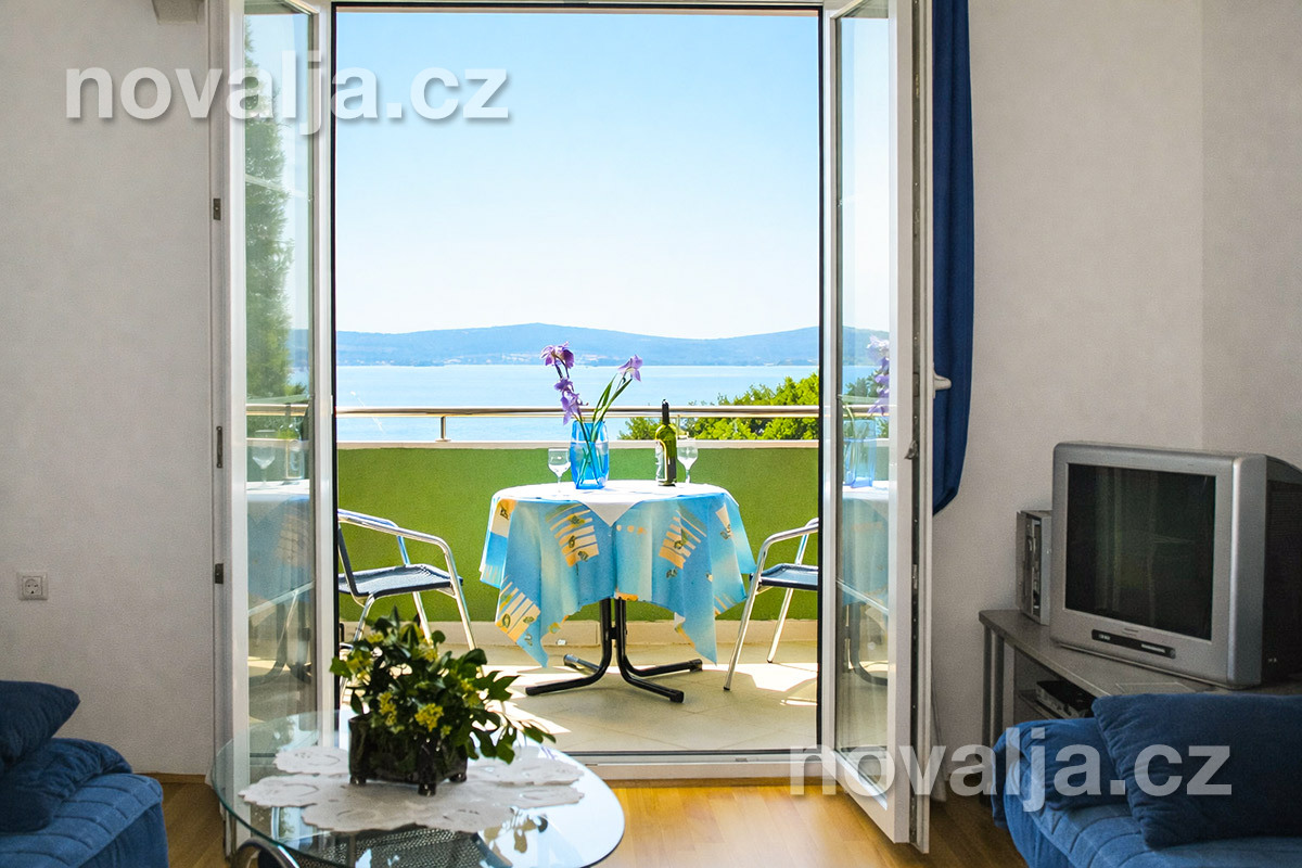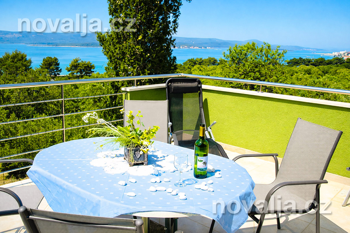 1 ložnice se dvěma lůžky a rozkládacím gaučem pro 1 osobu, vybavená kuchyň (lednička, trouba, myčka, varná konvice) s rozkládacím gaučem a rozkládacím křeslem pro 1–2 osoby, TV+SAT, fén, sociální zařízení s vanou a WC, terasa s krásným výhledem na moře. Klimatizace (v ceně).