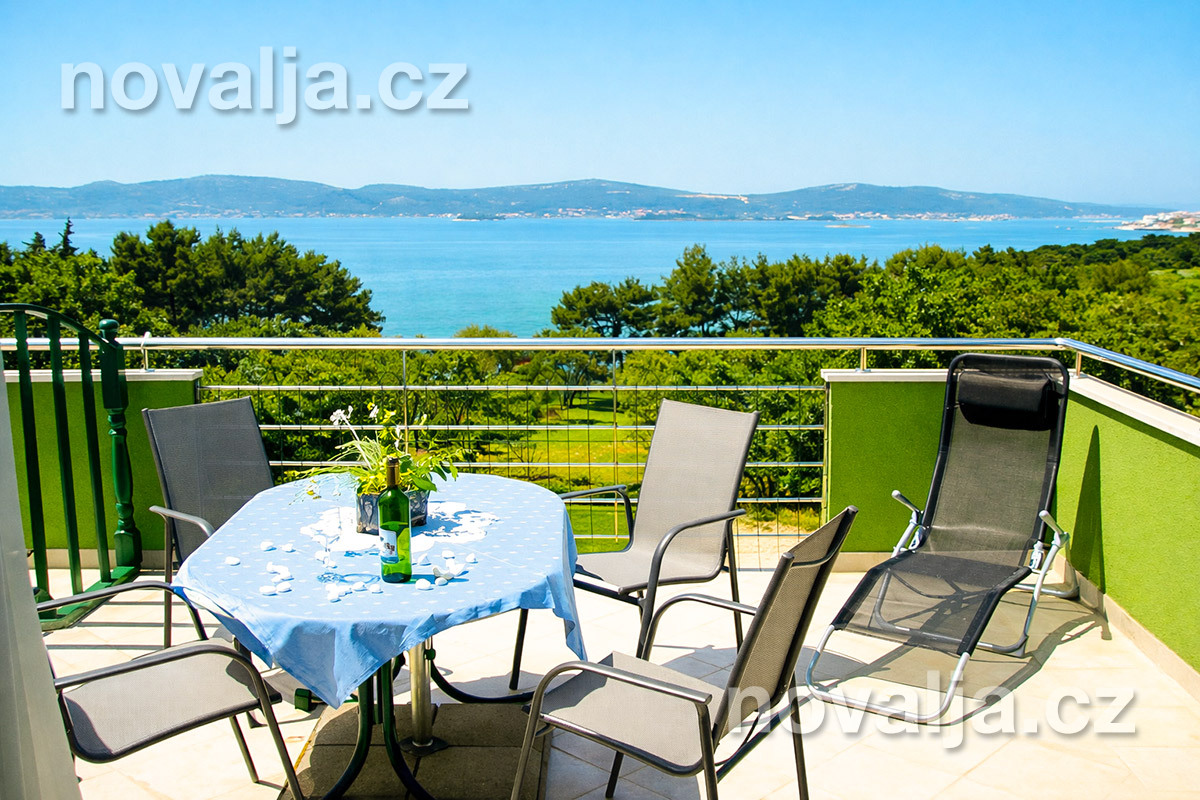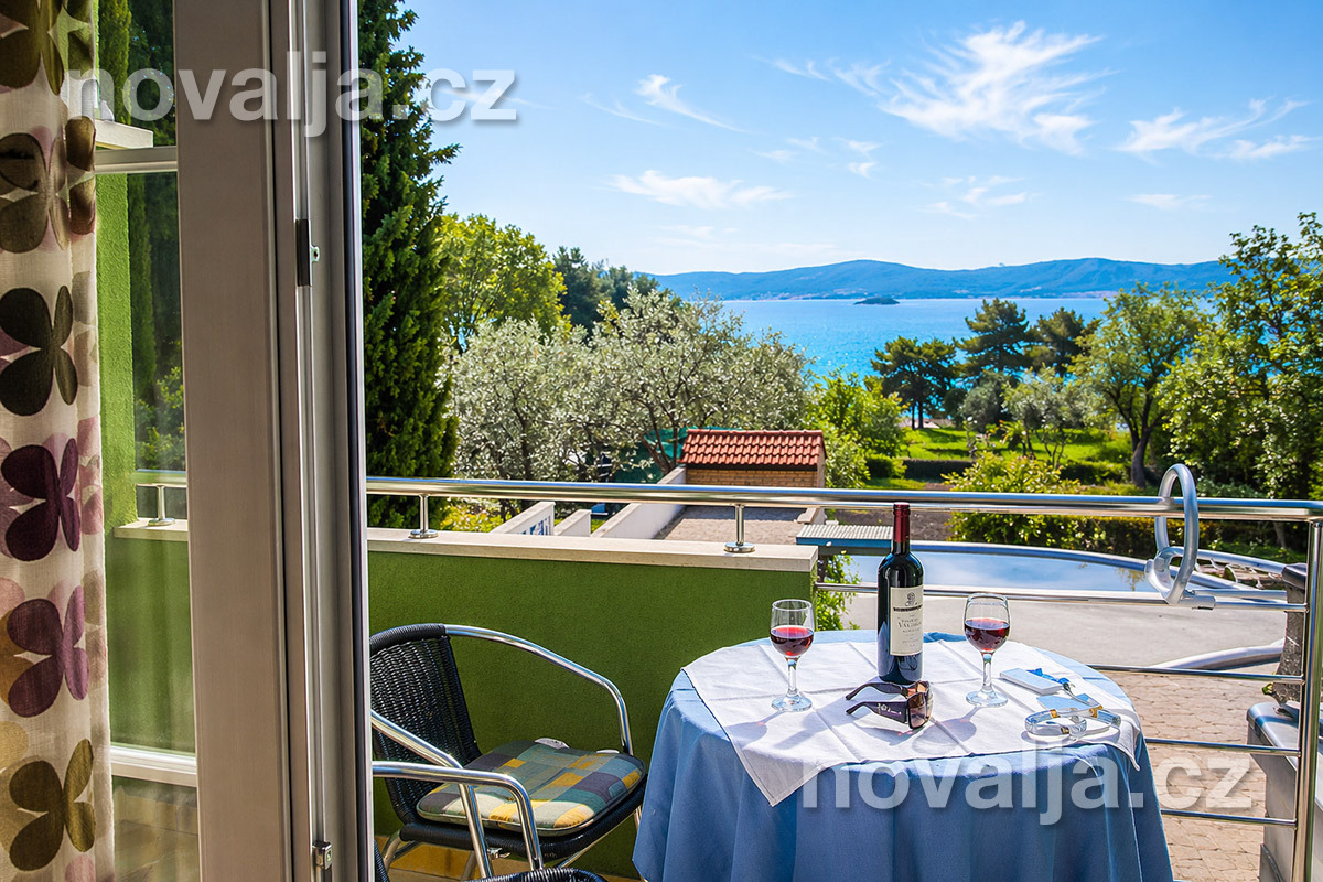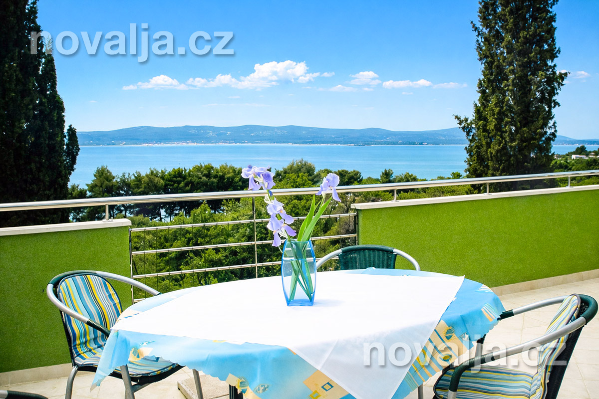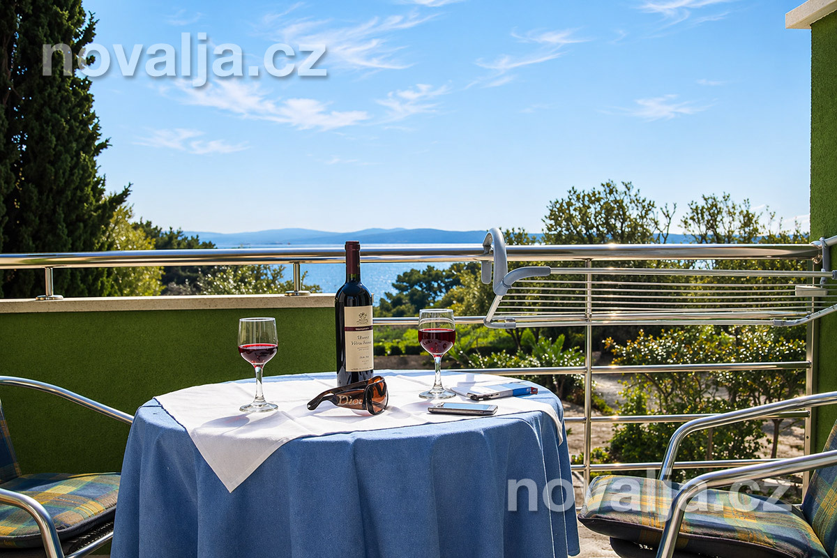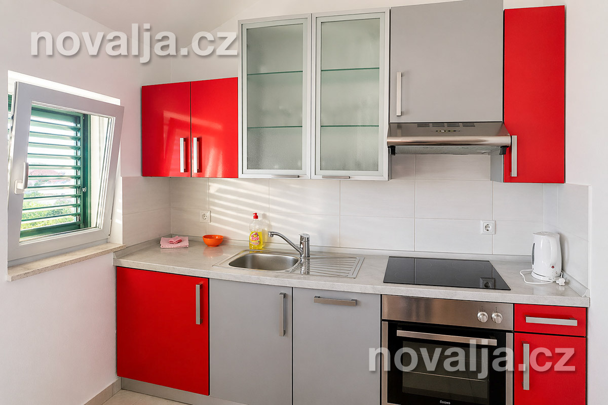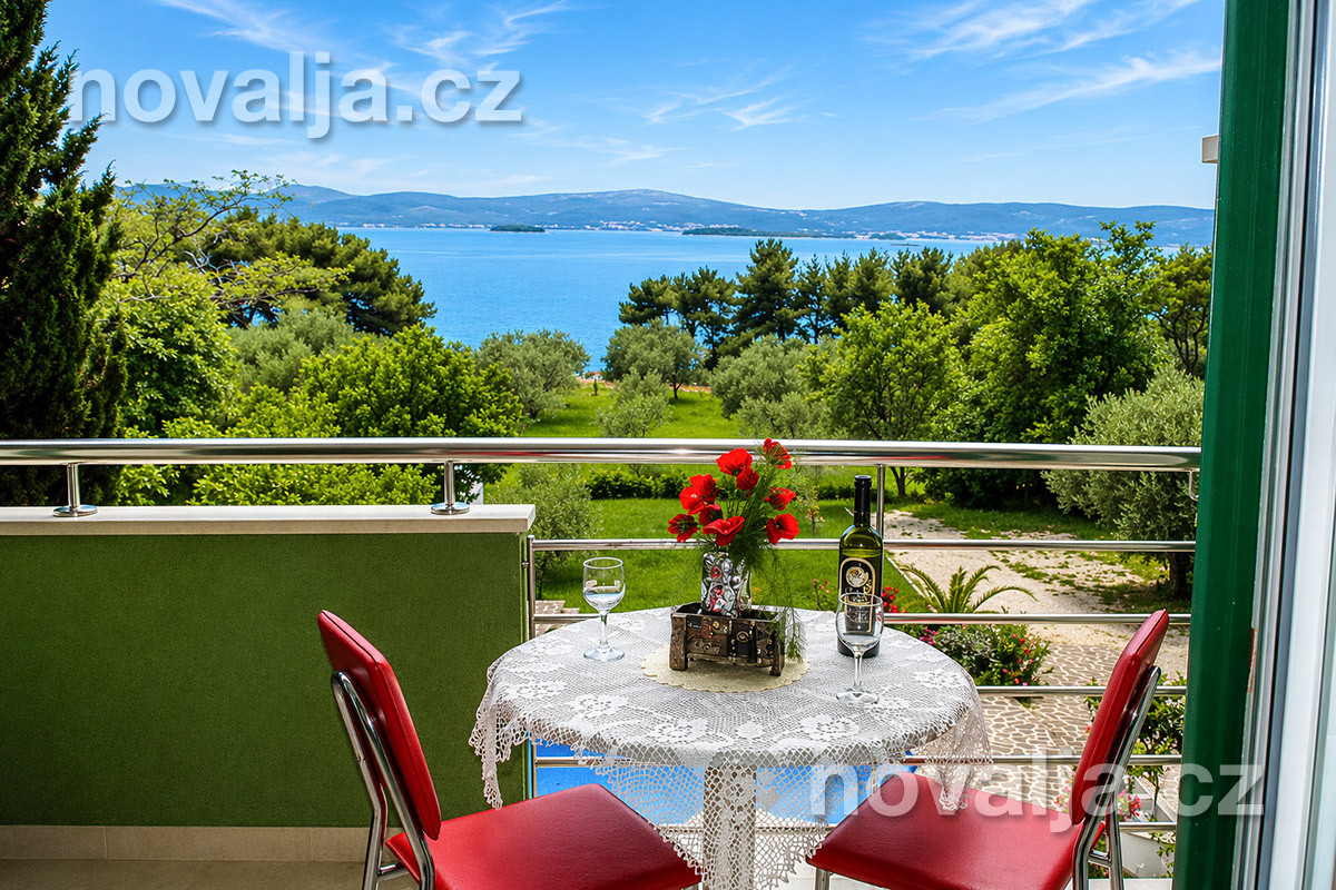 1 ložnice se dvěma lůžky a rozkládacím gaučem pro 1 osobu, vybavená kuchyň (lednička, trouba, myčka, varná konvice) s rozkládacím gaučem a rozkládacím křeslem pro 1–2 osoby, TV+SAT, fén, sociální zařízení s vanou a WC, terasa s krásným výhledem na moře. Klimatizace (v ceně).