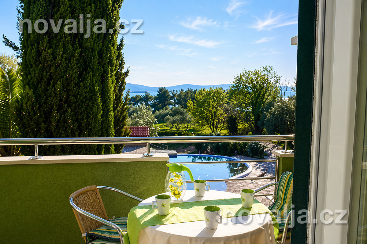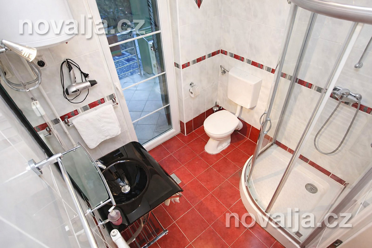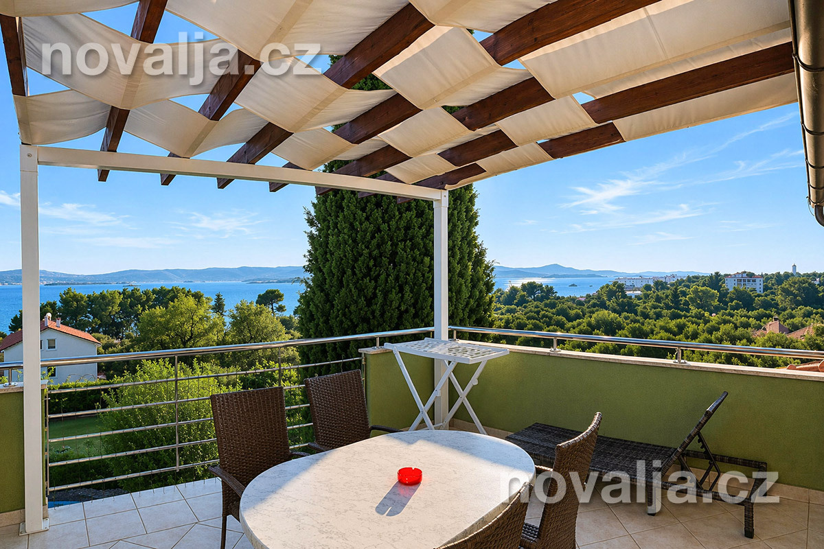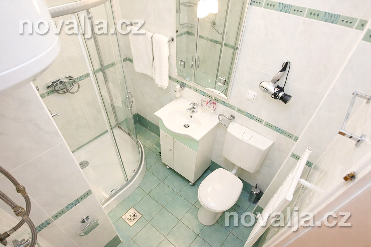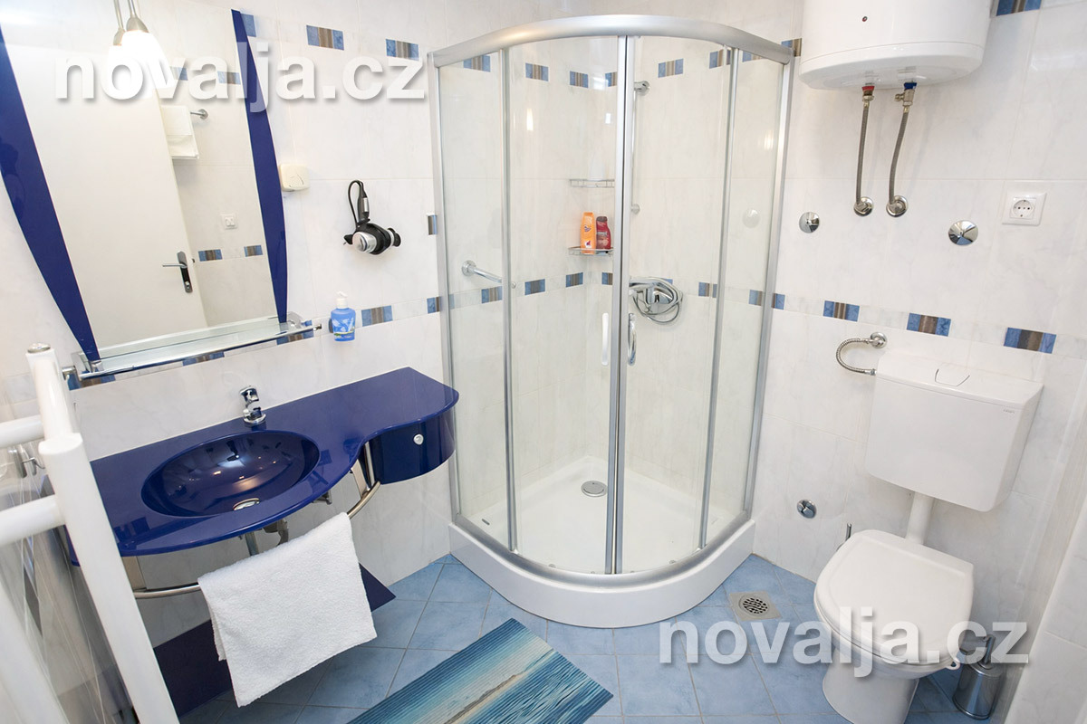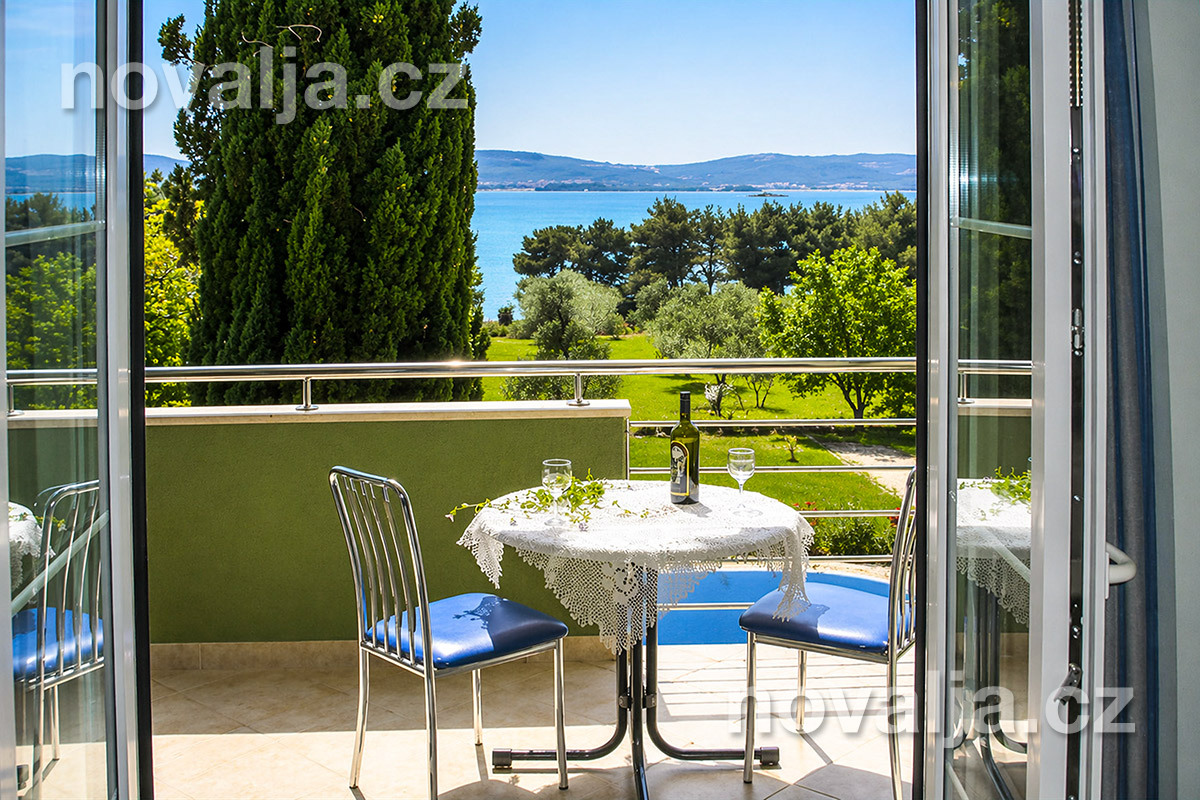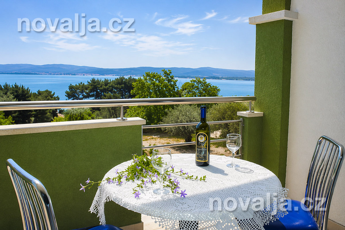 1 ložnice se dvěma lůžky a rozkládacím gaučem pro 1 osobu, vybavená kuchyň (lednička, trouba, myčka, varná konvice) s rozkládacím gaučem a rozkládacím křeslem pro 1–2 osoby, TV+SAT, fén, sociální zařízení s vanou a WC, terasa s krásným výhledem na moře. Klimatizace (v ceně).