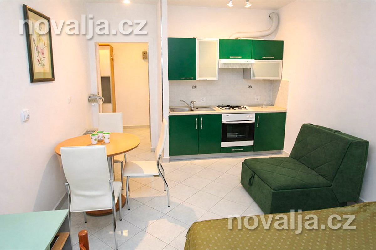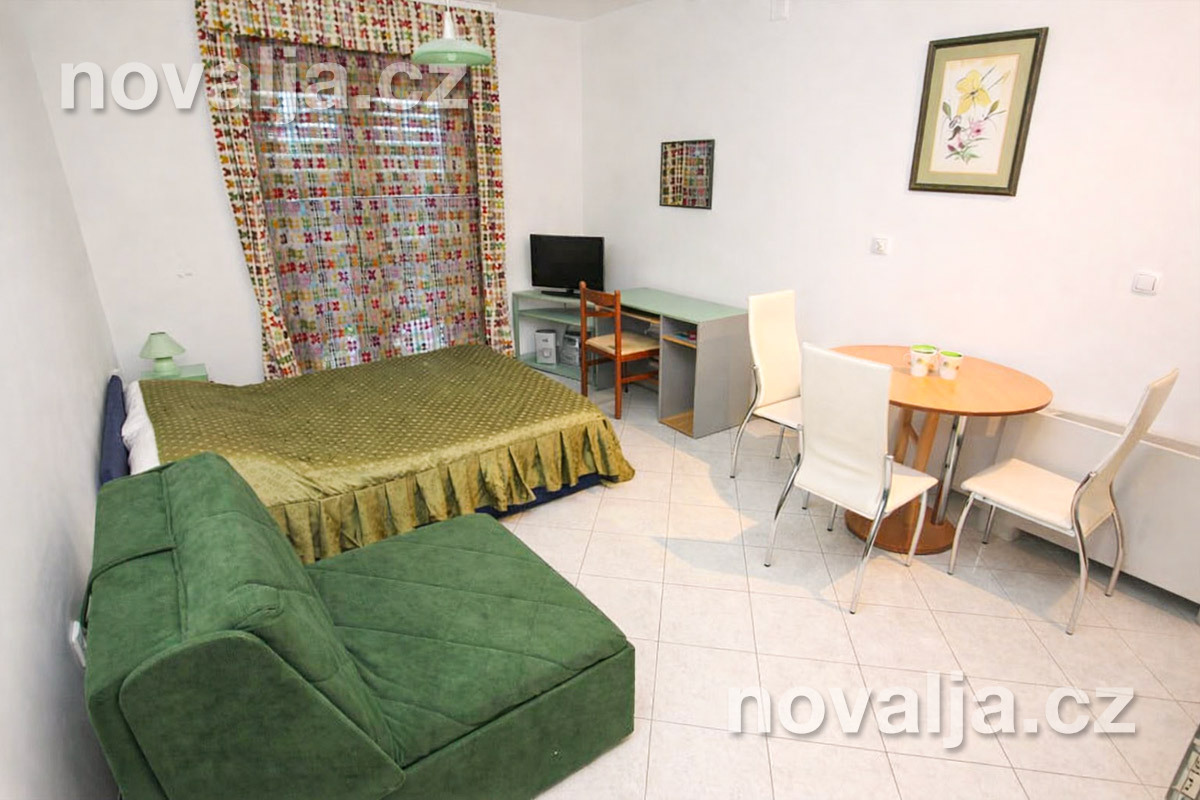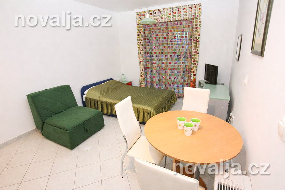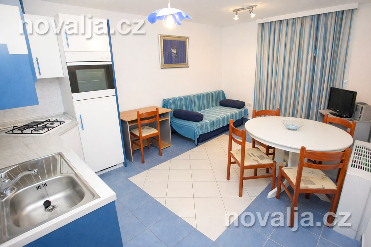 Studio (jedna místnost) se dvěma lůžky a rozkládacím křeslem pro 1 osobu, vybavená kuchyň (lednička, trouba, varná konvice), TV+SAT, fén, sociální zařízení se sprchovým koutem a WC, terasa. Klimatizace (v ceně).
