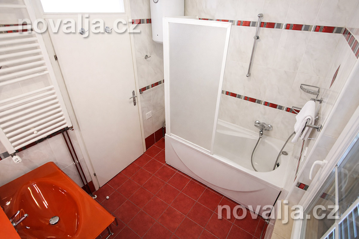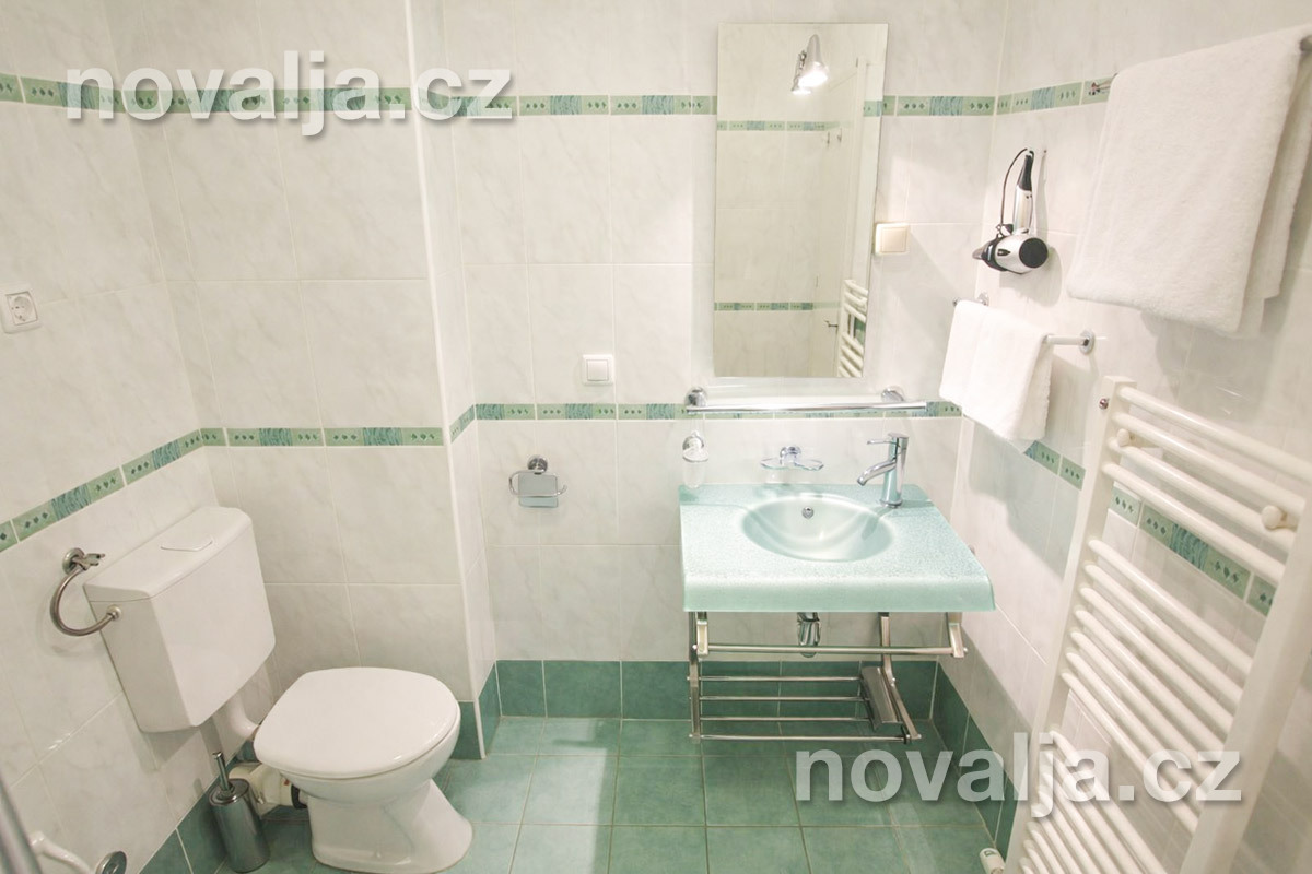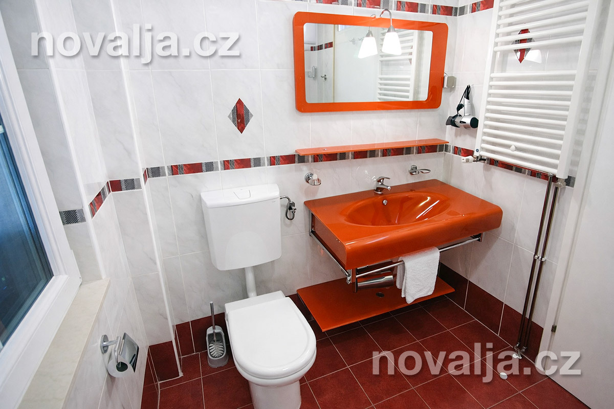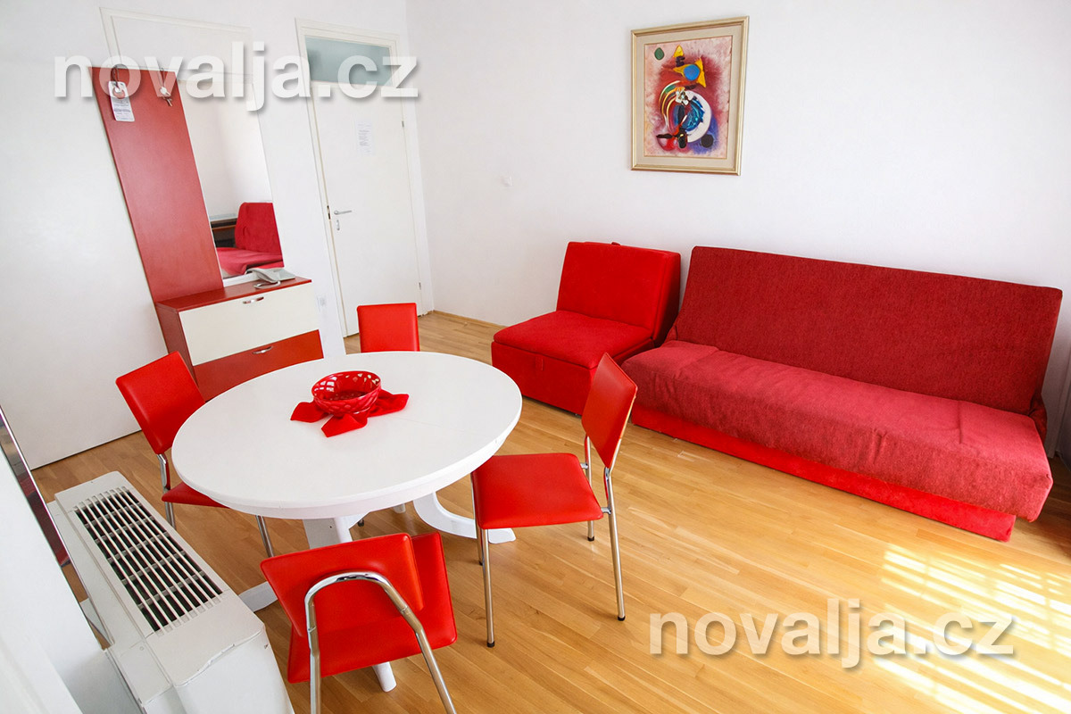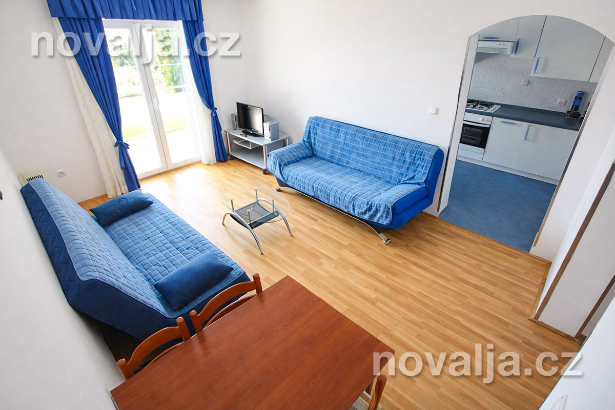 1 ložnice se dvěma lůžky, vybavená kuchyň (lednička, trouba, myčka, varná konvice) se dvěma rozkládacími gauči pro 1–3 osoby, TV+SAT, fén, sociální zařízení s vanou a WC, terasa. Klimatizace (v ceně).
