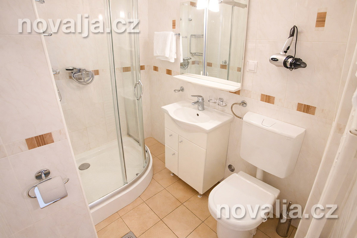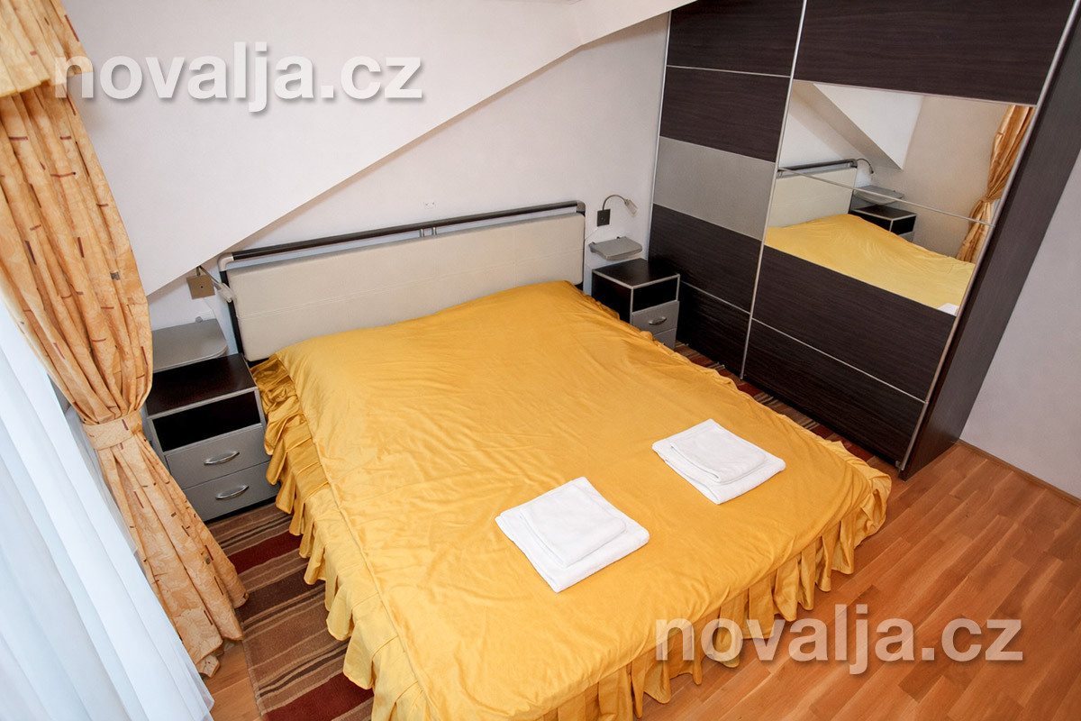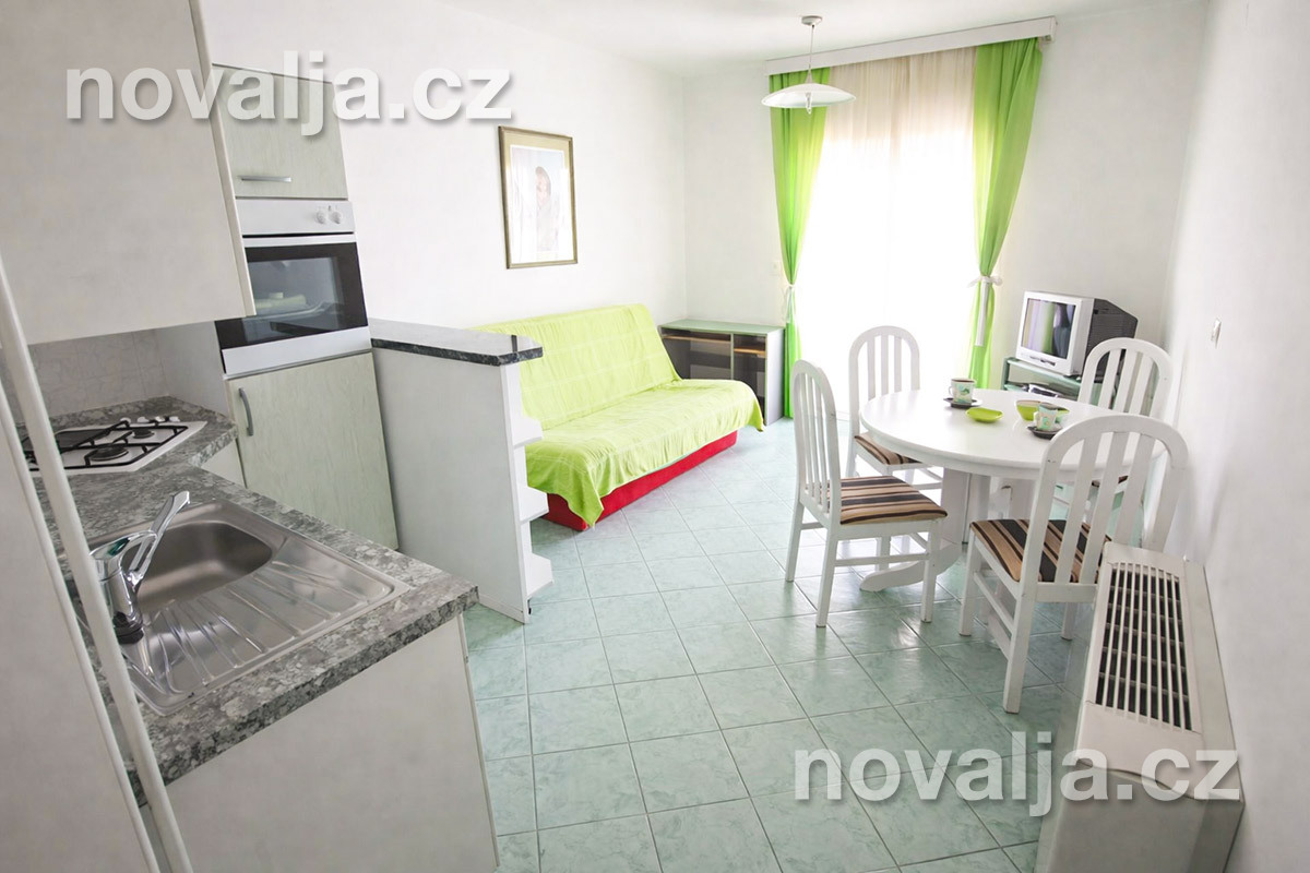 1 ložnice se dvěma lůžky, vybavená kuchyň (lednička, trouba, myčka, varná konvice) se dvěma rozkládacími gauči pro 1–2 osoby, TV+SAT, fén, sociální zařízení se sprchovým koutem a WC, terasa. Klimatizace (v ceně).