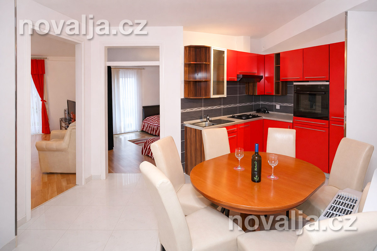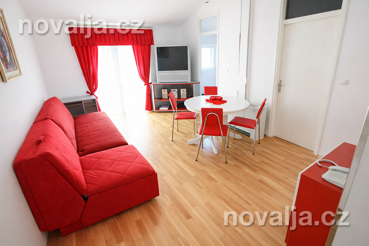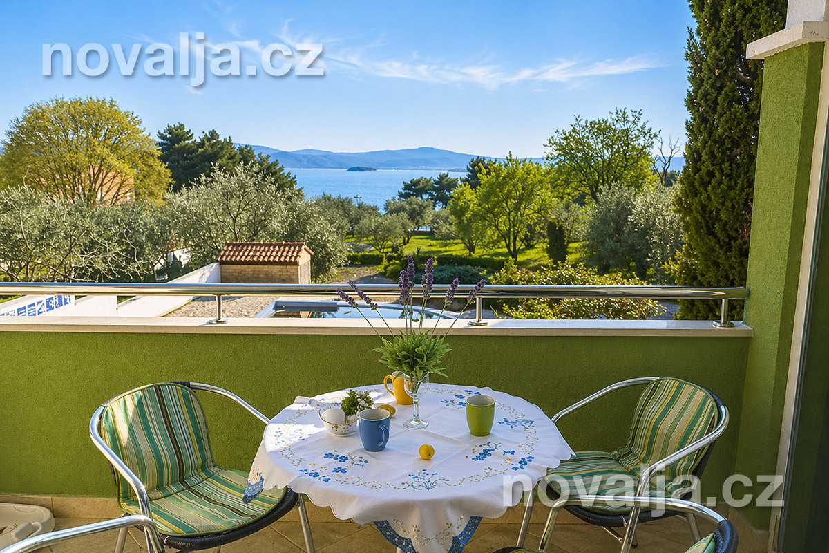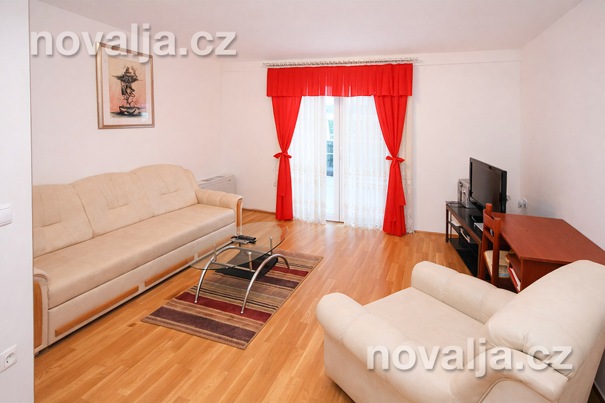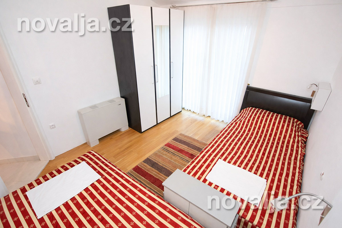 2 ložnice se dvěma lůžky, vybavená kuchyň (lednička, trouba, myčka, varná konvice), samostatný obývák s rozkládacím gaučem pro 1–2 osoby, TV+SAT, fén, sociální zařízení s vanou a WC, další samostatné WC, terasa s krásným výhledem na moře. Klimatizace (v ceně).