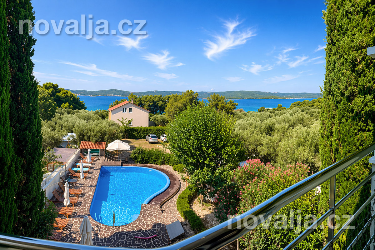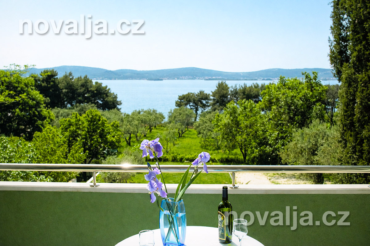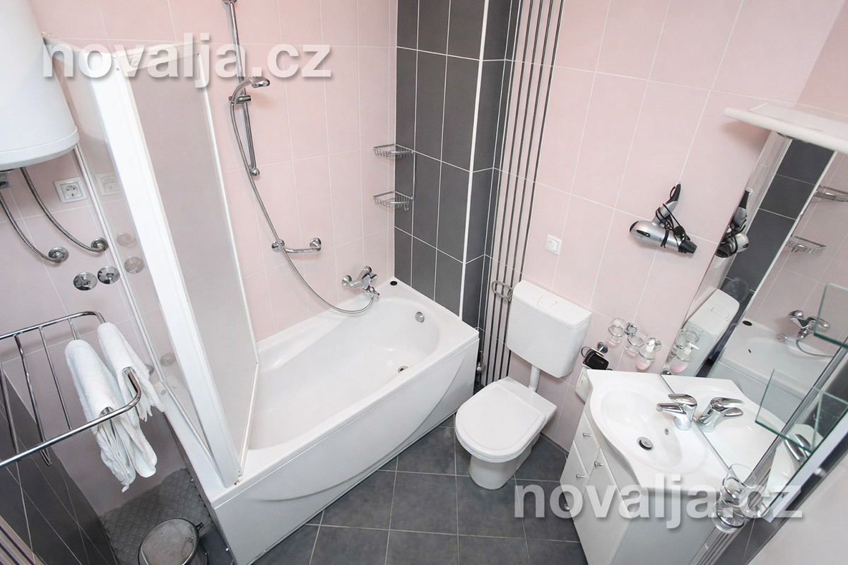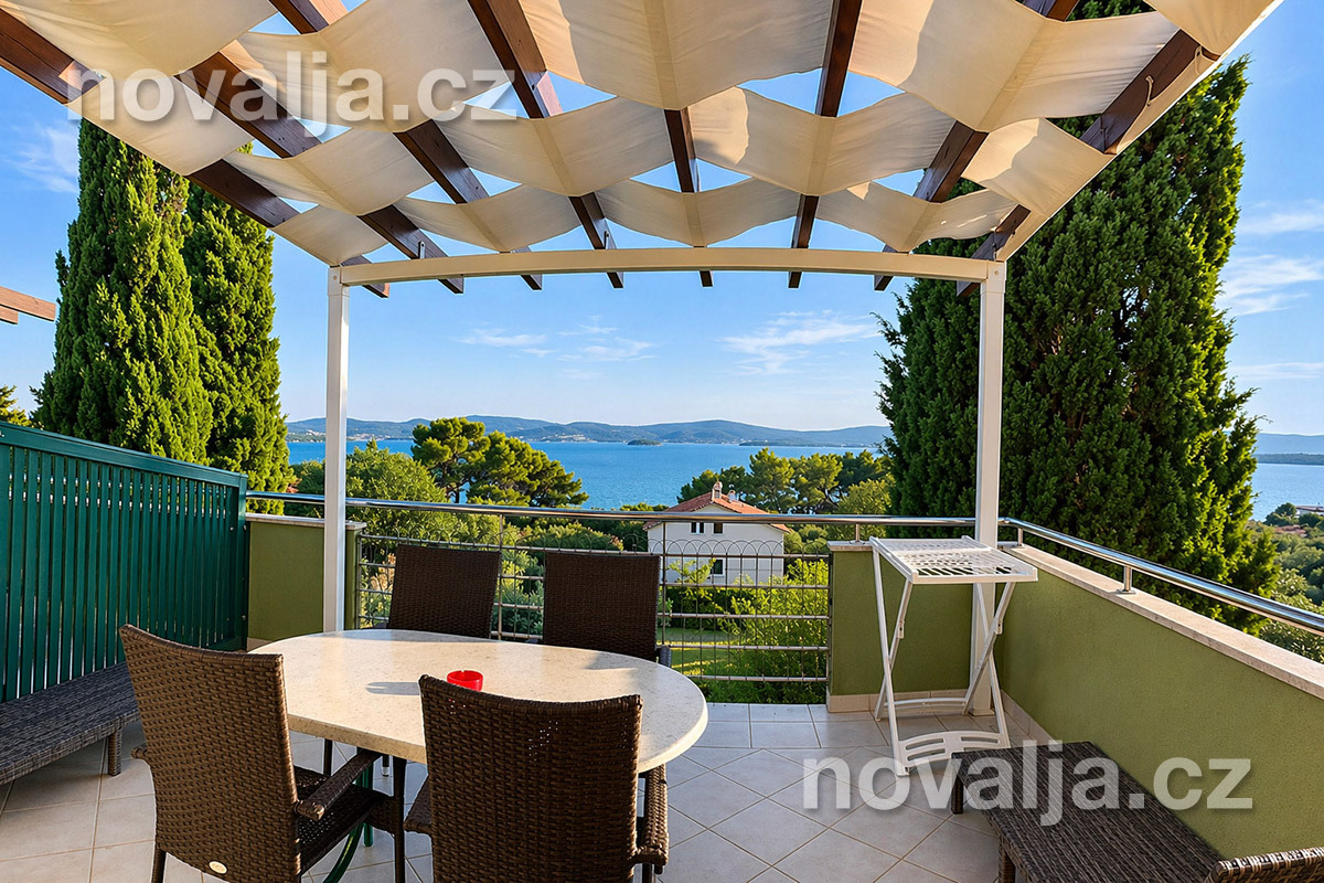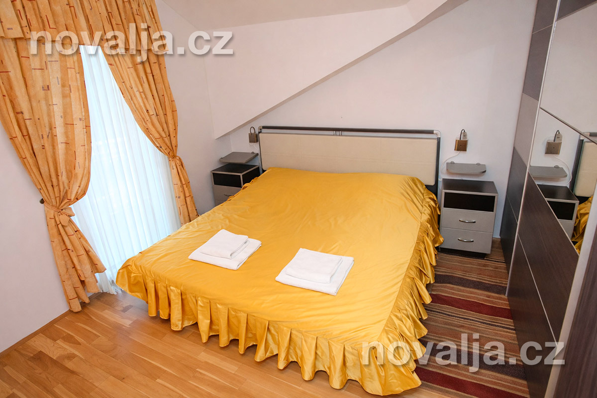 2 ložnice se dvěma lůžky, vybavená kuchyň (lednička, trouba, myčka, varná konvice), samostatný obývák s rozkládacím gaučem pro 1–2 osoby, TV+SAT, fén, sociální zařízení s vanou a WC, další samostatné WC, terasa s krásným výhledem na moře. Klimatizace (v ceně).
