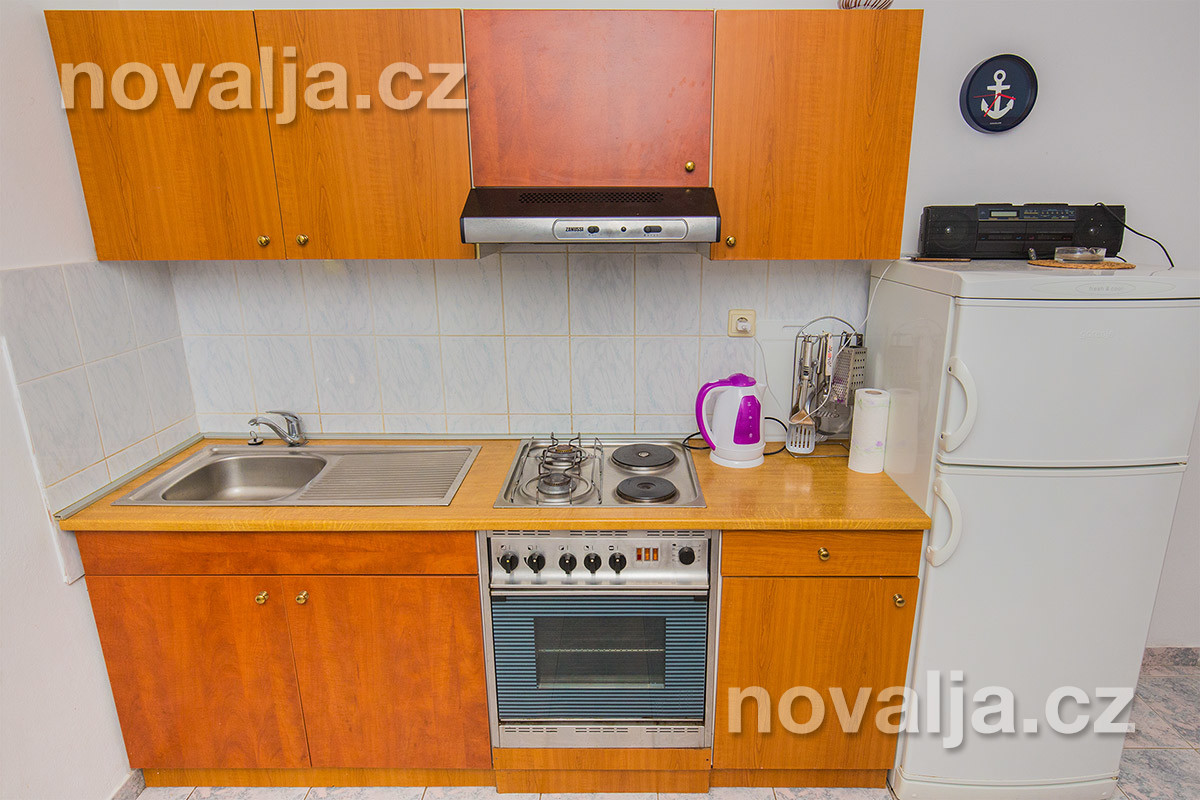 2 ložnice se dvěma lůžky, vybavená kuchyň (lednička, mrazák, trouba, myčka, varná konvice, toaster), TV, sociální zařízení se sprchovým koutem a WC, terasa. Klimatizace v kuchyni (v ceně).