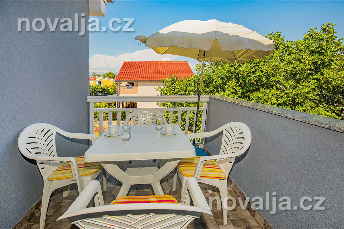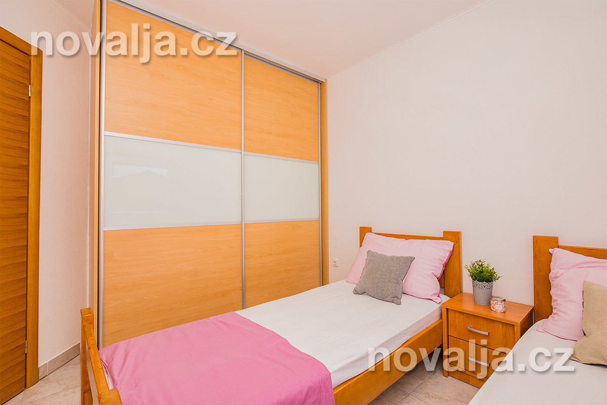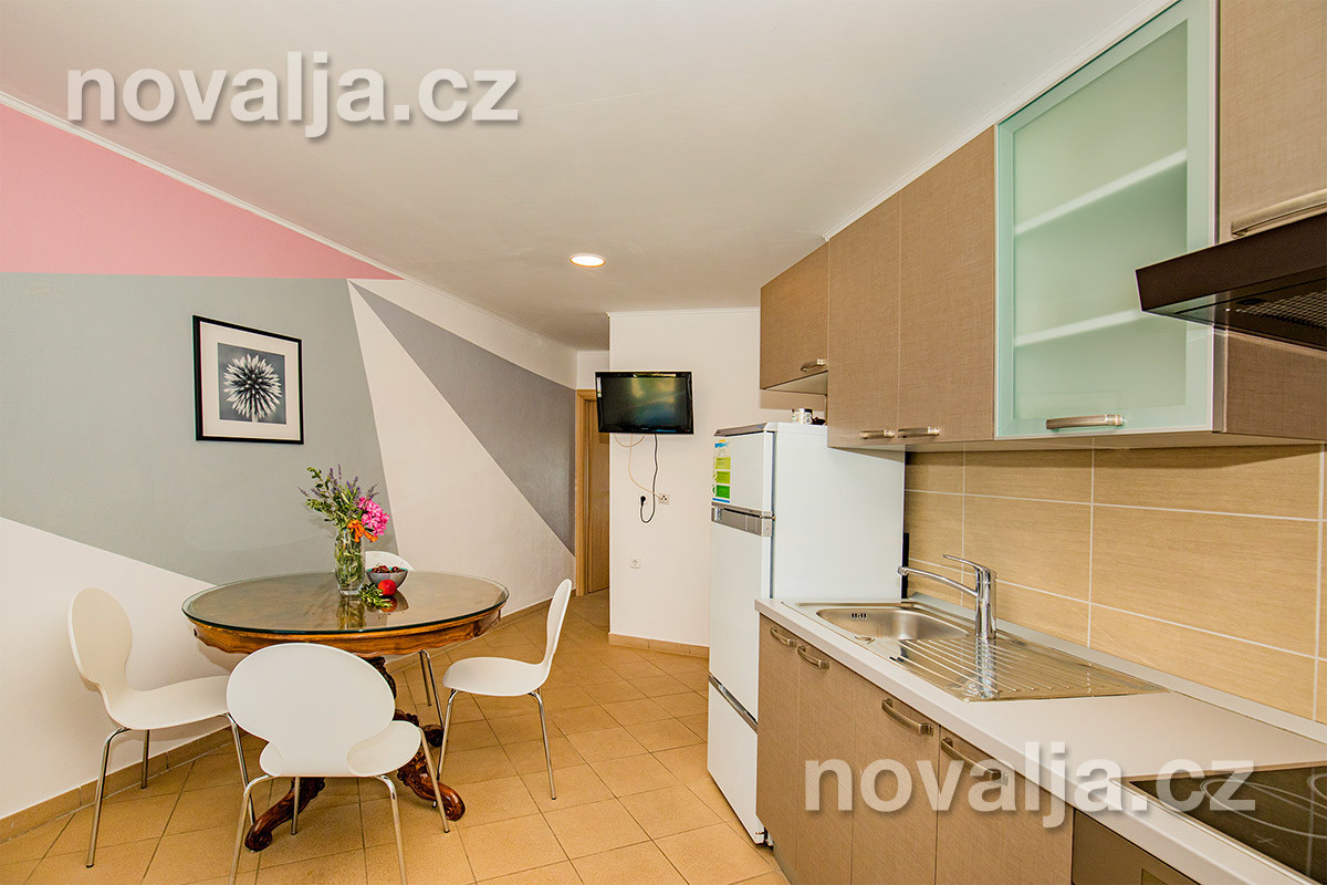 1 ložnice se dvěma lůžky, vybavená kuchyň (lednička, mrazák, trouba, mikrovlnná trouba, varná konvice) s rozkládacím gaučem (200 x 160 cm) pro 1-2 osoby (buď 2 děti do 12 let, nebo jen 1 osoba starší 12 let), TV+SAT, sociální zařízení se sprchovým koutem a WC, balkón se slunečníkem (částečný výhled na moře). Klimatizace v kuchyni (v ceně).