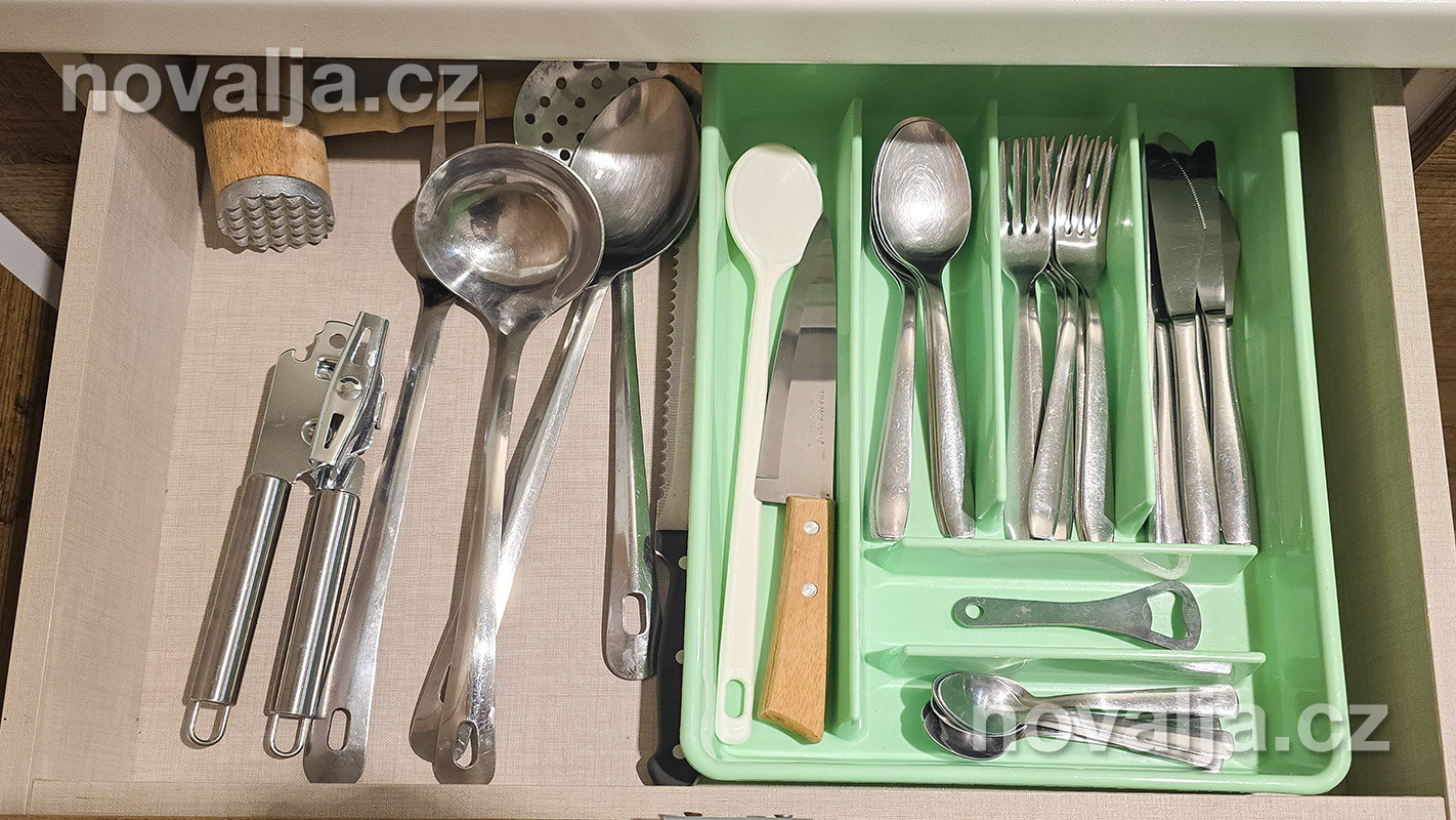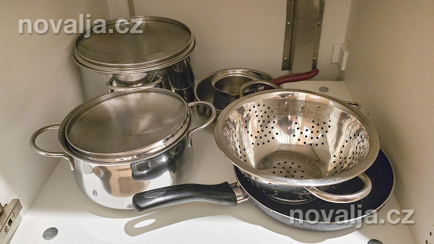 3 ložnice - v jedné ložnici manželská postel (160 x 200 cm), ve zbývajících dvou vždy jedno samostatné lůžko (80 x 200 cm), vybavená kuchyň (varná deska, lednička, mrazák, myčka, mikrovlnná trouba, varná konvice, kávovar) s rozkládacím gaučem pro 1 osobu, TV+SAT, 2x koupelna se sprchovým koutem a WC, fén, stíněná terasa se zahradním nábytkem a dvěma lehátky. Klimatizace v kuchyni (v ceně). Rozloha 34 m² + terasa 26 m².