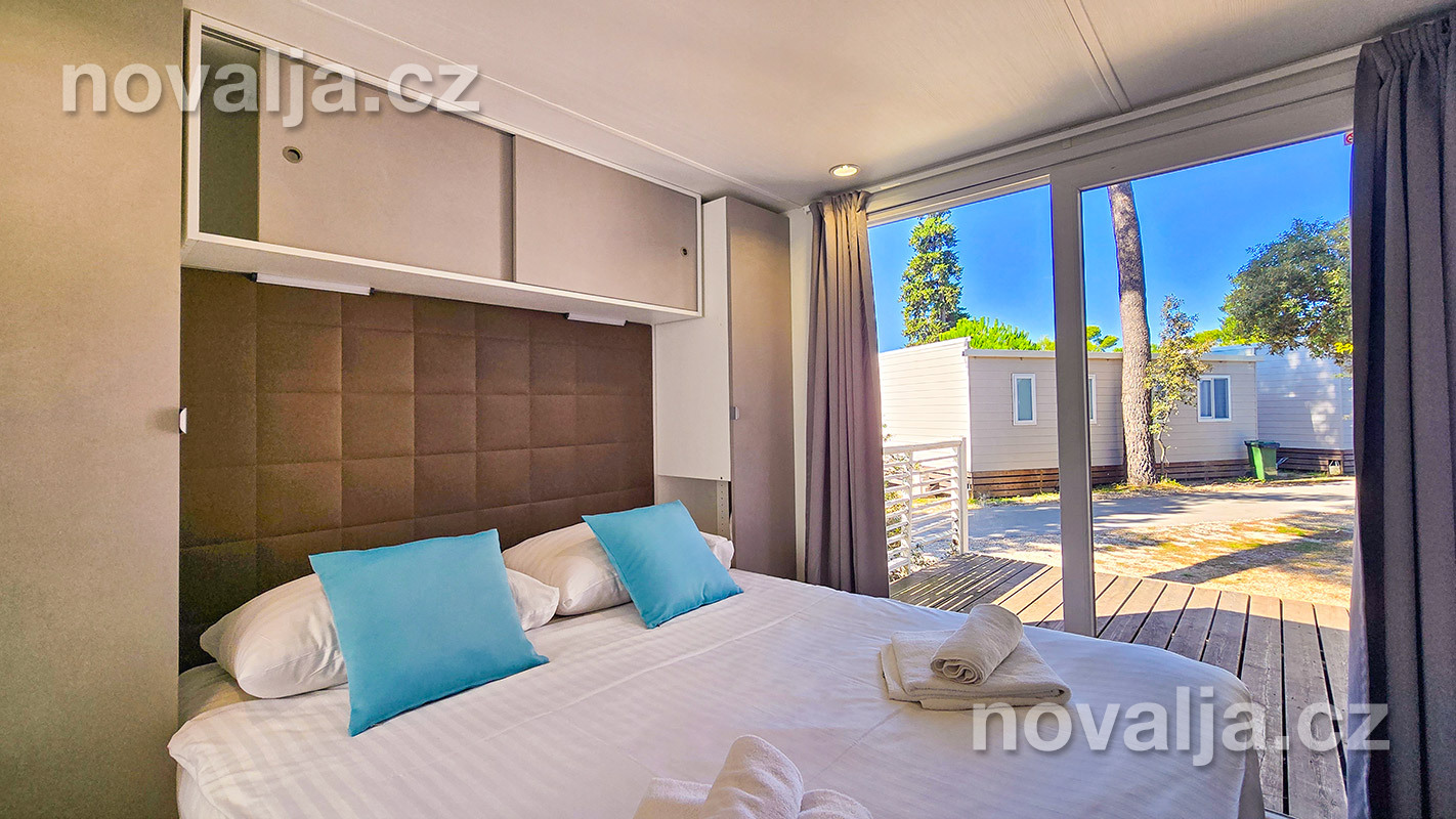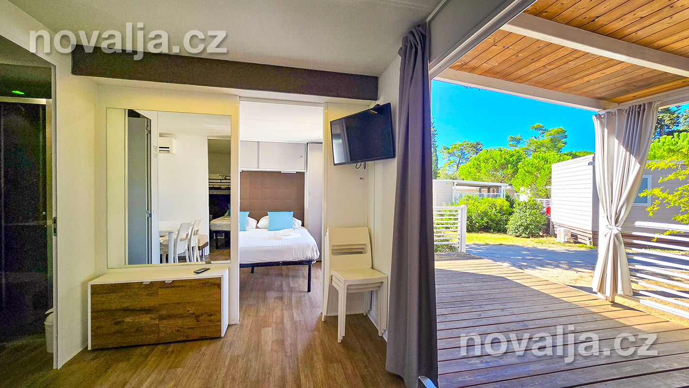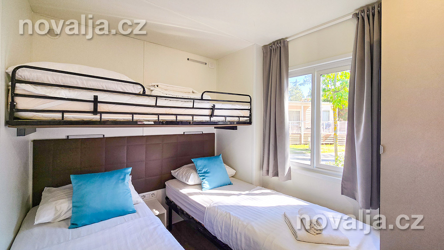 2 ložnice - v jedné ložnici manželská postel, ve druhé tři samostatná lůžka (třetí lůžko na palandě), vybavená kuchyň (varná deska, lednička, mrazák, mikrovlnná trouba, varná konvice, kávovar) s rozkládacím gaučem pro 1 osobu, TV+SAT, 2x koupelna se sprchovým koutem a WC, stíněná terasa se zahradním nábytkem a dvěma lehátky. Klimatizace v kuchyni (v ceně). Rozloha 34 m² + terasa 26 m².