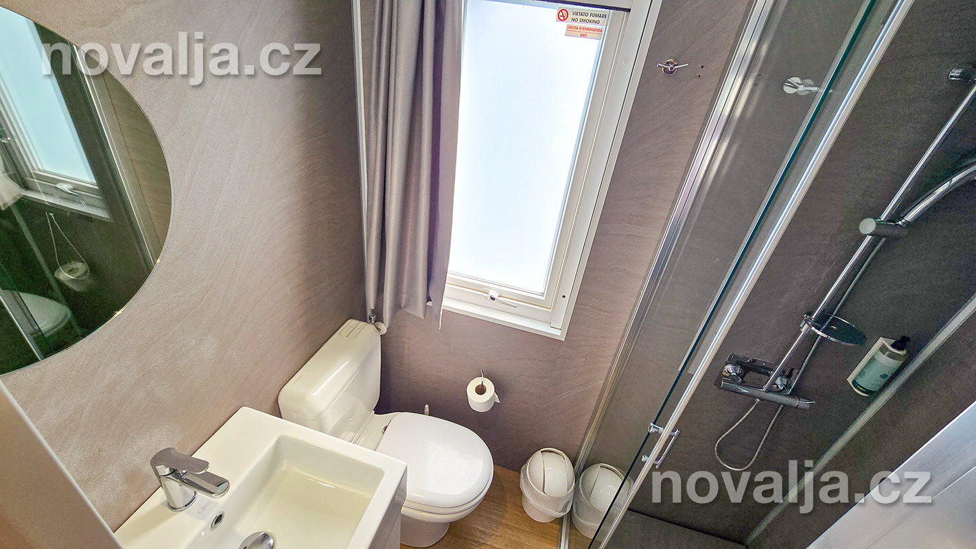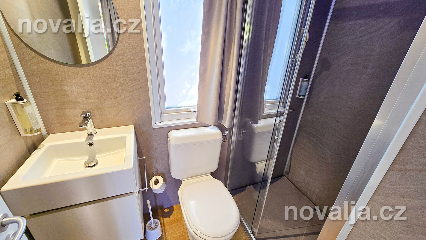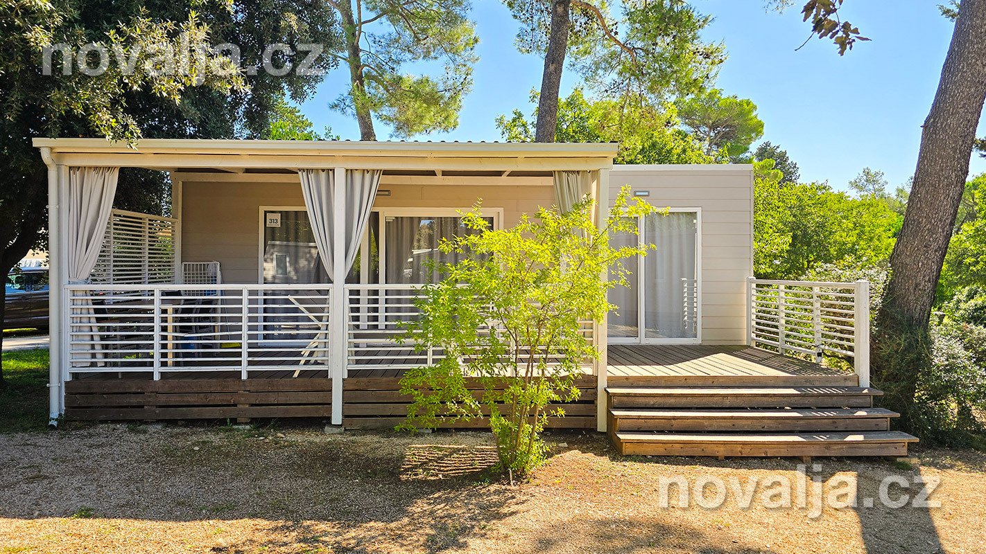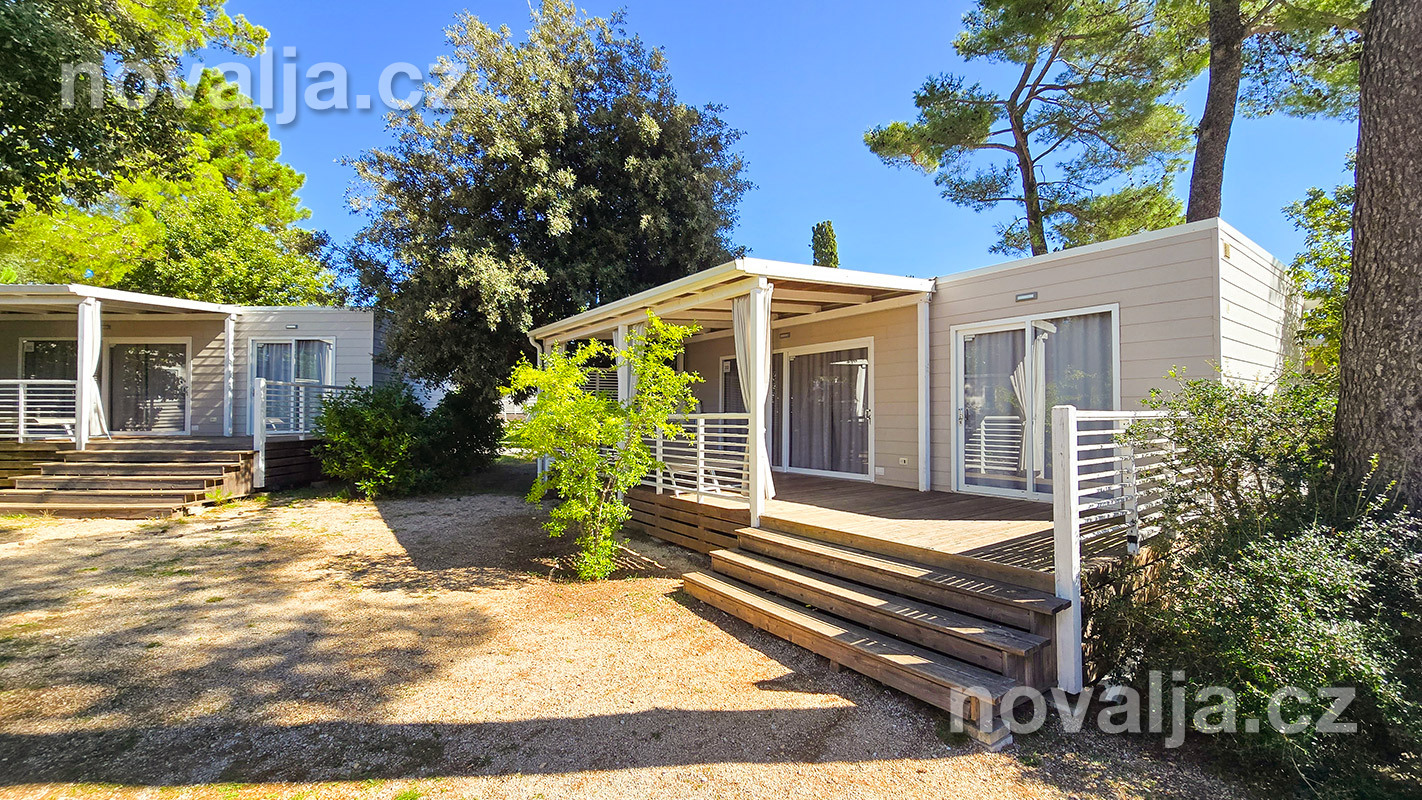 2 ložnice - v jedné ložnici manželská postel, ve druhé tři samostatná lůžka (třetí lůžko na palandě), vybavená kuchyň (varná deska, lednička, mrazák, mikrovlnná trouba, varná konvice, kávovar) s rozkládacím gaučem pro 1 osobu, TV+SAT, 2x koupelna se sprchovým koutem a WC, stíněná terasa se zahradním nábytkem a dvěma lehátky. Klimatizace v kuchyni (v ceně). Rozloha 34 m² + terasa 26 m².
